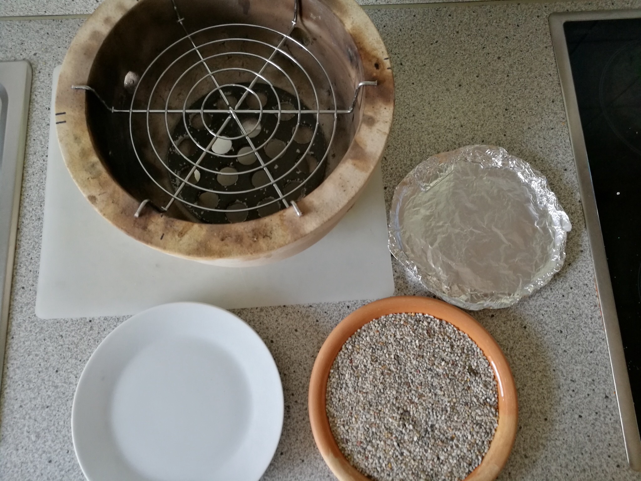 Als Deflektor hab ich den Untersetzer mit Kies drin verwendet. Als Fettpfanne etwas Alufolie drauf.