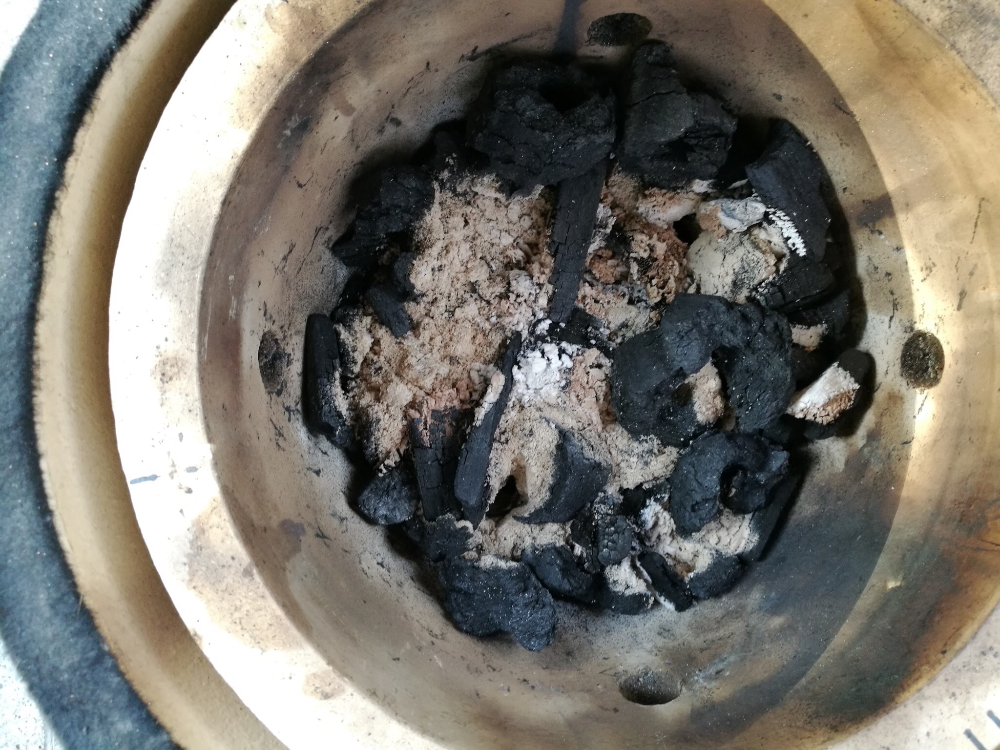 Bei inzwischen wieder 160 Grad und gut 7h Gesamtzeit habe ich dann aufgrund der nächtlichen Zeit von 2:30 Uhr und dem Gemecker von Göga das Experiment abgebrochen. Alle Luftschieber zu, um dann heute morgen zu checken, was da unter dem Deflektor übrig geblieben ist an Kohle.