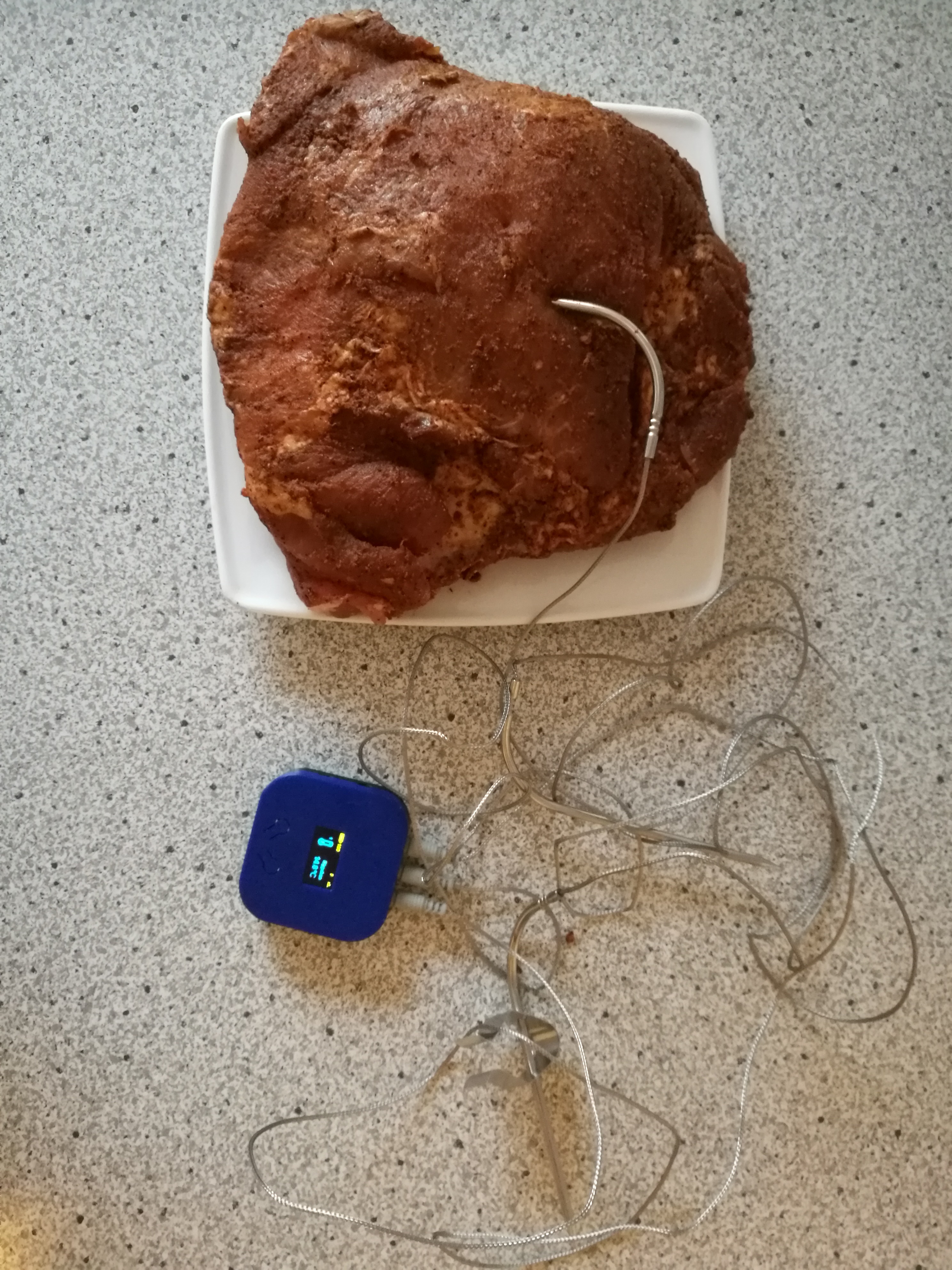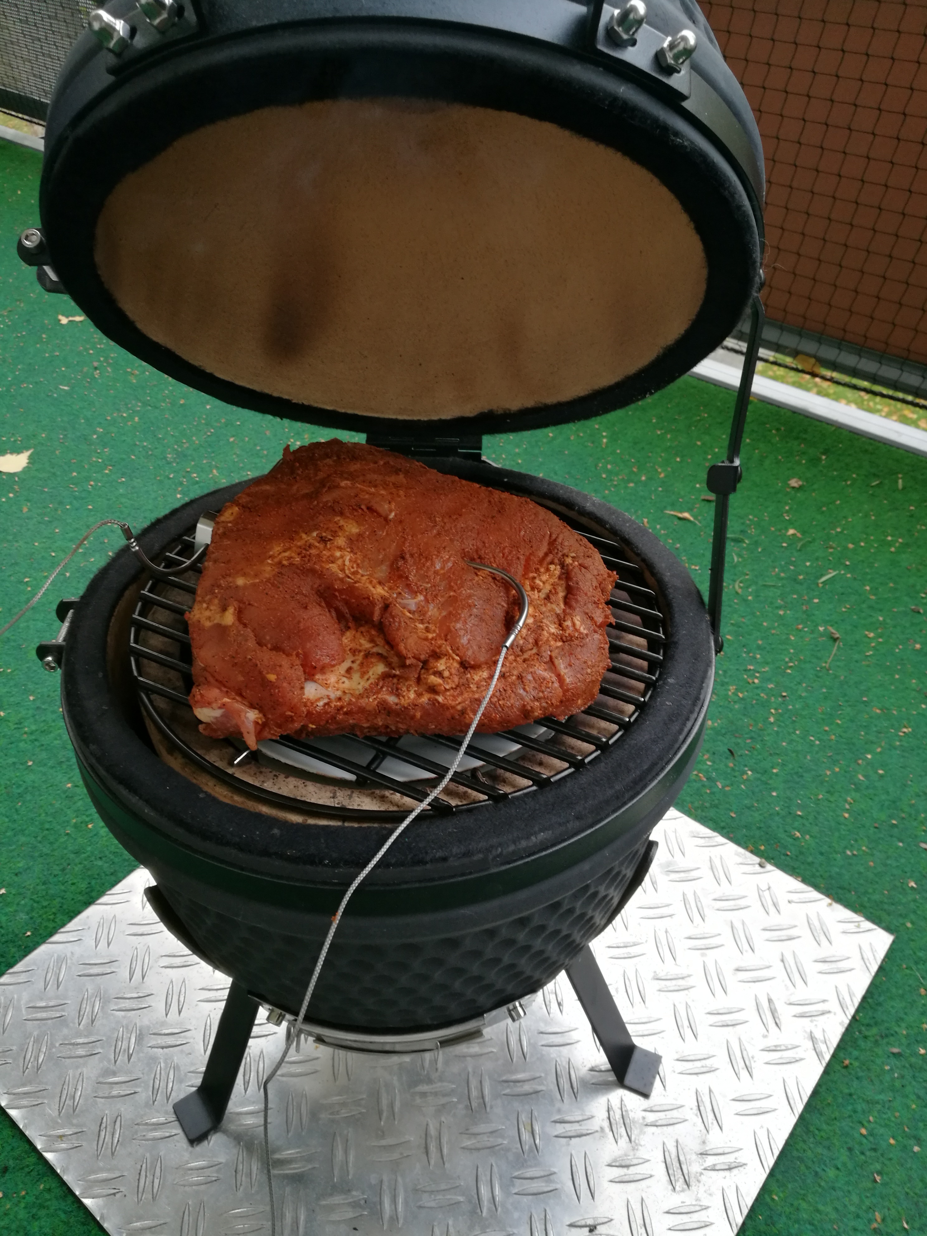 Bisher habe ich das Ei nur mit Profagus Sommerhit gefüttert. Da ist aber bei 120-130 Grad nach gut 6h Schluß. Da ich zum DOpfen und zum etwas längeren Flachgrillen fast ausschließlich Greekfire nutze, lag es nah einen Test damit im Ei durchzuführen. Die Greekfire sollen ja angeblich keine Bindemittel enthalten, also alles gut. Habe schon vereinzelt gelesen, das es wohl nicht ganz einfach ist, die Temperatur mit dem Zeugs zu halten. Habe mir Bruchstücke von den Greekfire aussortiert und die noch mal in dünne Ringe zerbrochen und 1:1 mit Profagus Holzkohle gemischt. Feuertopf etwa bis Höhe Luftlöcher damit gefüllt. Oben noch eine Handvoll Profagus zum Zünden drauf. Mit einem Gasbrenner daraus ein Glutnest erzeugt, Deckel zu, unten und das Deckelventil ganz auf. Bei 150 Grad Deckelthermometer Deflektor und Rost rein. Temp. Fühler einen auf dem Rost und den anderen Durch das Deckelventil in den Garraum gehangen. Nun unten bis auf zwei Lochreihen und oben 60% geschlossen. Temp stieg relativ schnell an, binnen einer Stunde auf gut 160 Grad