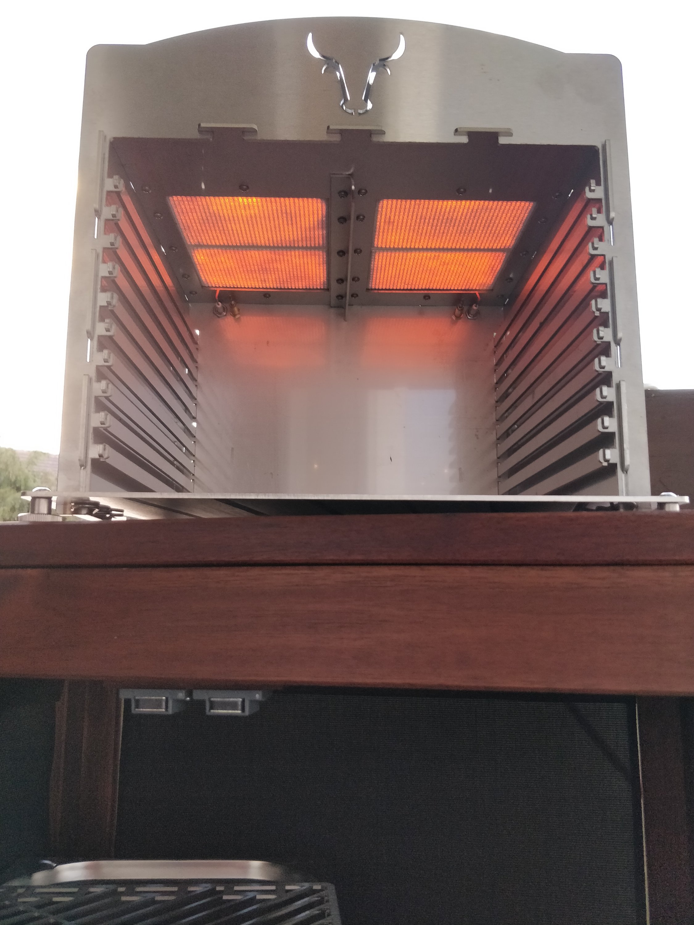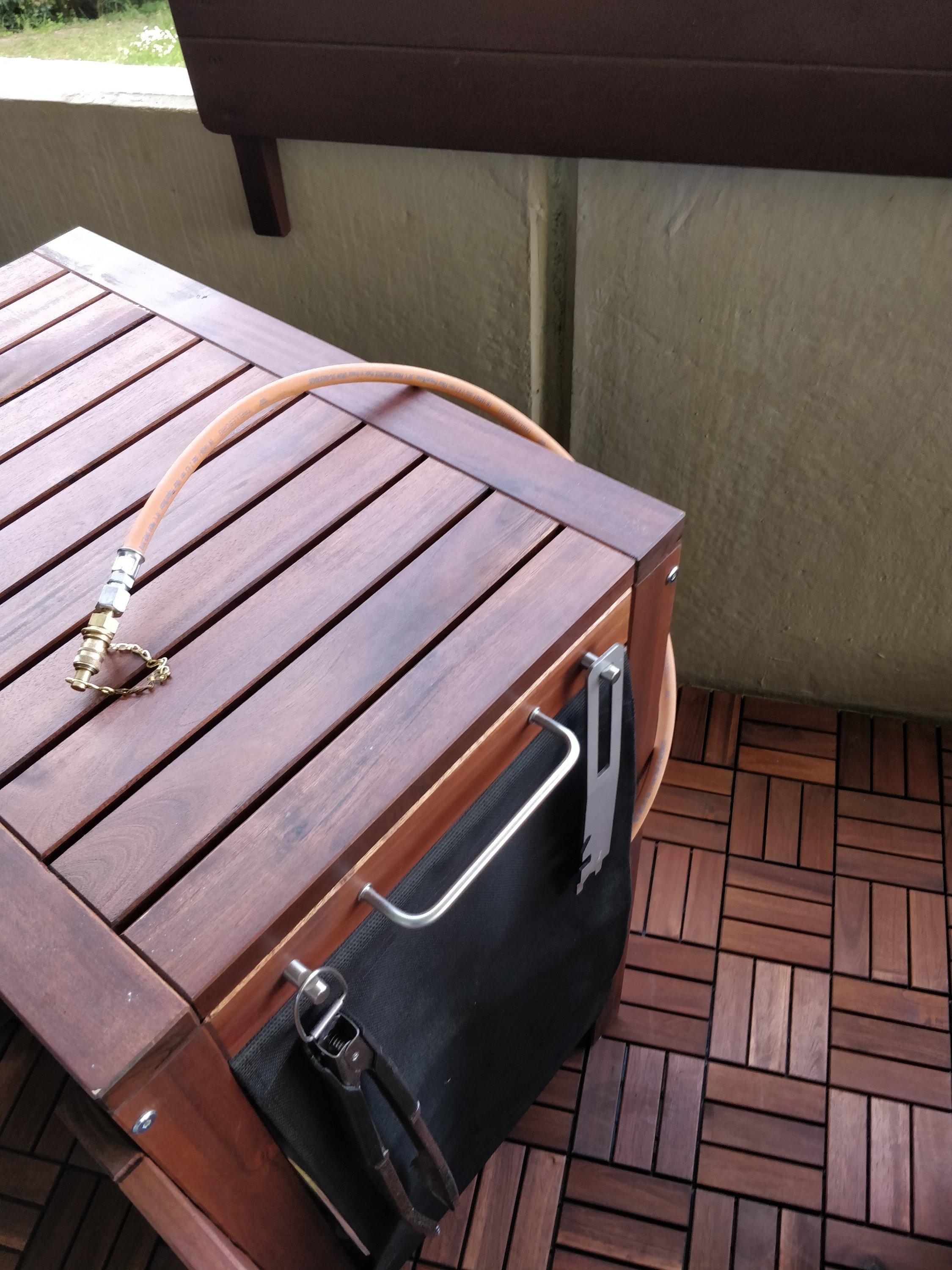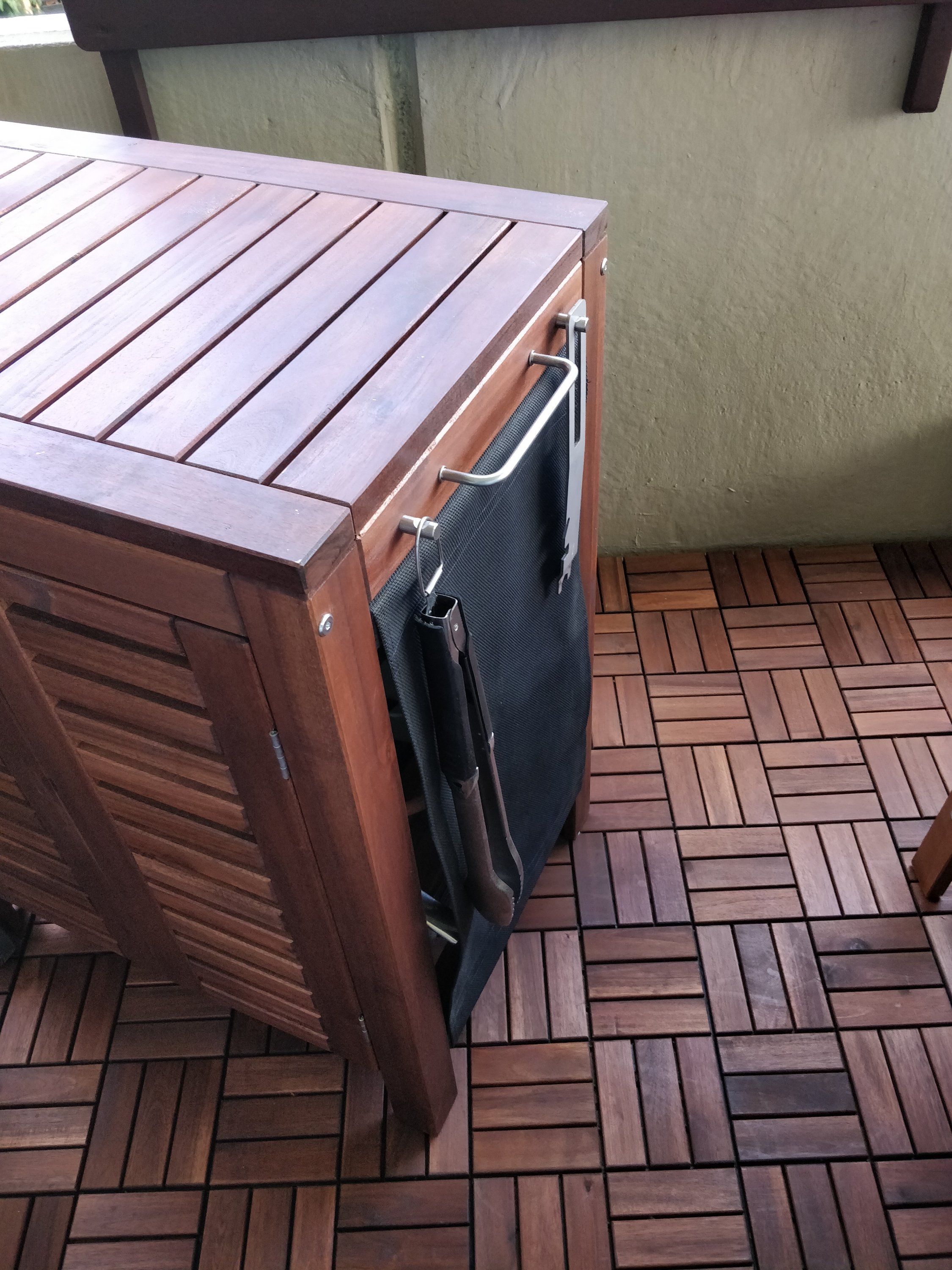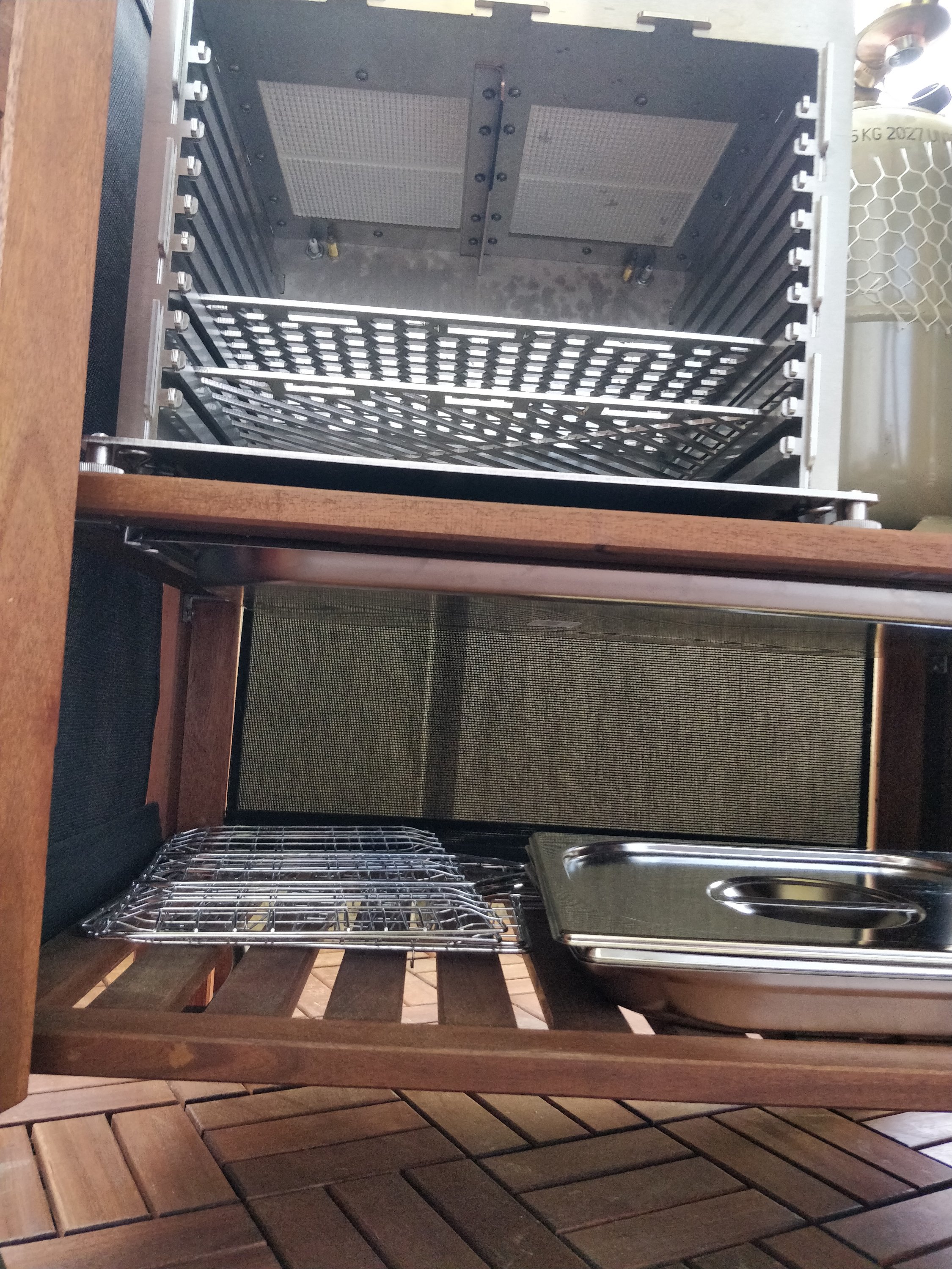 unter den Einlegeboden habe ich mit 2 kleinen Alu-U-Schienen aus dem Baumarkt einen Einschub für die 1/1 GN Schale geschaffen, damit ich diese immer einzeln herausnehmen kann ohne etwas anderes in die Hand nehmen zu müssen. Dann noch 2 Edelstahl Haken aus dem Baumarkt neben den Griff für Grillzange und Rostheber.