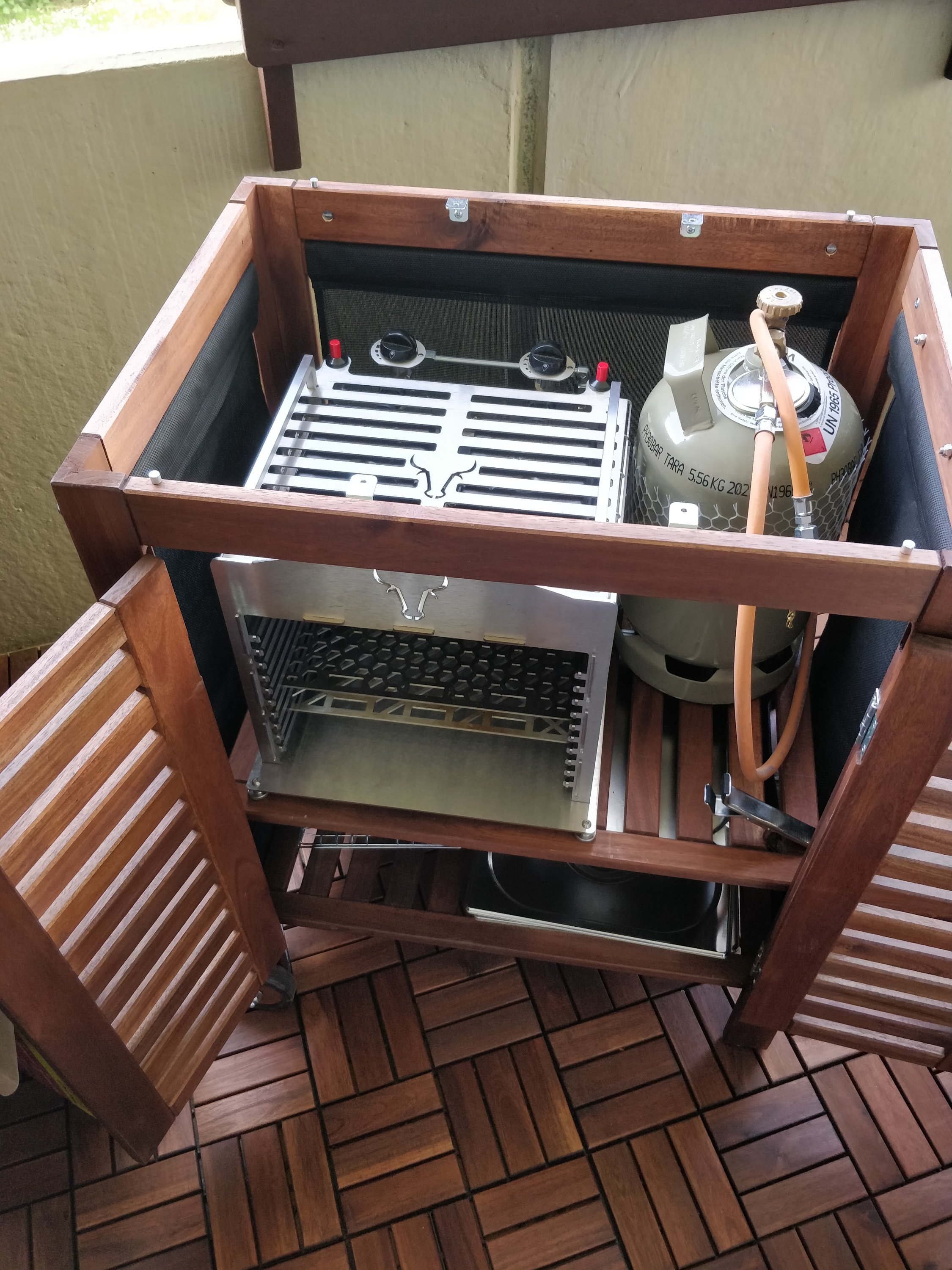 Ich habe mir im Grunde nur den Einlegeboden nach unten versetzt damit auch die Gasflasche im Schrank Platz nehmen kann.