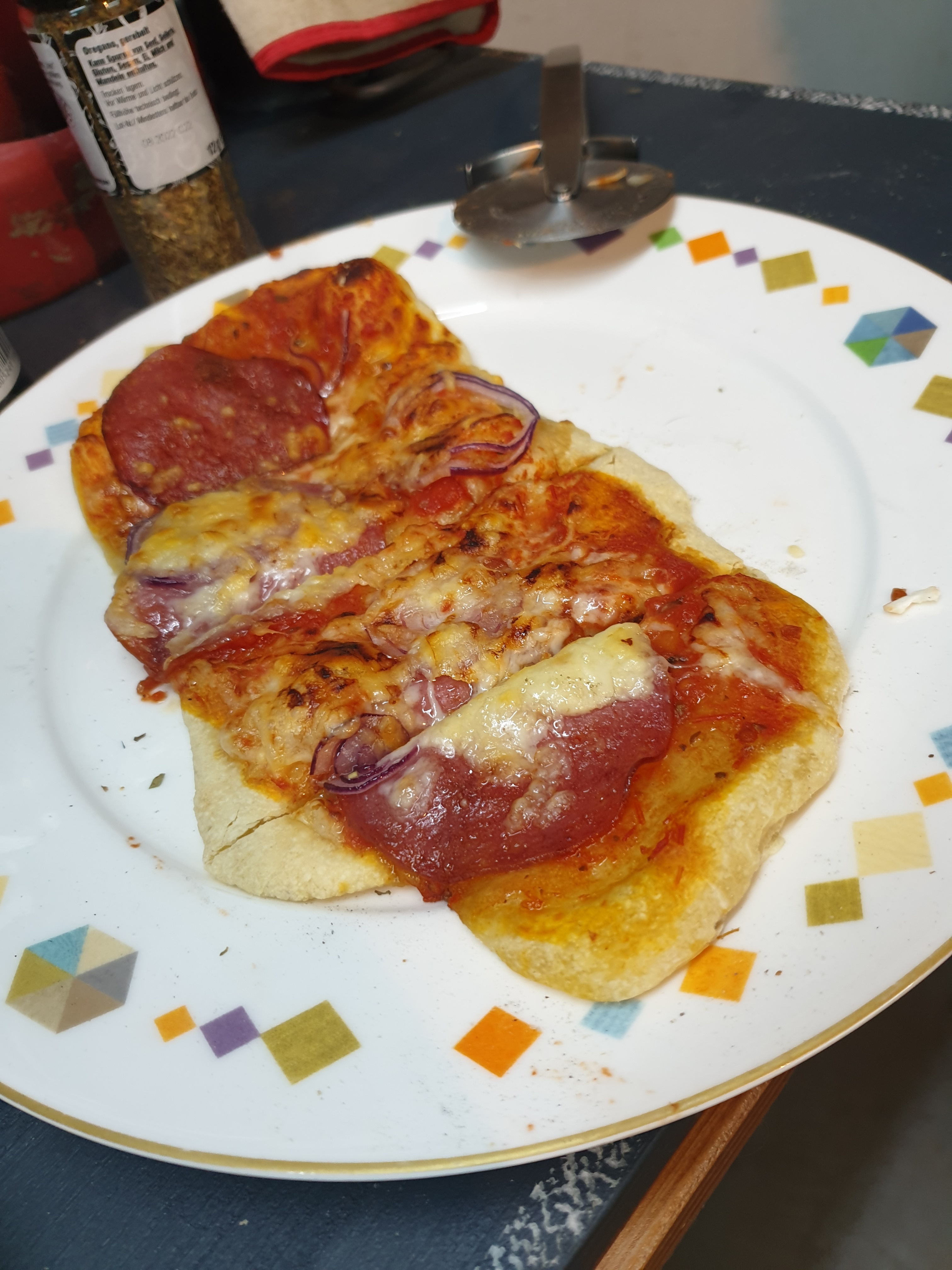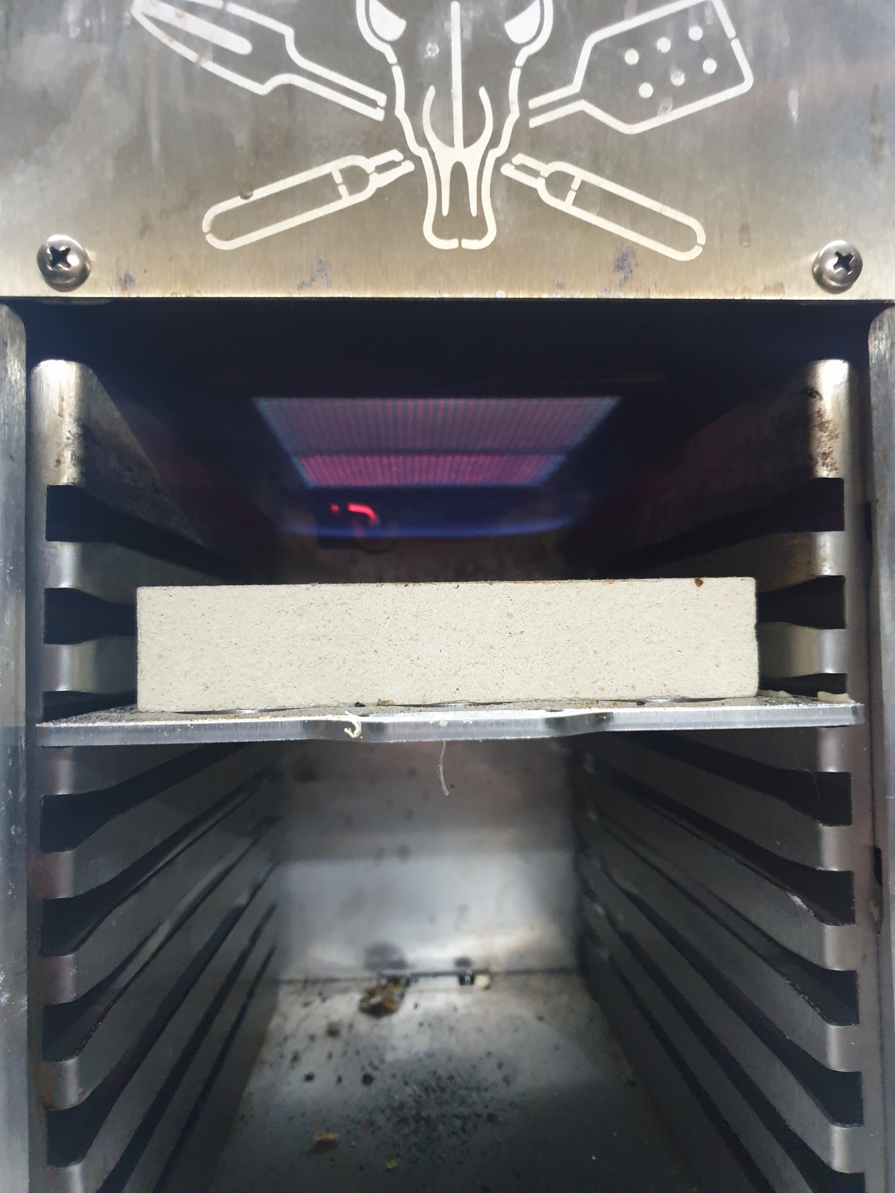 Also Außenmantel wieder drauf, Pizzastein rein und getestet, leider wieder ein leichter "Flammenteppich" oben im Grill.