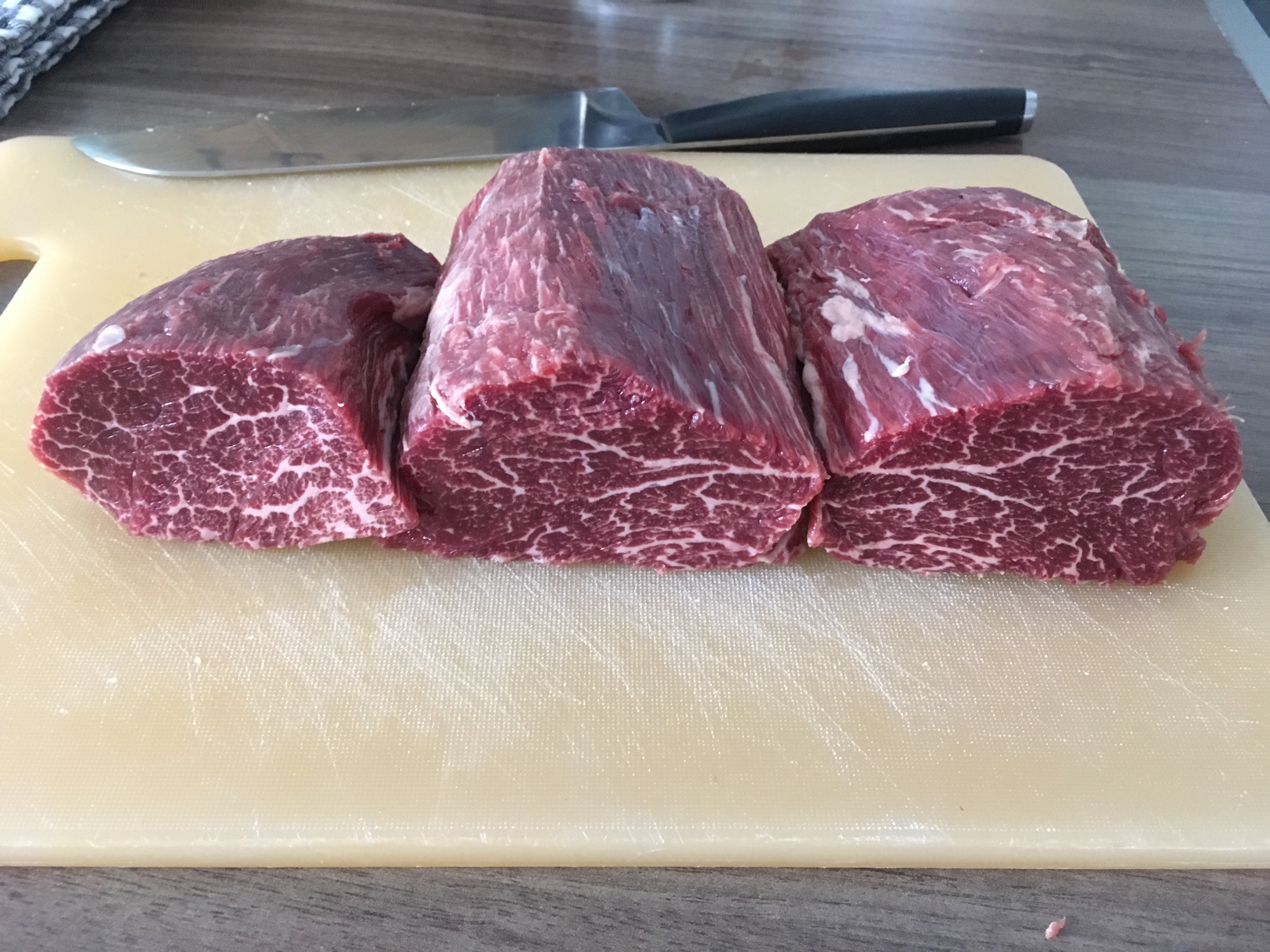 Sodele, ich mache auch gleich wieder Erfahrungen .... und zwar hier mit dem 4 cm Roastbeef vom Australien Angus mit Rosmarin und Knoblauch bei 54 Grad für 4 - 5 Stunden und dann noch das schön marmorierte Txogitxu Filet. Das kommt am Ende auch noch für 2 Stunden mit ins Bad. Natürlich sauber verschweißt nur mit einem Hauch Salz. Über die Temperatur kann man natürlich streiten. Wir mögen es genau so