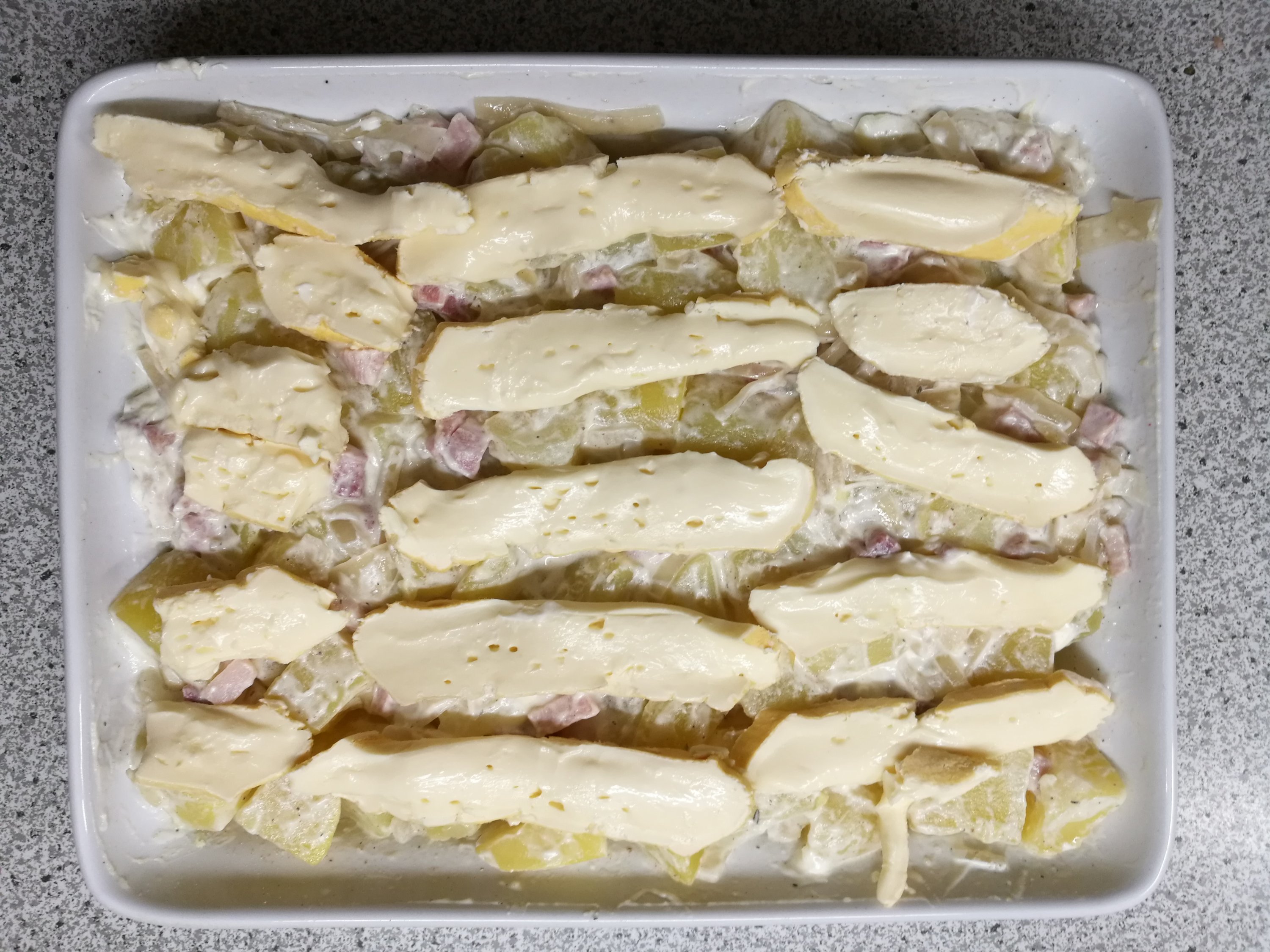 Unter die Kartoffelmasse noch einen Becher Creme Fraiche gemischt und nochmal mit Salz abgeschmeckt. Darauf dann den in Streifen geschnittenen Käse verteilt. Im Original wird der Käse wohl horizontal geteilt und die Hälften dann oben drauf gelegt.