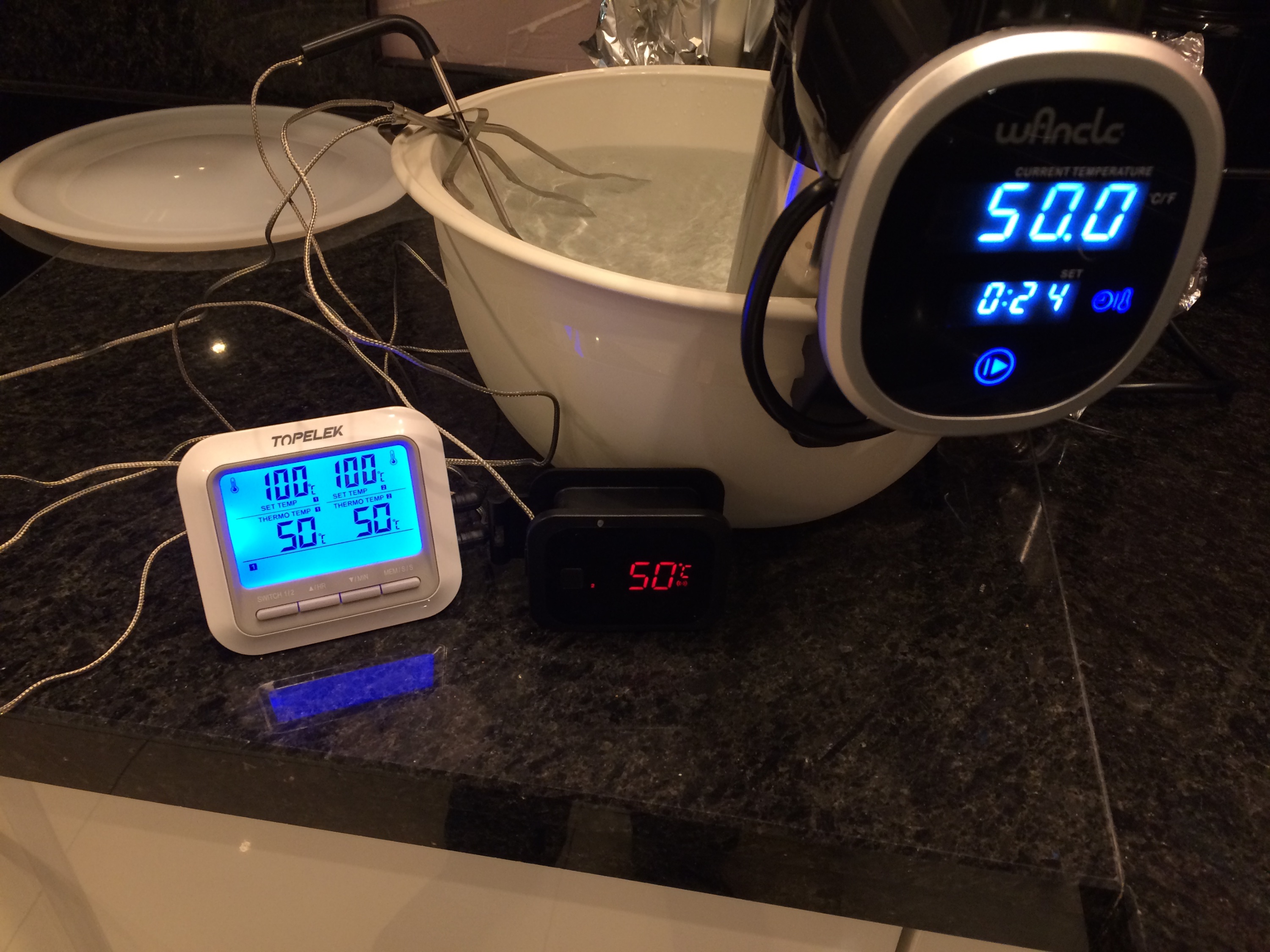 Solltemperatur war auf 50°C eingestellt, zum aufzeichnen habe ich den kleinen Inkbird verwendet. Die Anzeige vom Stick ist zwischen 49,9 und 50,1 gependelt, die Überwachungsthermometer waren wie eingefroren (haben ja nicht so eine hohe Auflösung)