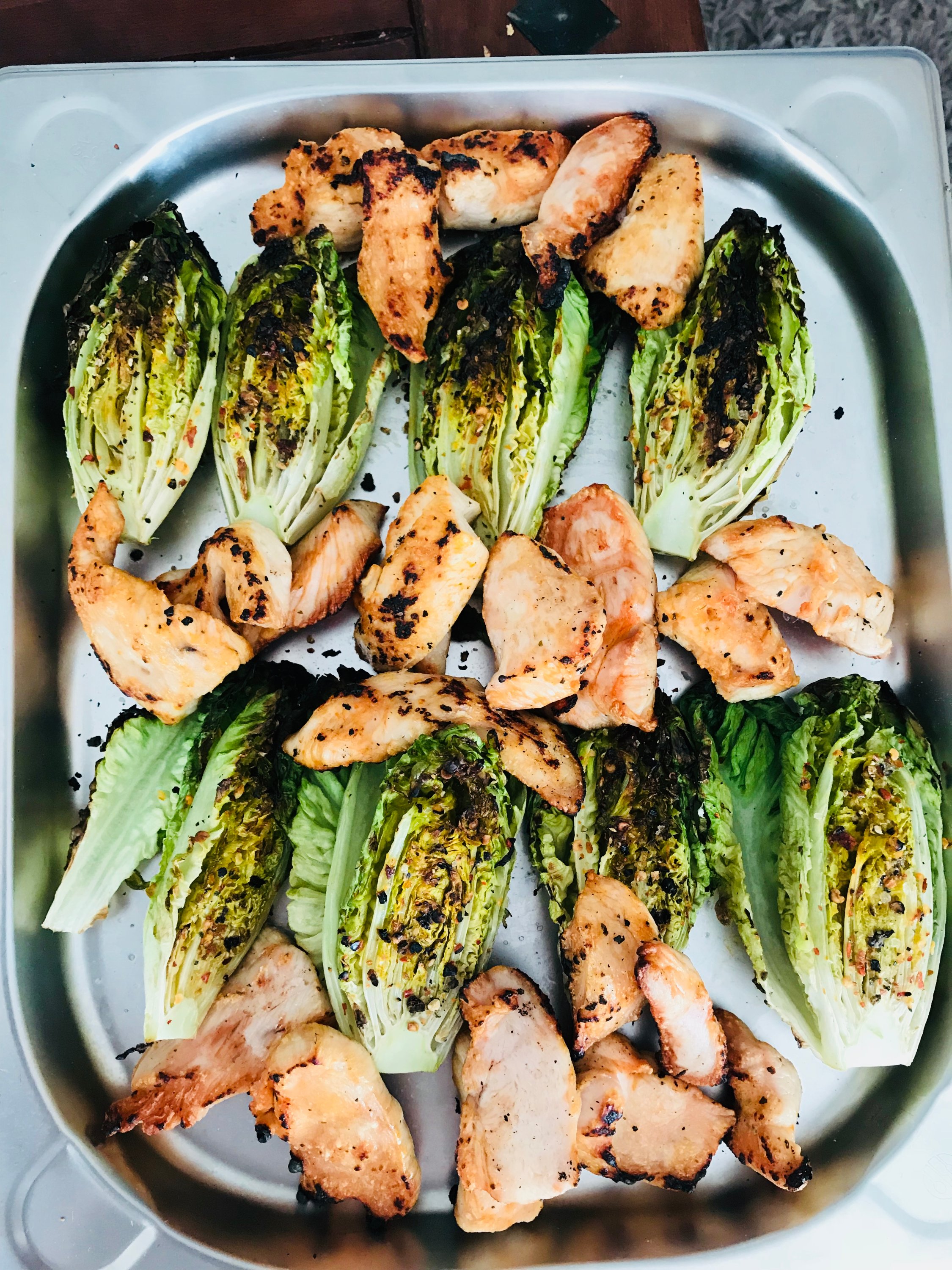 Römersalatherzen mit Nussöl bepinselt und mit Chili-Salz und Pfeffer gewürzt dann von beiden Seiten unter unseren OHG bis der Salat Farbe hat