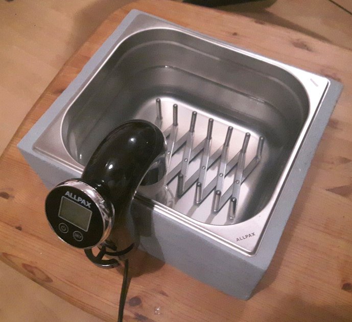Ich nutze einen Stick von Allpax einer 2/3 GN Schale mit selbst gebauter Styropor Isolierung. Hatte auch einen