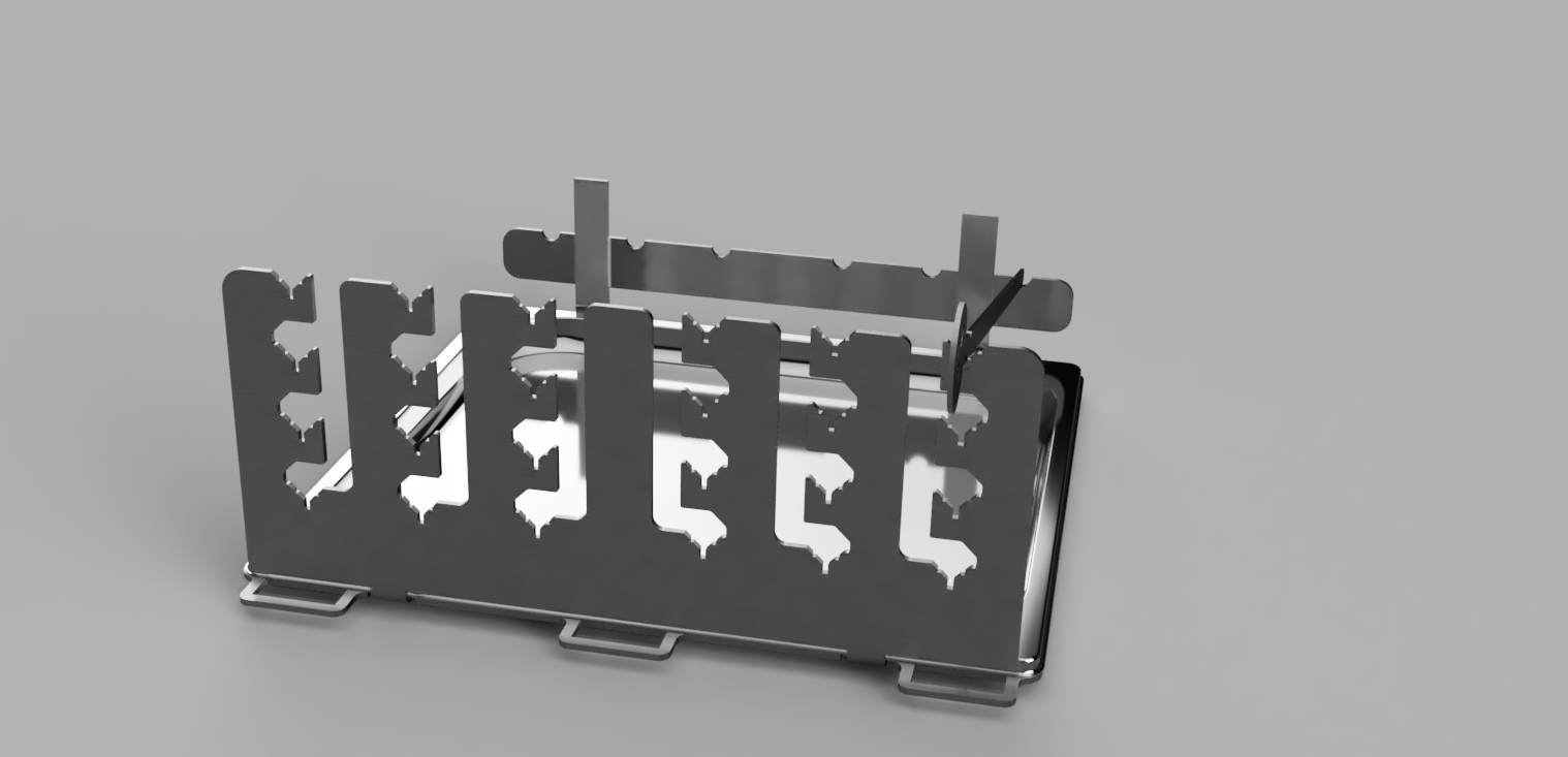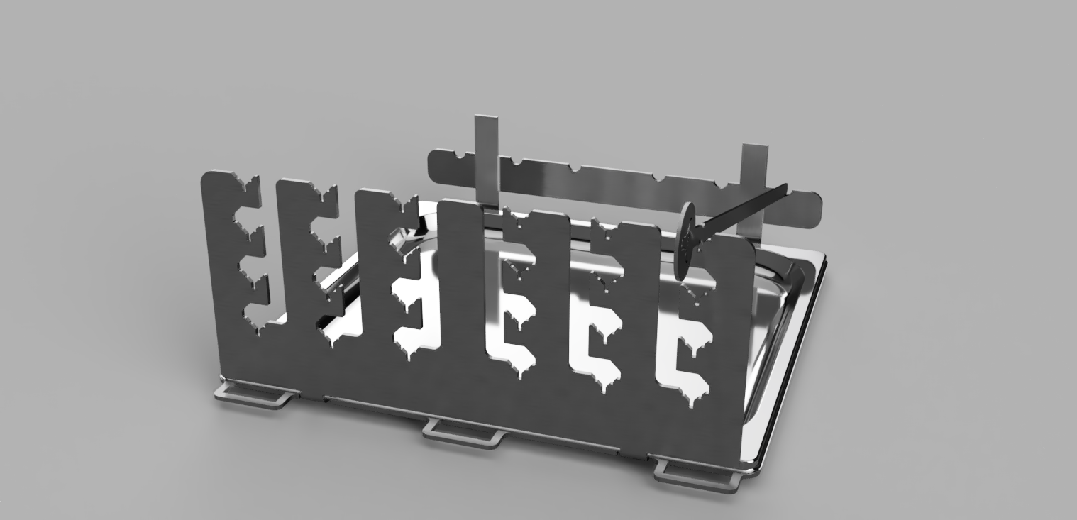 c) Auch würde ich immer den GN-Behälter in den Einschubrahmen integrieren und nicht nur statisch darunter stellen. Gerade, wenn man den Einschub mal kurz rauszieht - man spart sich das ständige Säubern. Allerdings muß dann der Niederhaltedorn an der 2. Schienen von unten entfallen (durchgehend 10mm) - die sind da unten eh nicht mehr erforderlich.