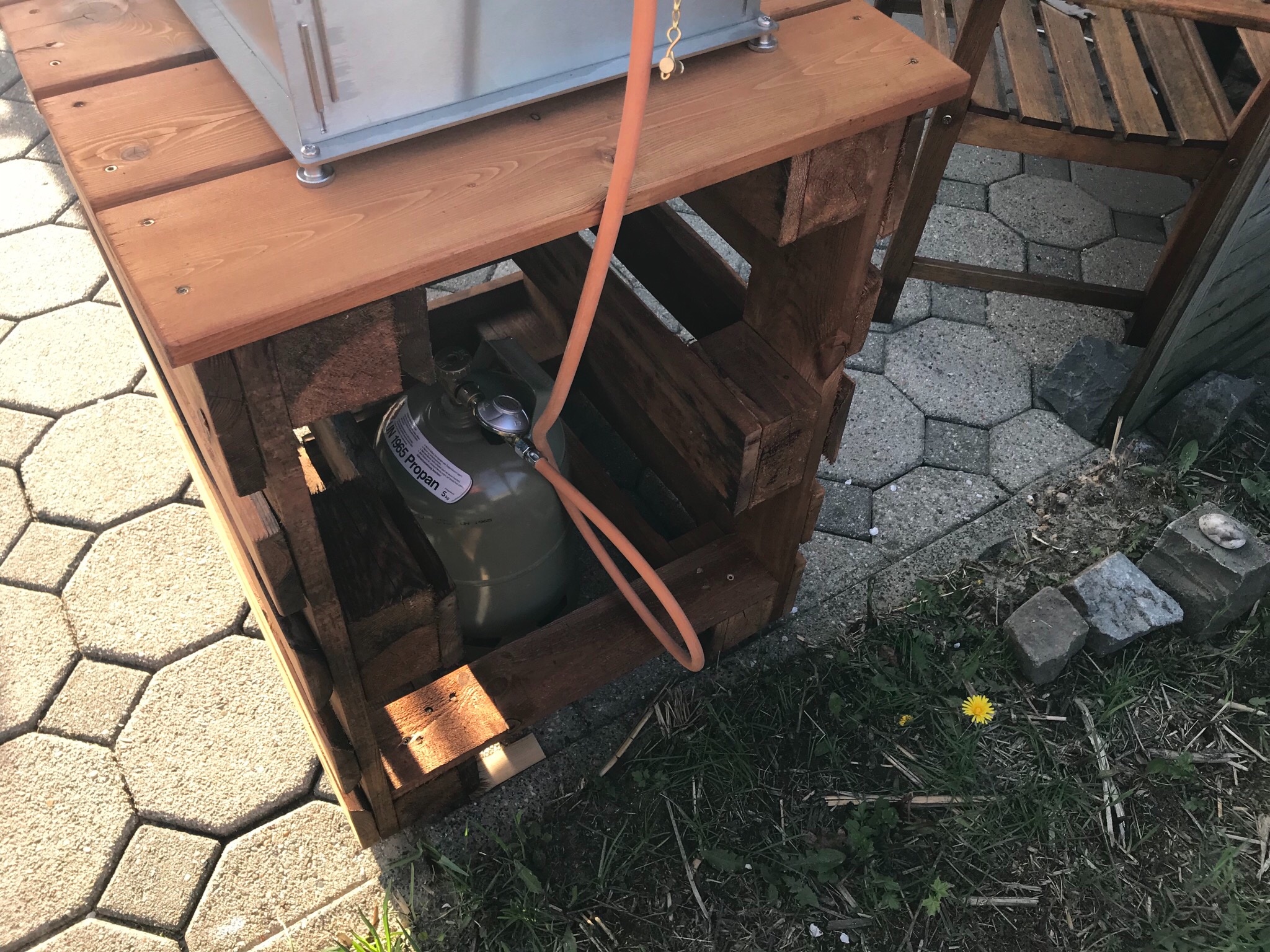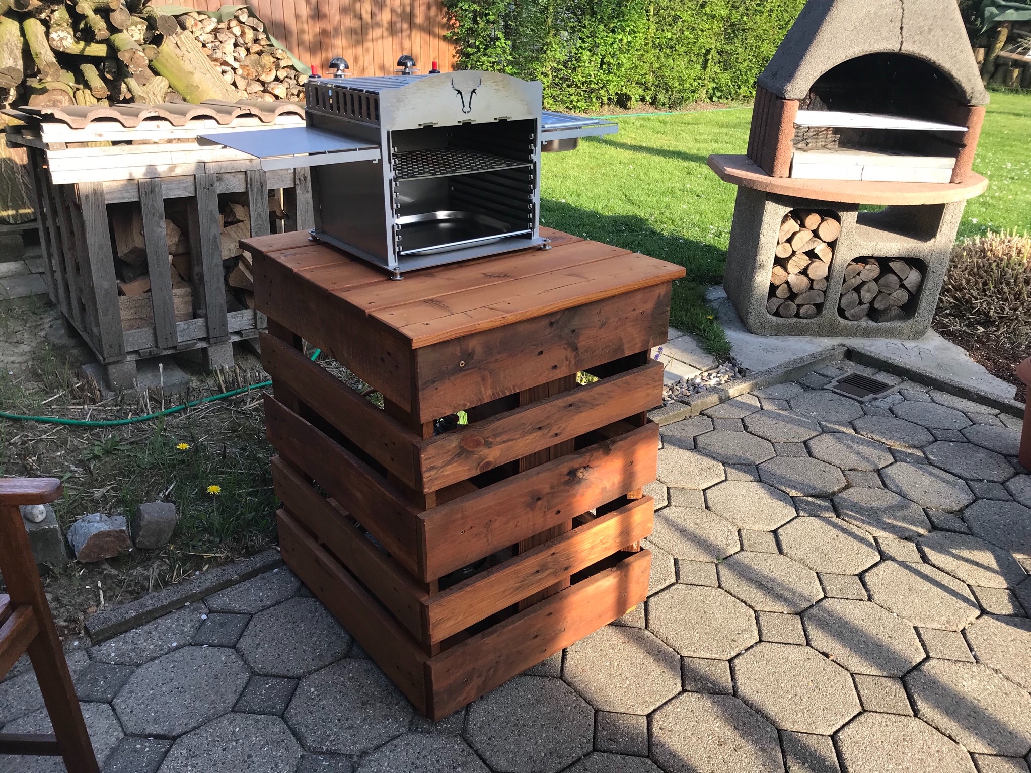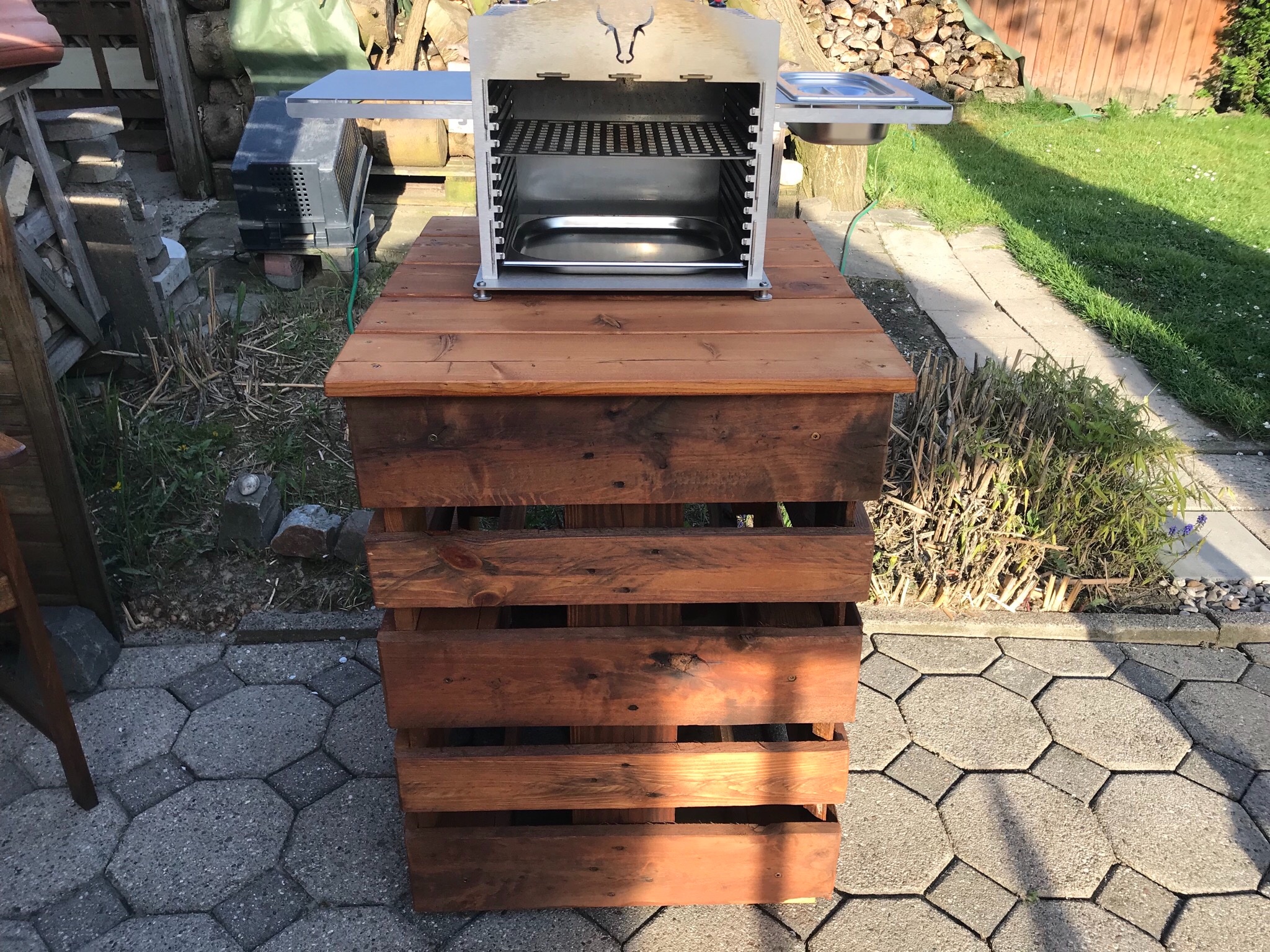 Hier mal mein provisorischer Entwurf. Ich habe einfach ein paar Europaletten genommen und das Holz lasiert.