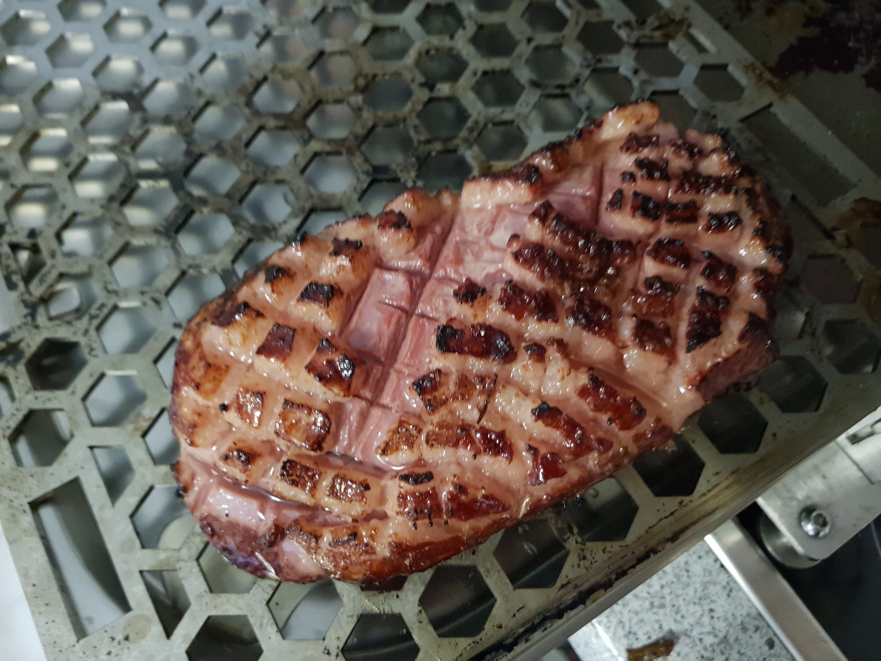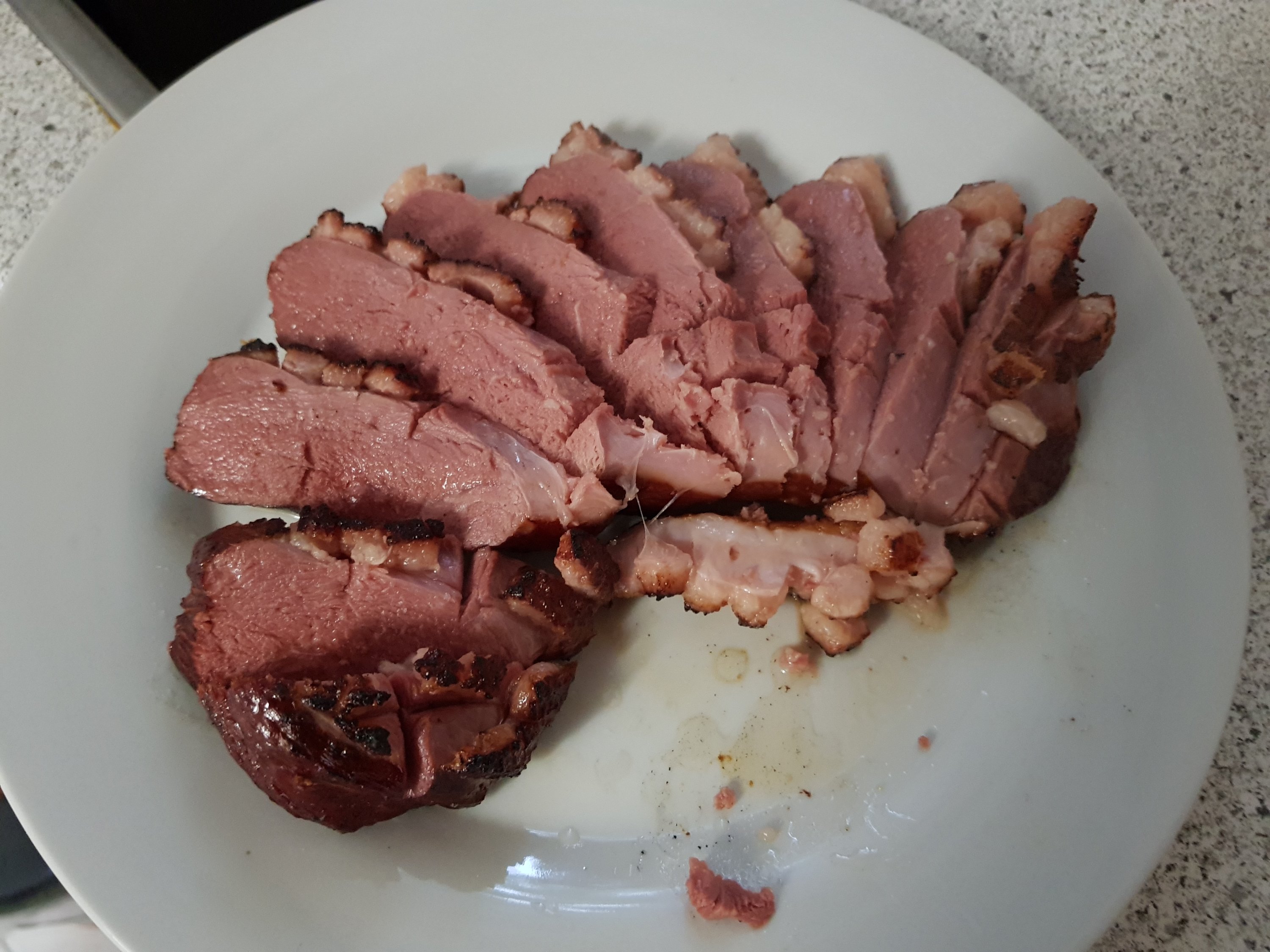 habe sie zunächst bei 58° 1,25std im sous vide gehabt. als sie fertig war habe ich die haut rautenförmig eingeritzt und im ohg angeknuspert.