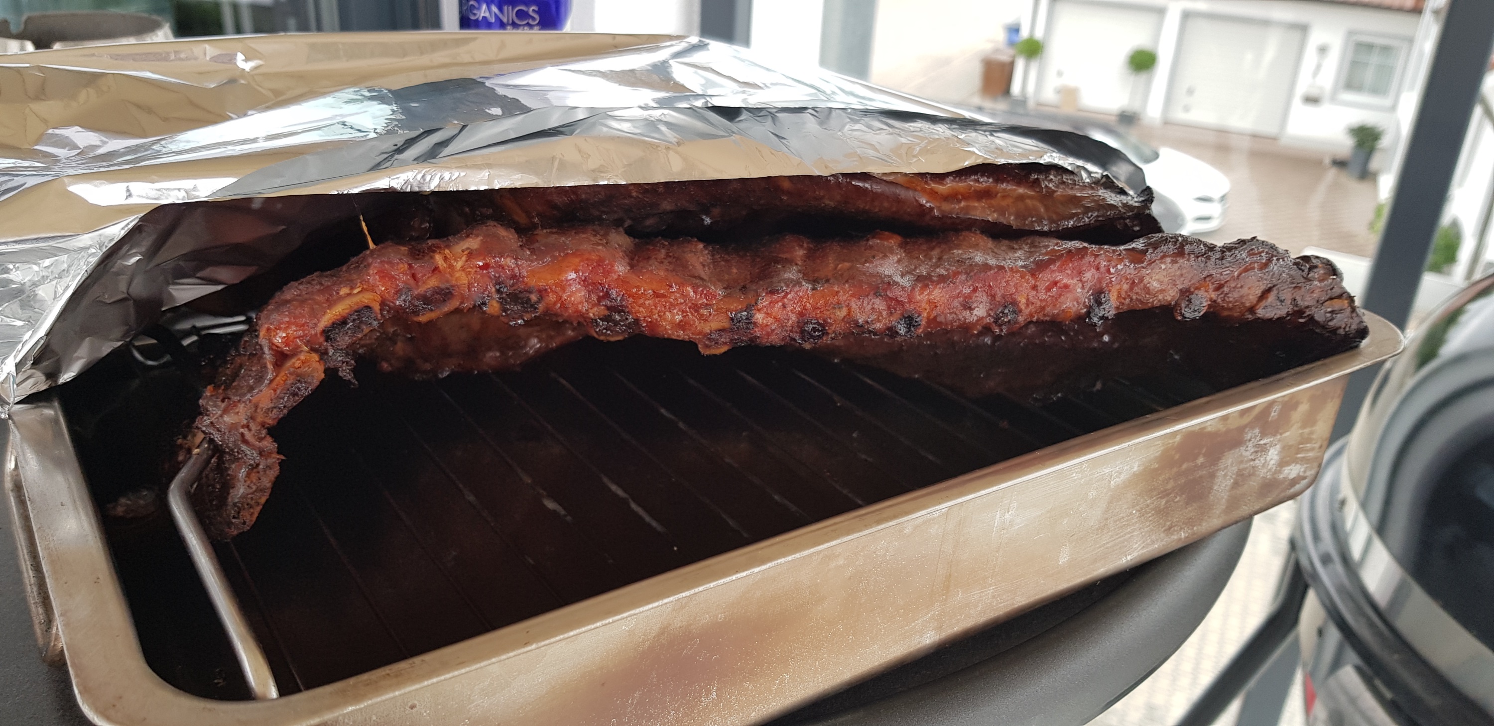 Danach hab ich die Ribs schön eingepackt und zum Dämpfen mit Apfelsaft in die große Konics und wieder oben auf den Rost rauf
