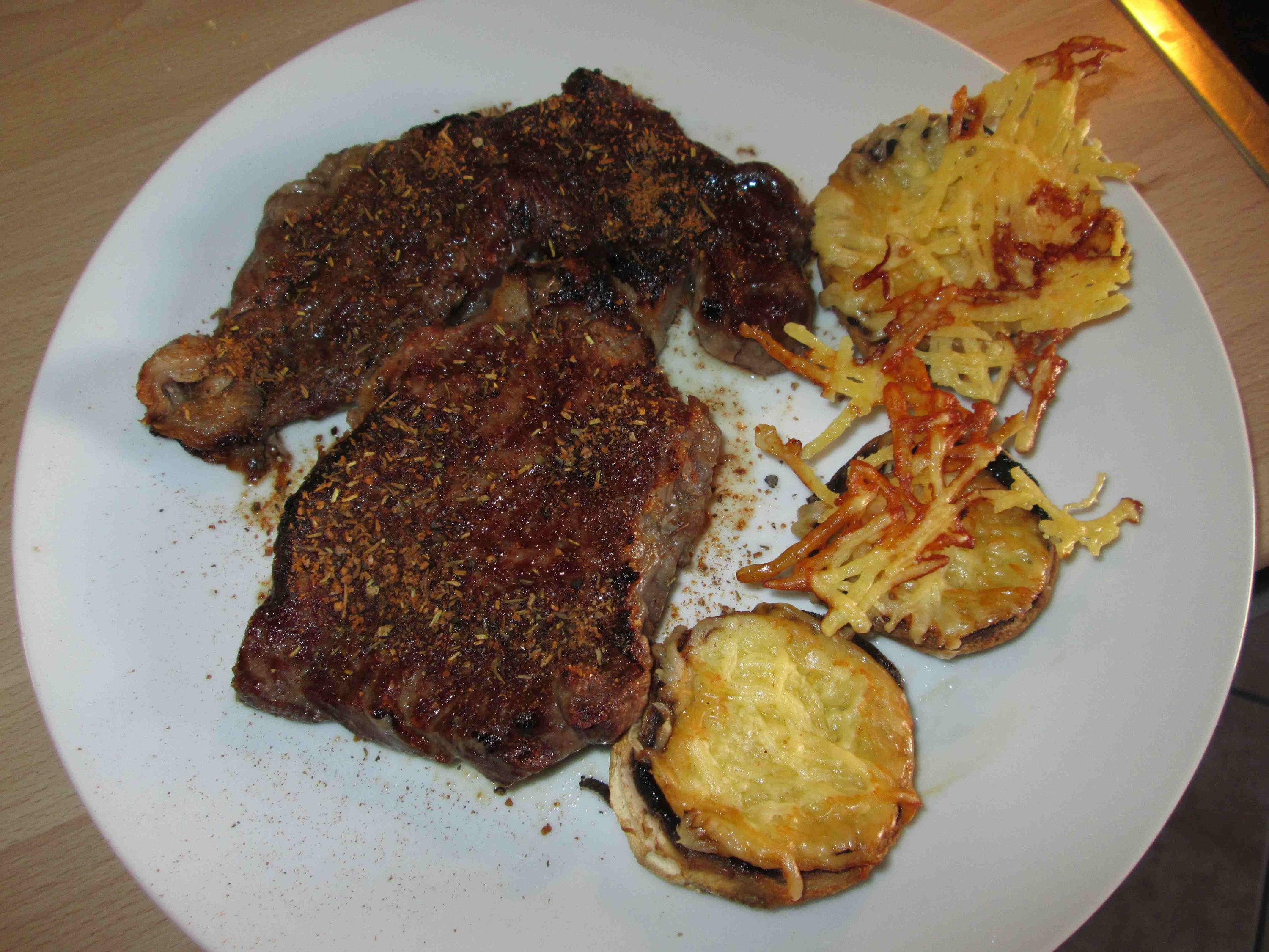 So weit wie möglich nach oben, dann bei so einem dünnem Steak max 1 min pro Seite brutzeln, Kerntemperatur messen, Fertig