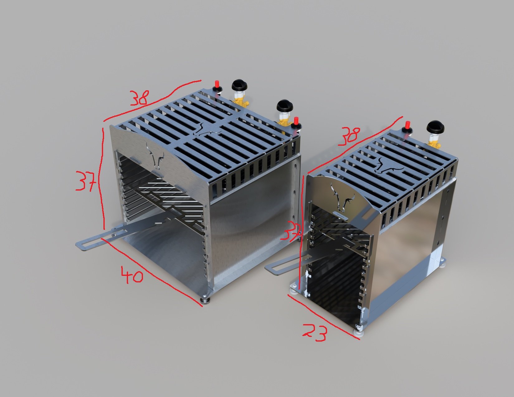 Da ich noch keinen OHG vor Ort habe, habe ich mal die Maße anhand der CAD Dateien versucht zu schätzen (jeweils mit +1cm Spielraum). Mich interessiert nur der Single, aber ich würde für die Twin Variante gleich mit anfragen. Die hintere Höhe konnte ich nur schwer einschätzen: Wie weit steht der Gasregler über? Macht eine einheitliche Höhe vorne und hinten Sinn (siehe Formen)? Twin ist nur breiter, richtig? Wie schaut es mit dem Schlauch hinten aus (Winkel/kein Winkel)?