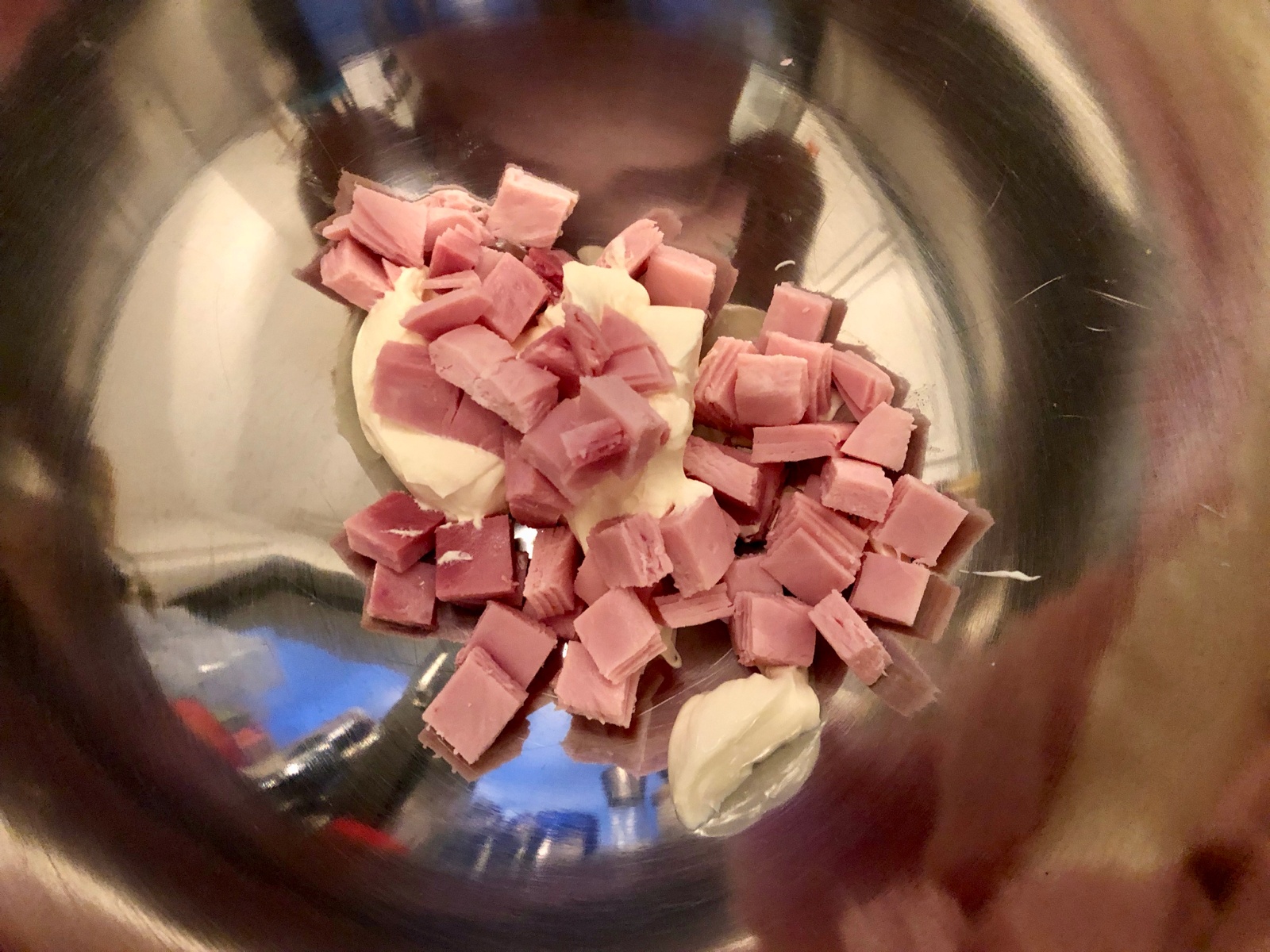 Schinken und Zwiebel in Würfel schneiden.