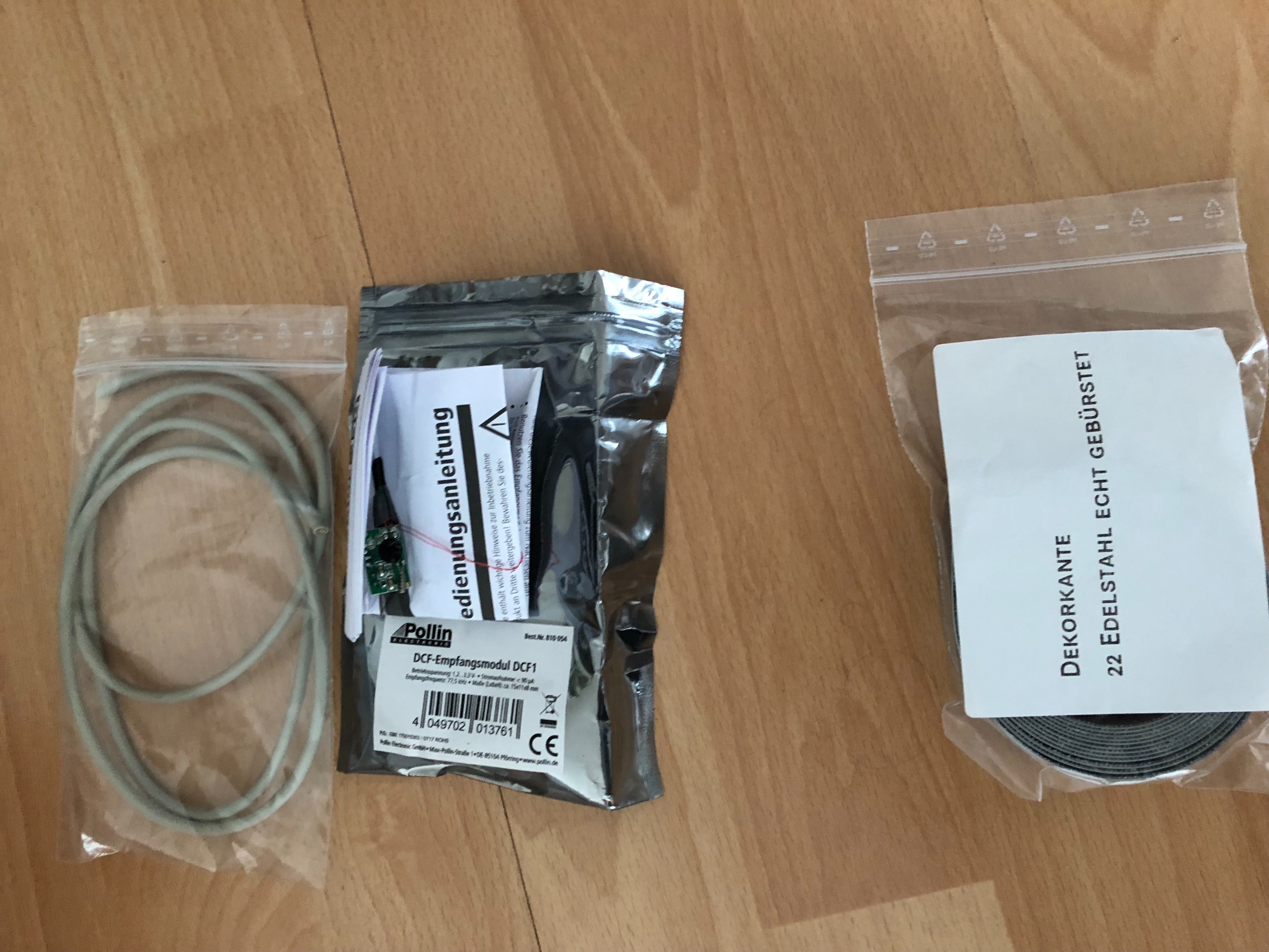 So kommt das Paket an: Ich habe mit den DCF (Funkempfänger), Diffusorfolie und einen Umleimer in Edelstahloptik dazu bestellt.