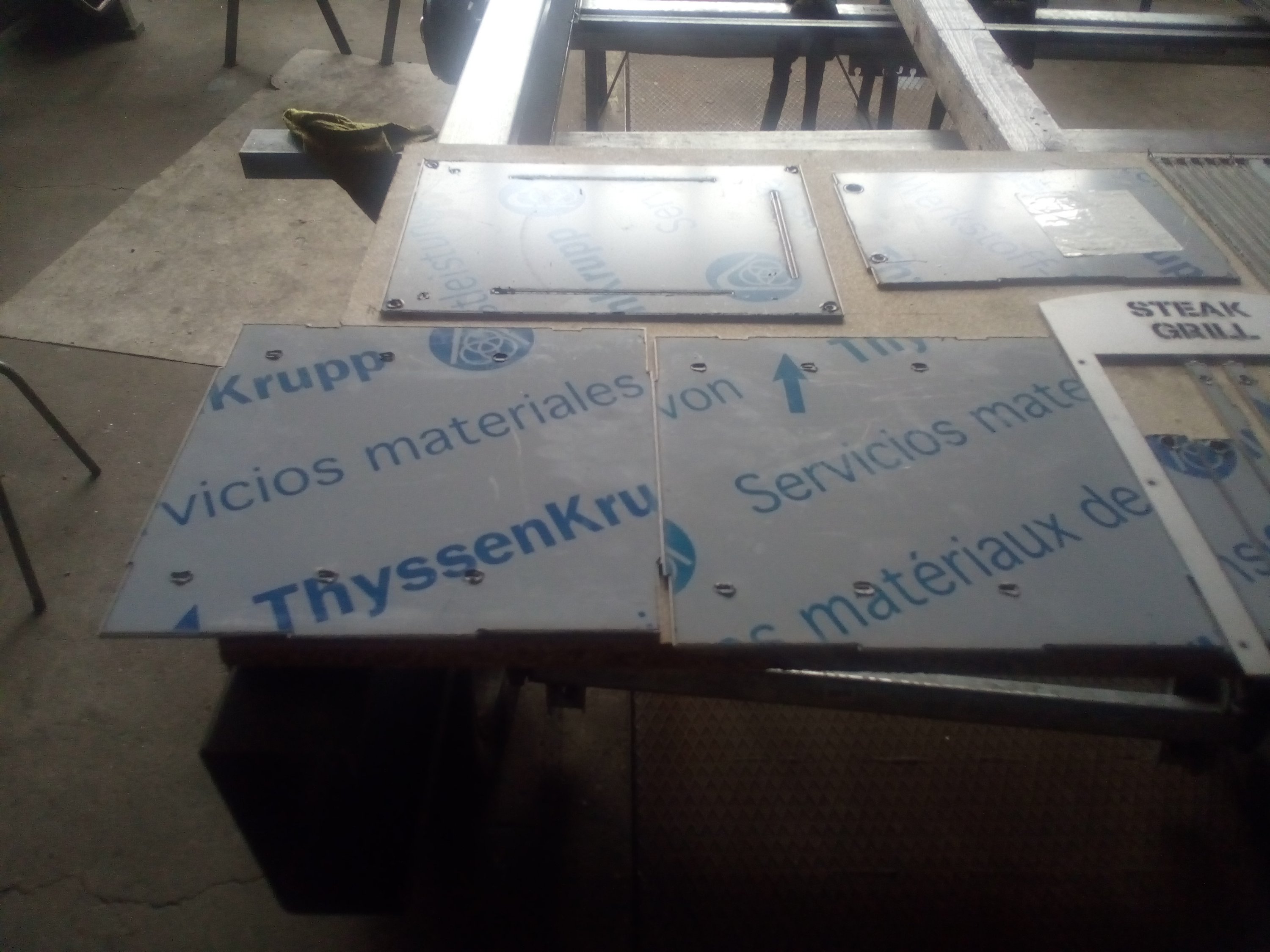 Die schmalen langen Teile neben der Front mit der „Steak Grill“ Schrift werden vor den Seitenwänden eingesteckt, die Front dran geschraubt. Ganz rechts liegt die obere Platte, links davon das Zwischenblech (zwischen Brenner und obere Platte kommt das) und darunter 2 Roste. Die Teile rechts oben habe ich nicht, sieht aus wie Einschübe fürs Rost. Die breiten länglichen Teile bei der Front sind Rostheber.