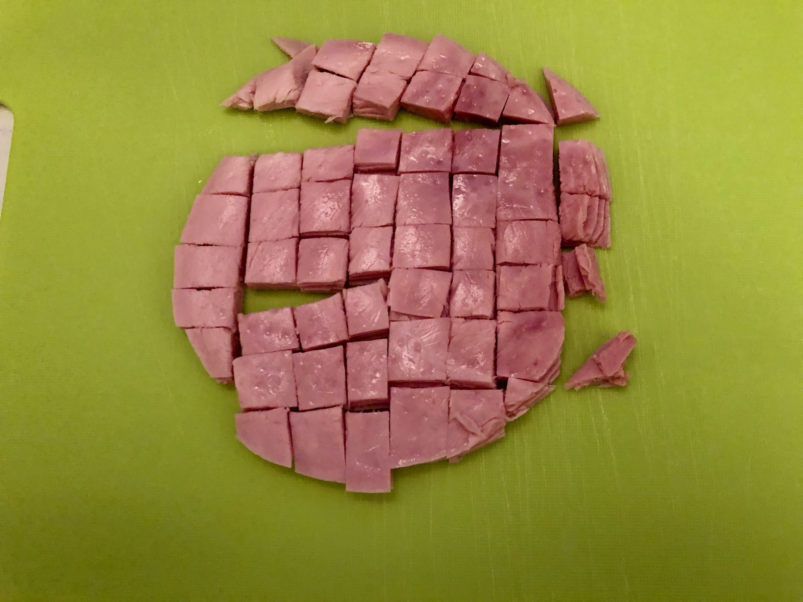 Schinken und Zwiebel in Würfel schneiden.