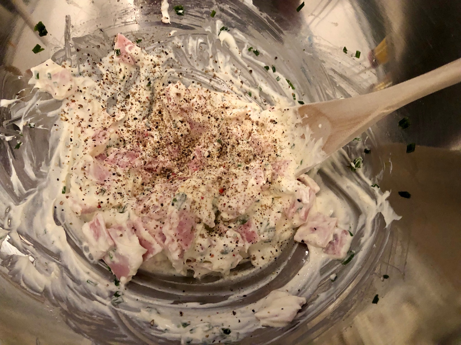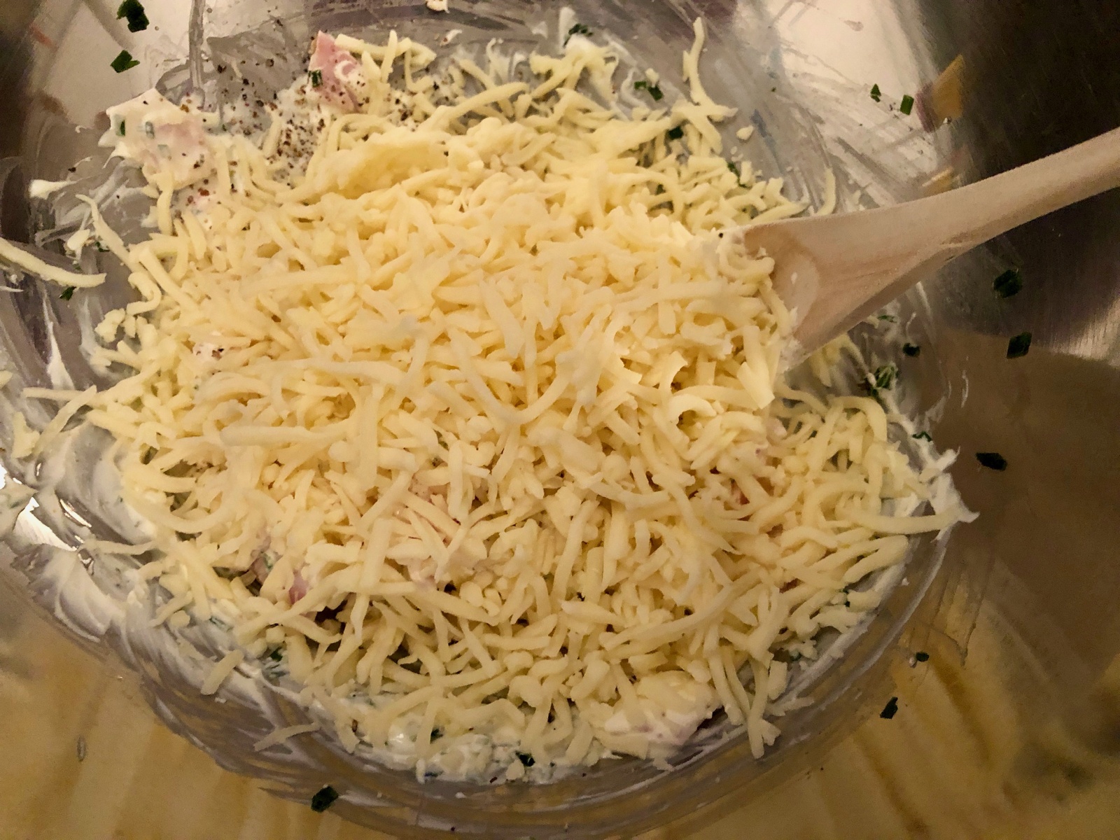 Schinken, Zwiebel, Schnittlauch und Reibekäse vermengen sowie mit Pfeffer und Salz würzen.