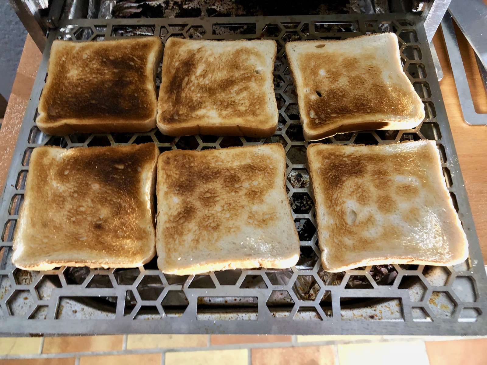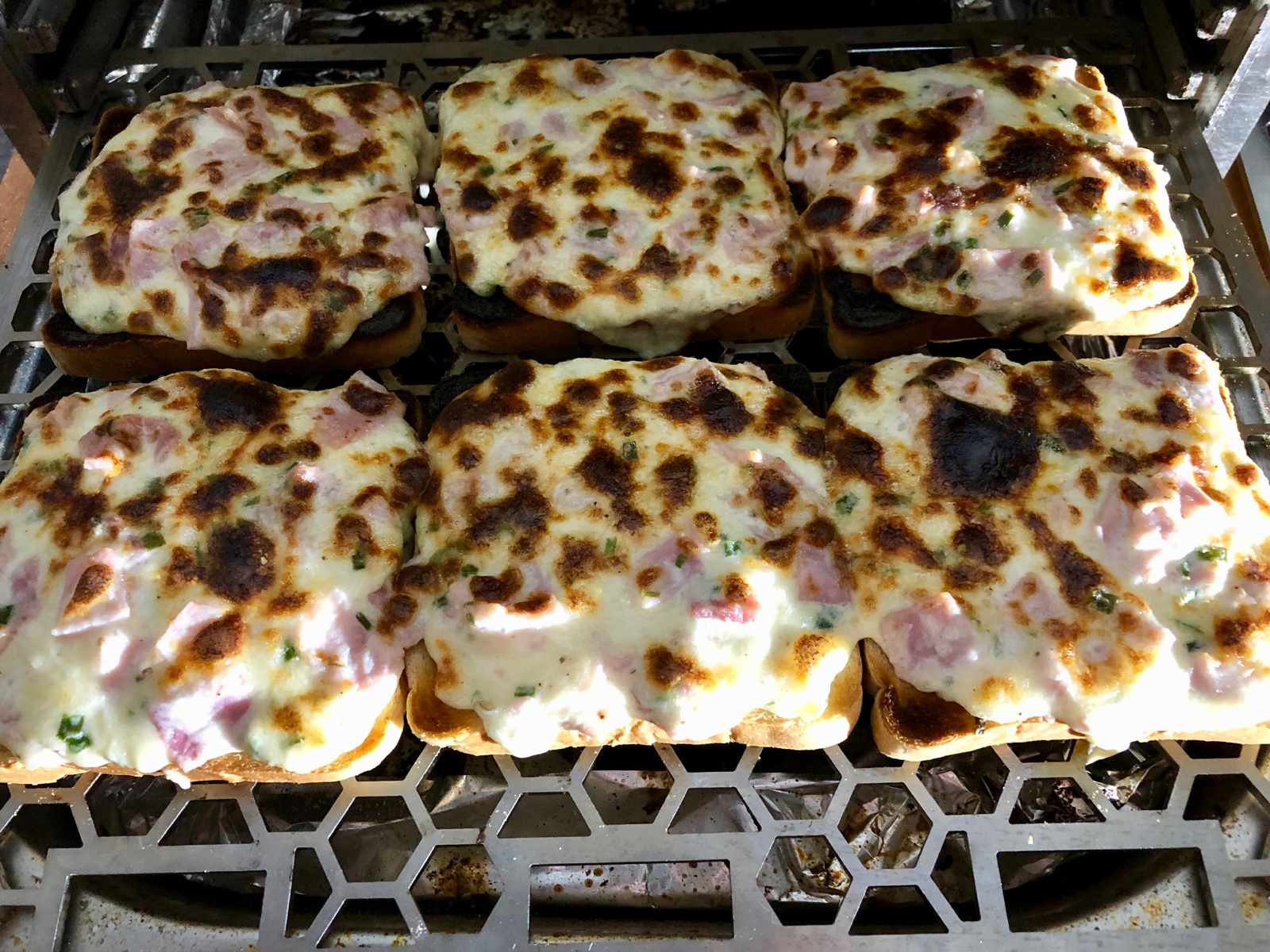 OHG auf niedrigste Temperatur einstellen und die Toastscheiben von beiden Seiten etwas vortoasten. Das kann man natürlich auch im Toaster machen.