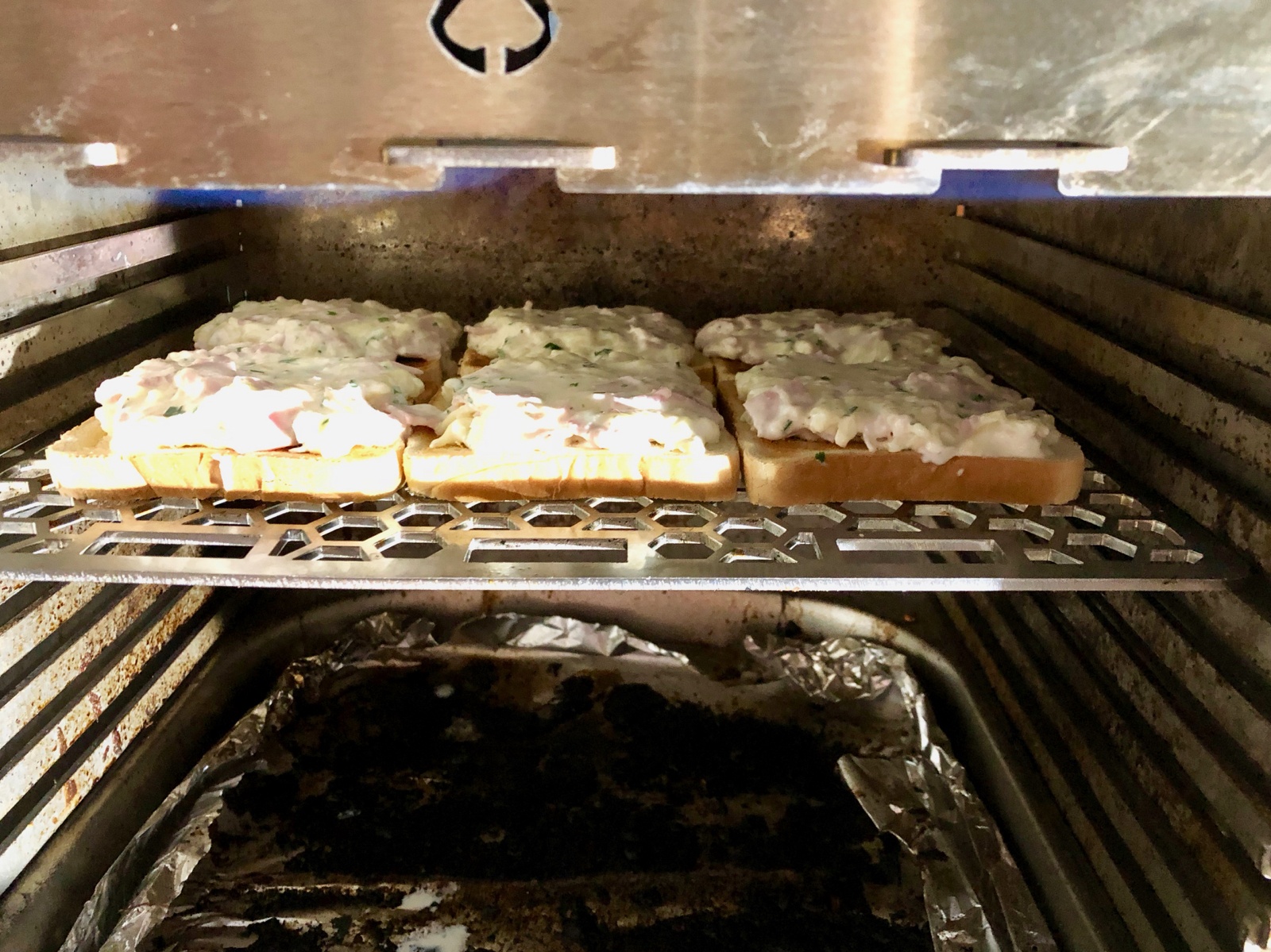 Die vorgetoasteten Toastscheiben mit der Masse bestreichen und auf den Rost des OHG geben.