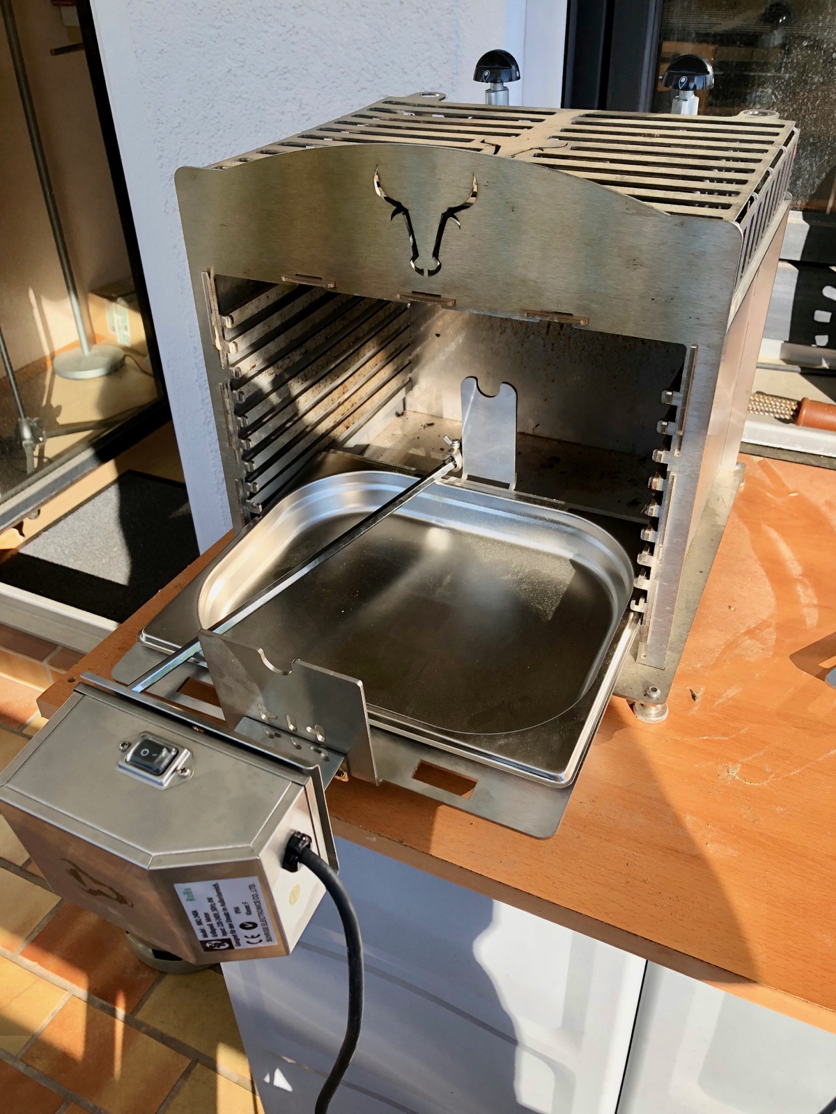 Ich habe erst die Schale mit Spieß in den Grill geschoben, dann von außen den Vierkant aufgesteckt und darauf dem Motor aufgeschoben, der in der passenden Höhe an meinem Holzklotz eingehangen war.