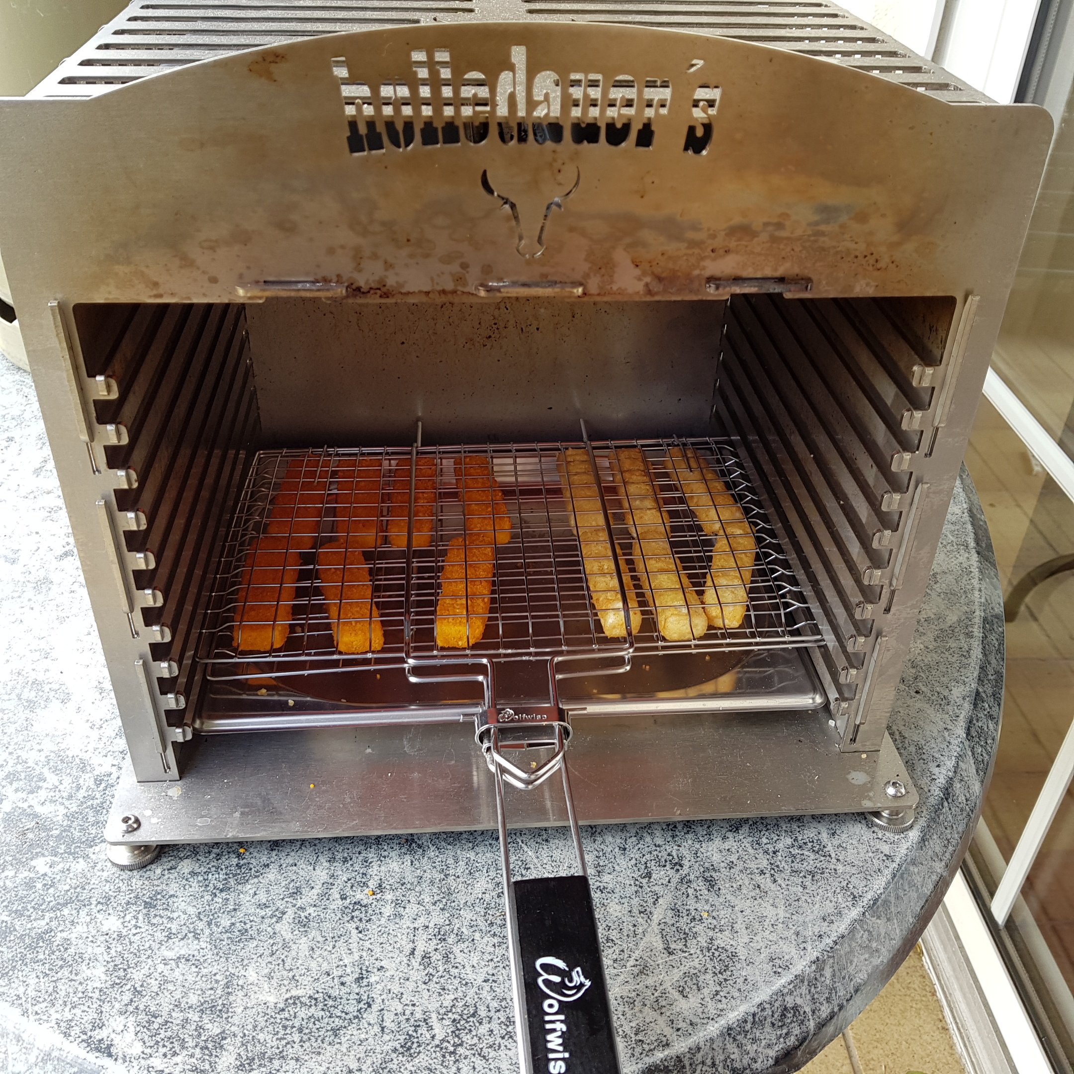 Der Korb geht so, ist aber nicht optimal. Durch die "Dicke" der Stäbchen lässt er sich nicht mehr gut einschieben. Wenn man die Seiten zusammenzwickt geht's aber. Der Korb kam fast ganz unten rein und die Heizleistung war auf "Mittelstellung". Jedes Seite wurde erstmal ca. 5 Minuten gegrillt, dann in die höheren Regionen eingeschoben um die "erforderlichen" Röstaromen zu bekommen :mrgreen: :mrgreen: