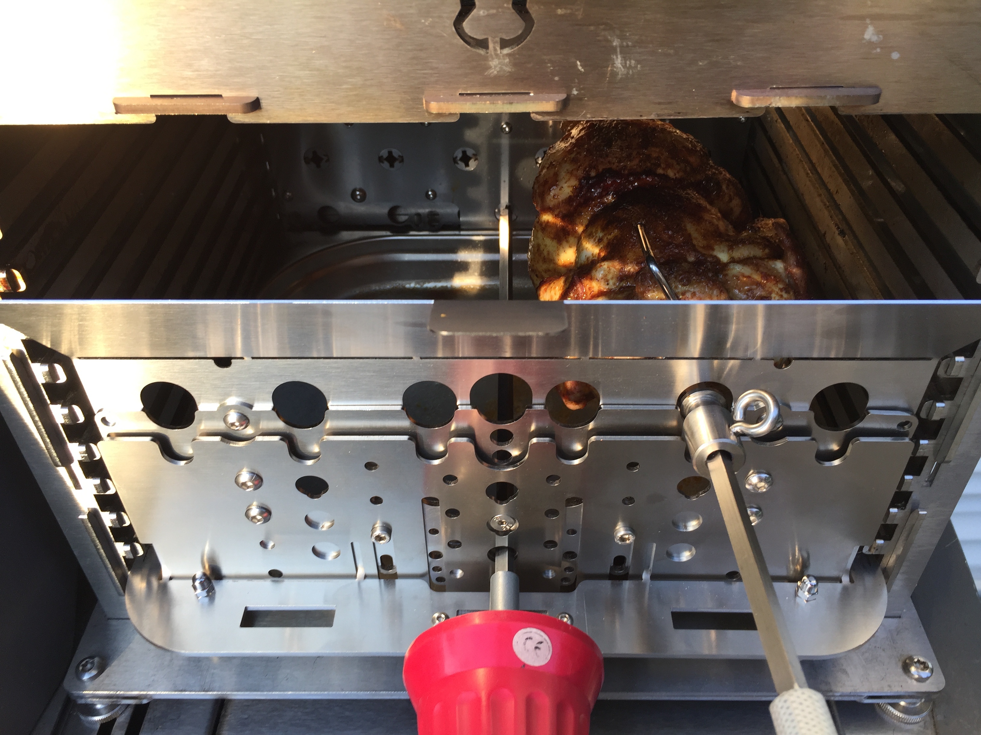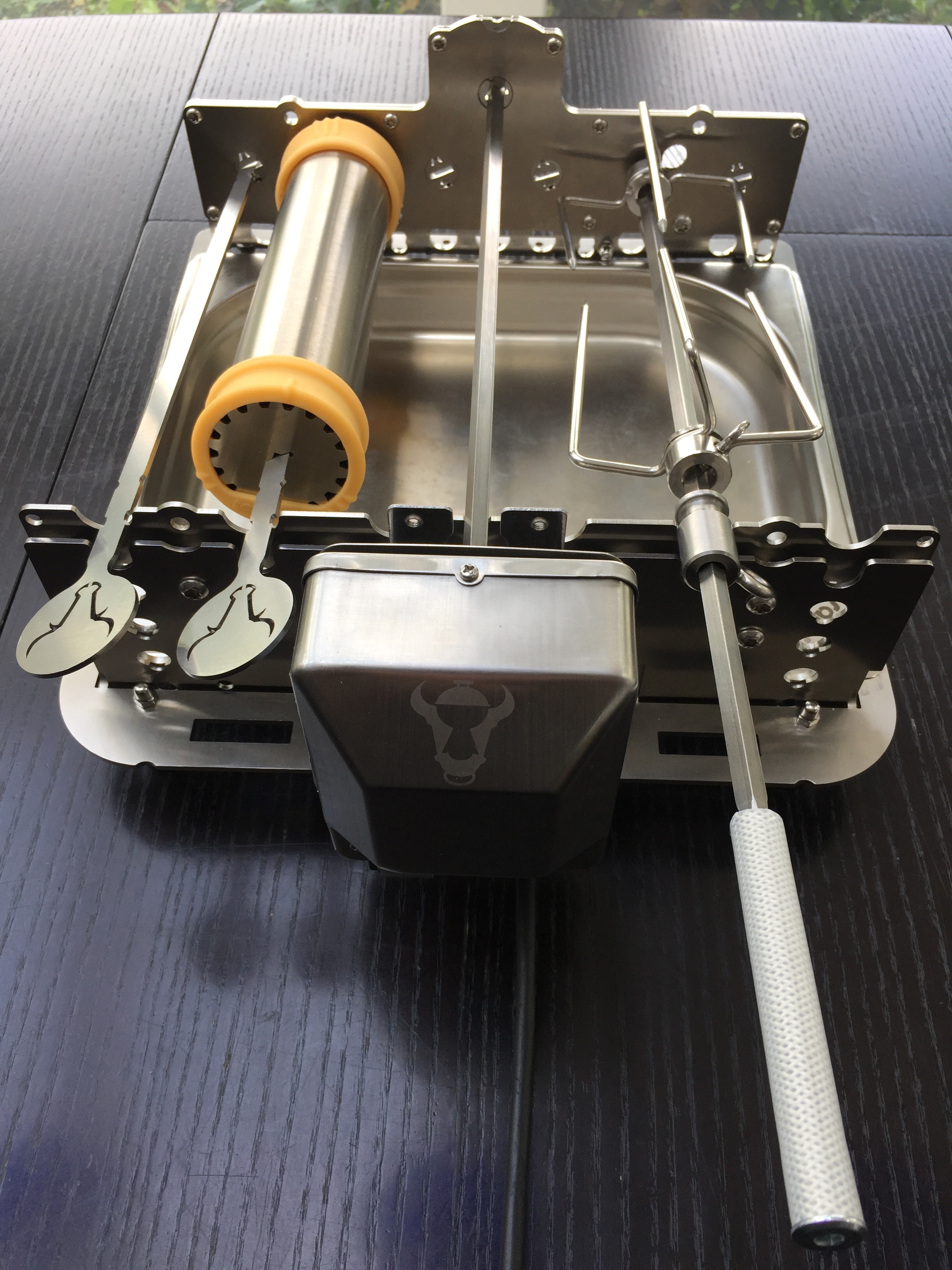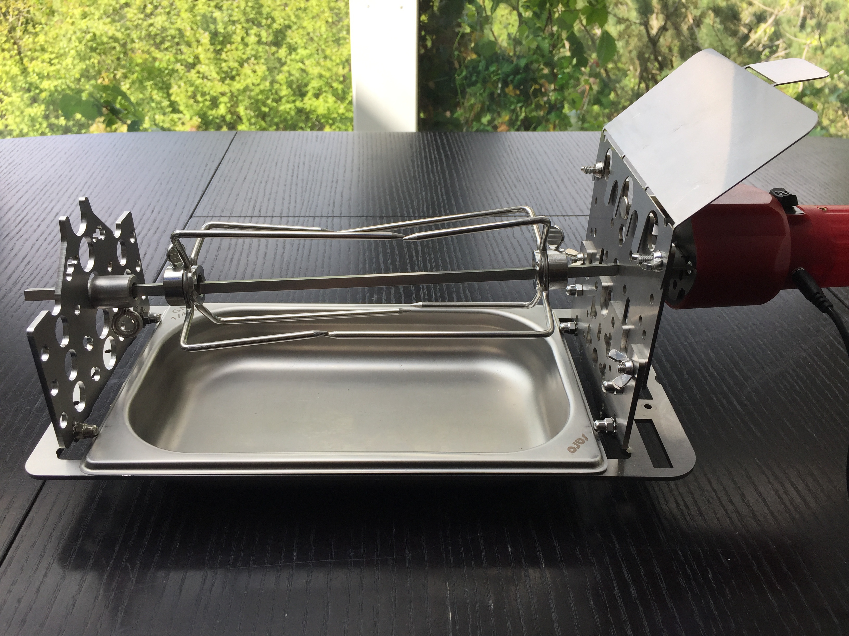 Für die vier Single und Twin Forum-Oberhitzegrills in meiner Familie habe ich während eines Jahres mit mehreren Optimierungsschleifen ein flexibles Add-on für OHG's in Edelstahl entwickelt das sowohl für Schaschlik-Spieße als auch als Rotisserie dienen kann: