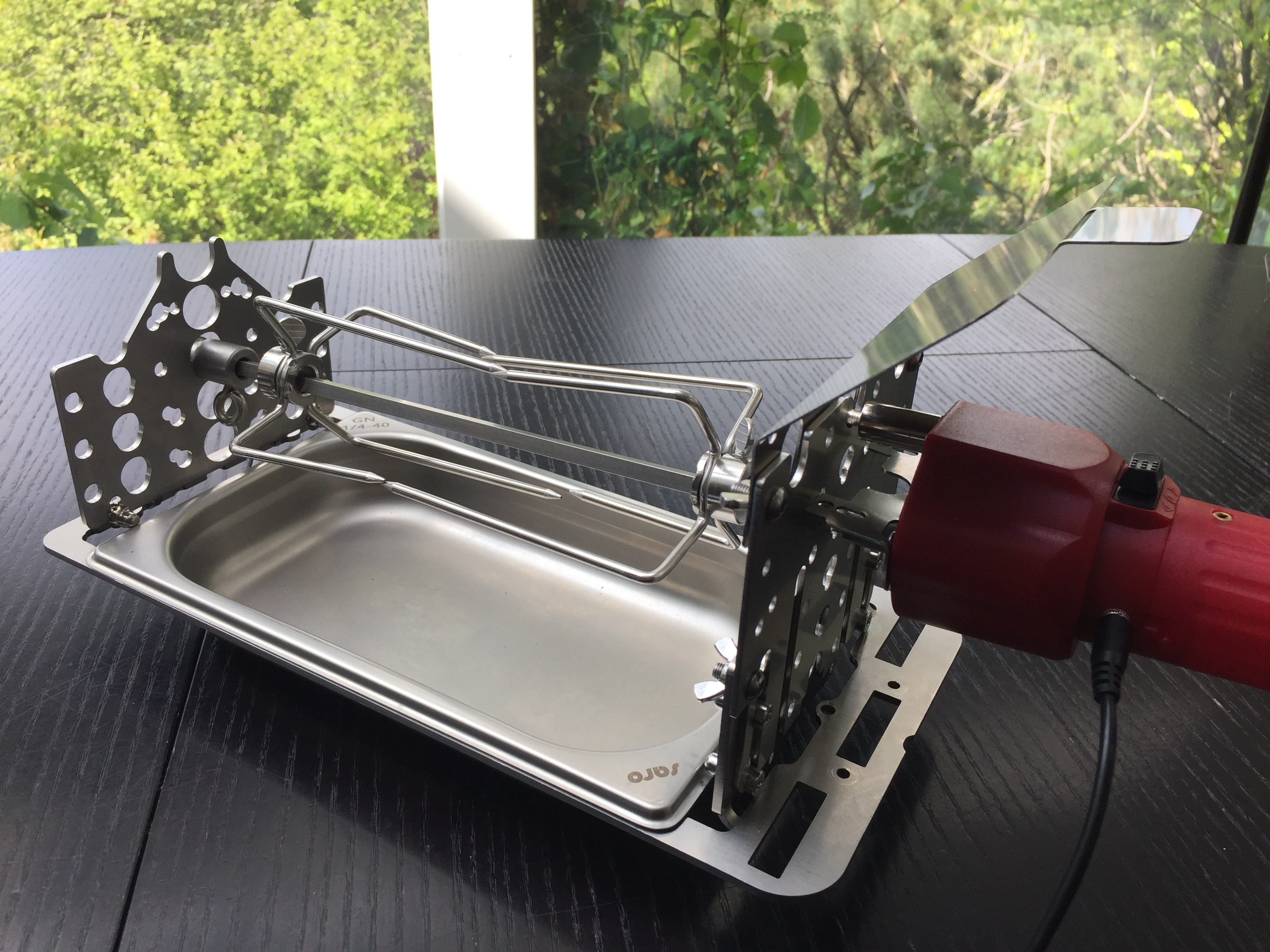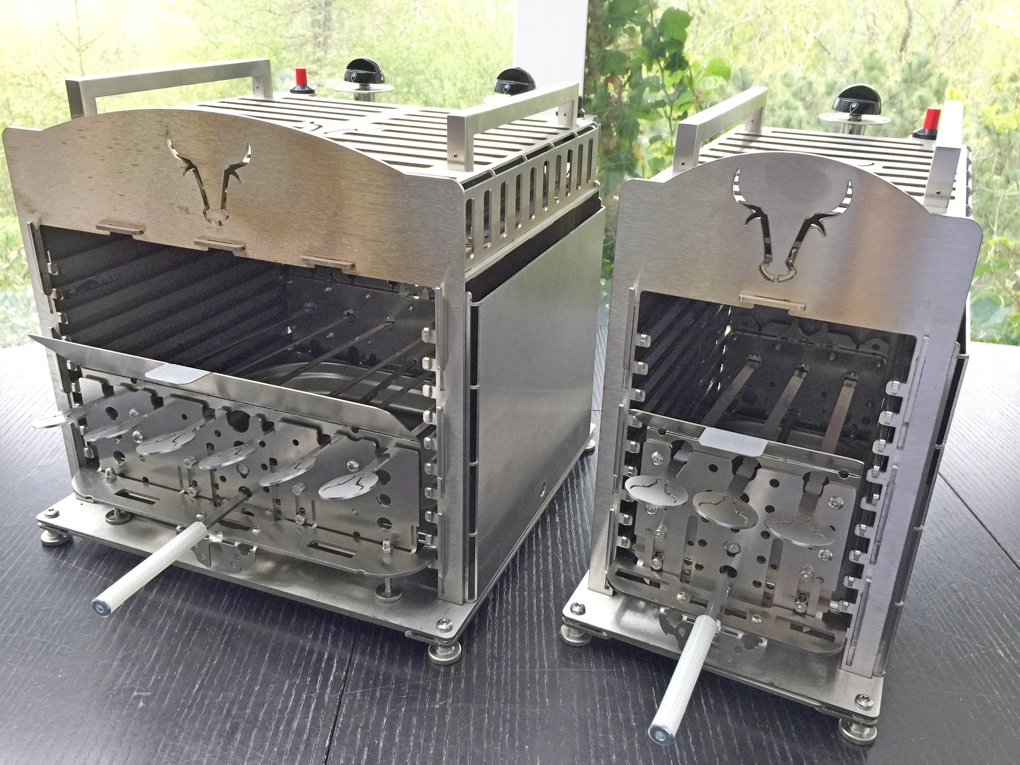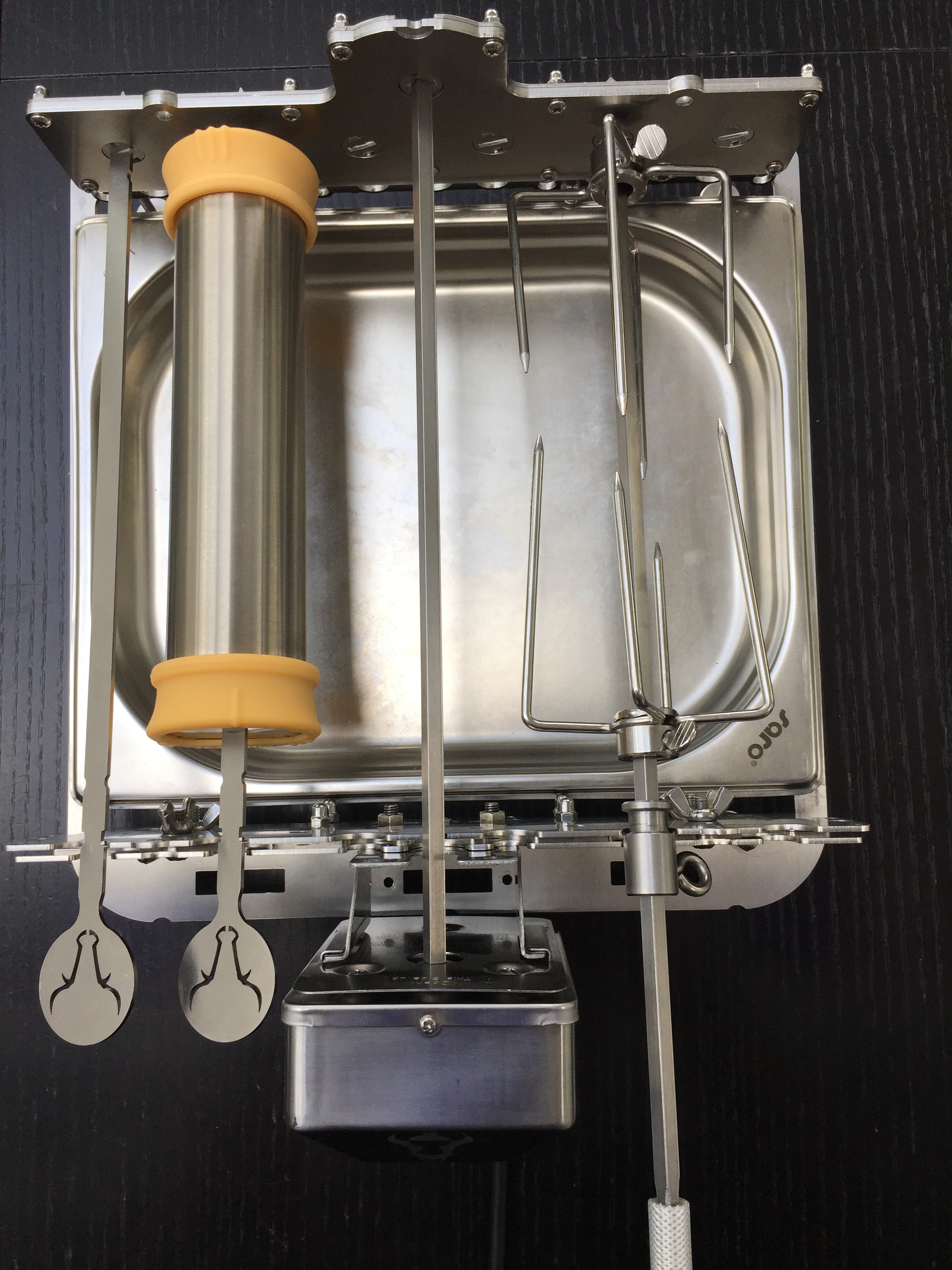 Für die vier Single und Twin Forum-Oberhitzegrills in meiner Familie habe ich während eines Jahres mit mehreren Optimierungsschleifen ein flexibles Add-on für OHG's in Edelstahl entwickelt das sowohl für Schaschlik-Spieße als auch als Rotisserie dienen kann: