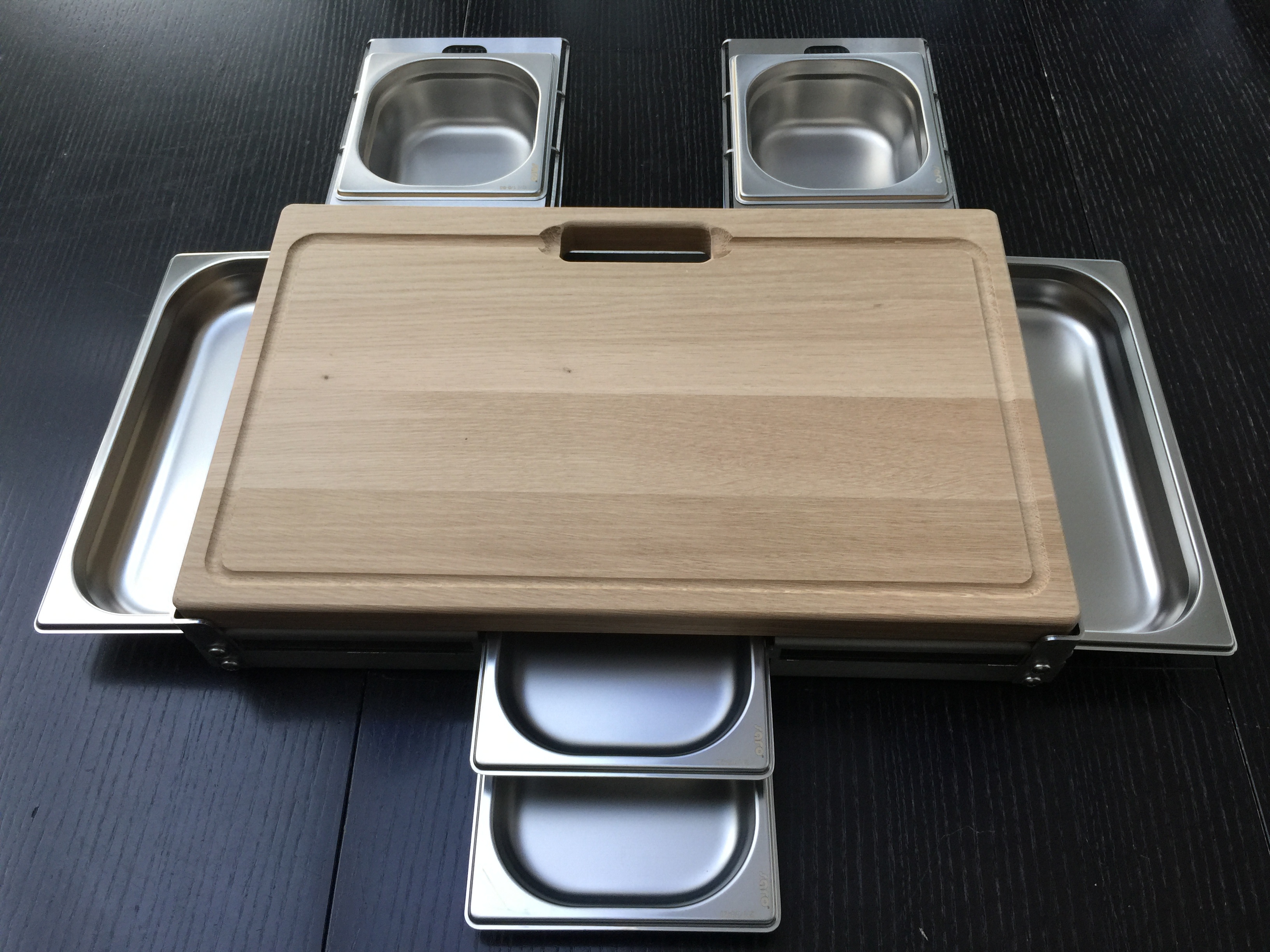 Der Hermesbote hat heute am späten Nachmittag das schon erwartete Paket abgegeben. Habe dann umgehend mein neues Schneidebrett zusammengebaut und mit diversen GN-Schalen bestückt: