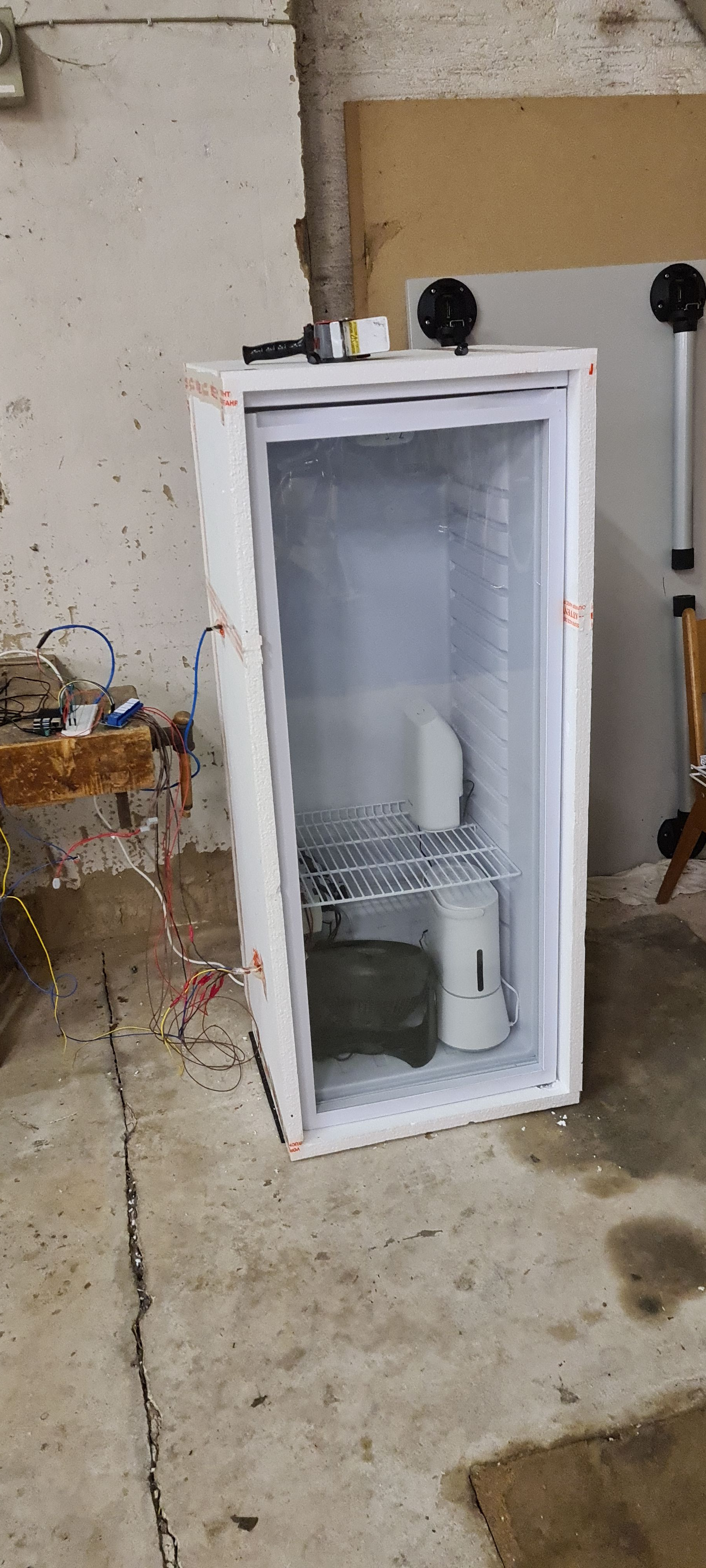 Ich habe noch bevor wir das Fleich rein haben eine Styroportür vor den Kühlschrank gebaut - damit hat sich die Zeit, bis die Kühlung angeht verdoppelt! Bei 2-4C° sind es ca. 8min kühlen und 20min warten. Hätte nicht gedacht das es so viel hilft. Habe dann allerdings probleme mit Wasserbildung zwischen Styropor und Türaussenseite - war halb so wild und ist nach einigem Testen auch nie bis zum Boden gelaufen (zwischen Styropor und Tür sind noch ein paar mm Luft), schön ist das natürlich trotzdem nicht.