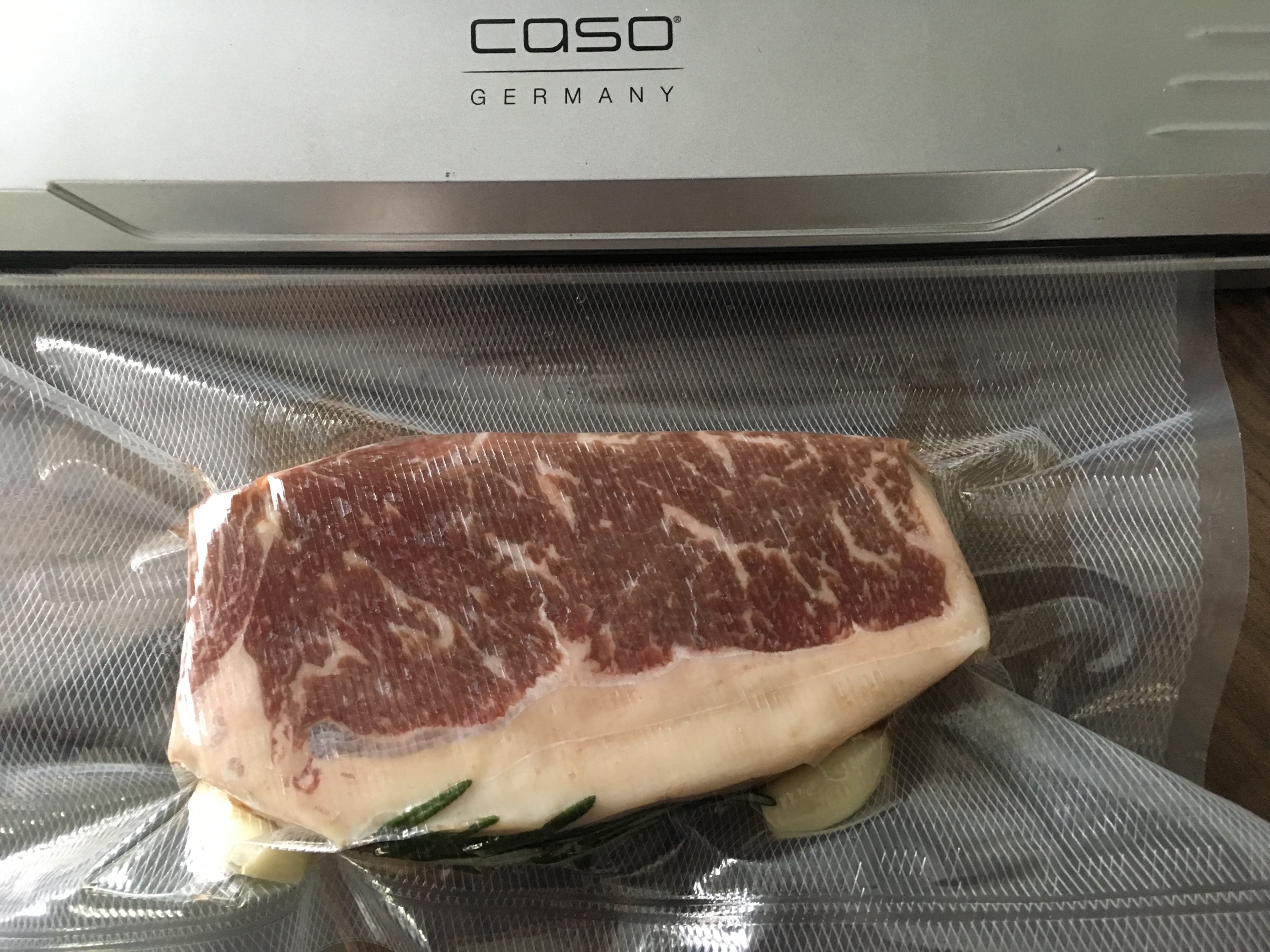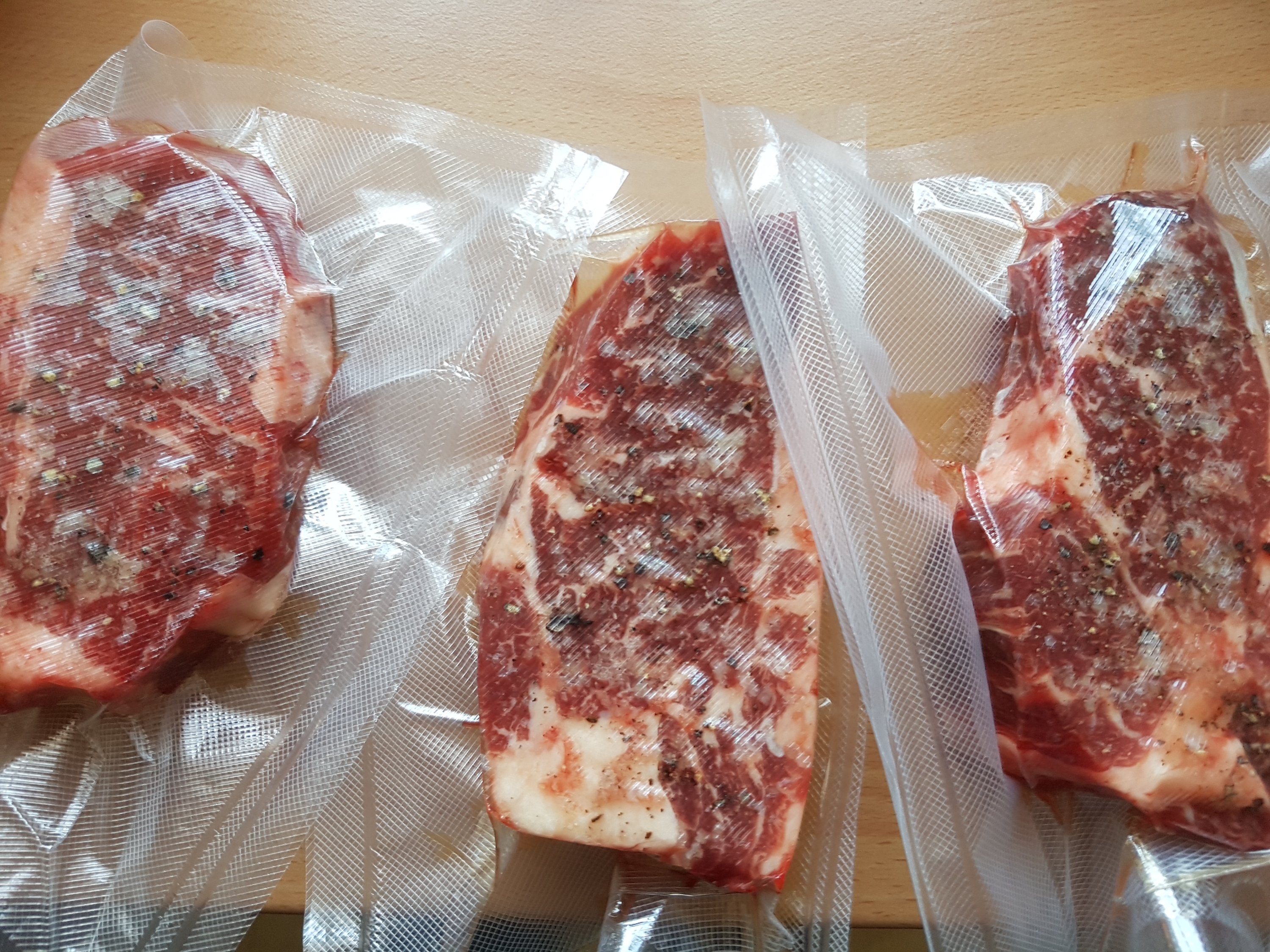 Sodele, ich mache auch gleich wieder Erfahrungen .... und zwar hier mit dem 4 cm Roastbeef vom Australien Angus mit Rosmarin und Knoblauch bei 54 Grad für 4 - 5 Stunden und dann noch das schön marmorierte Txogitxu Filet. Das kommt am Ende auch noch für 2 Stunden mit ins Bad. Natürlich sauber verschweißt nur mit einem Hauch Salz. Über die Temperatur kann man natürlich streiten. Wir mögen es genau so