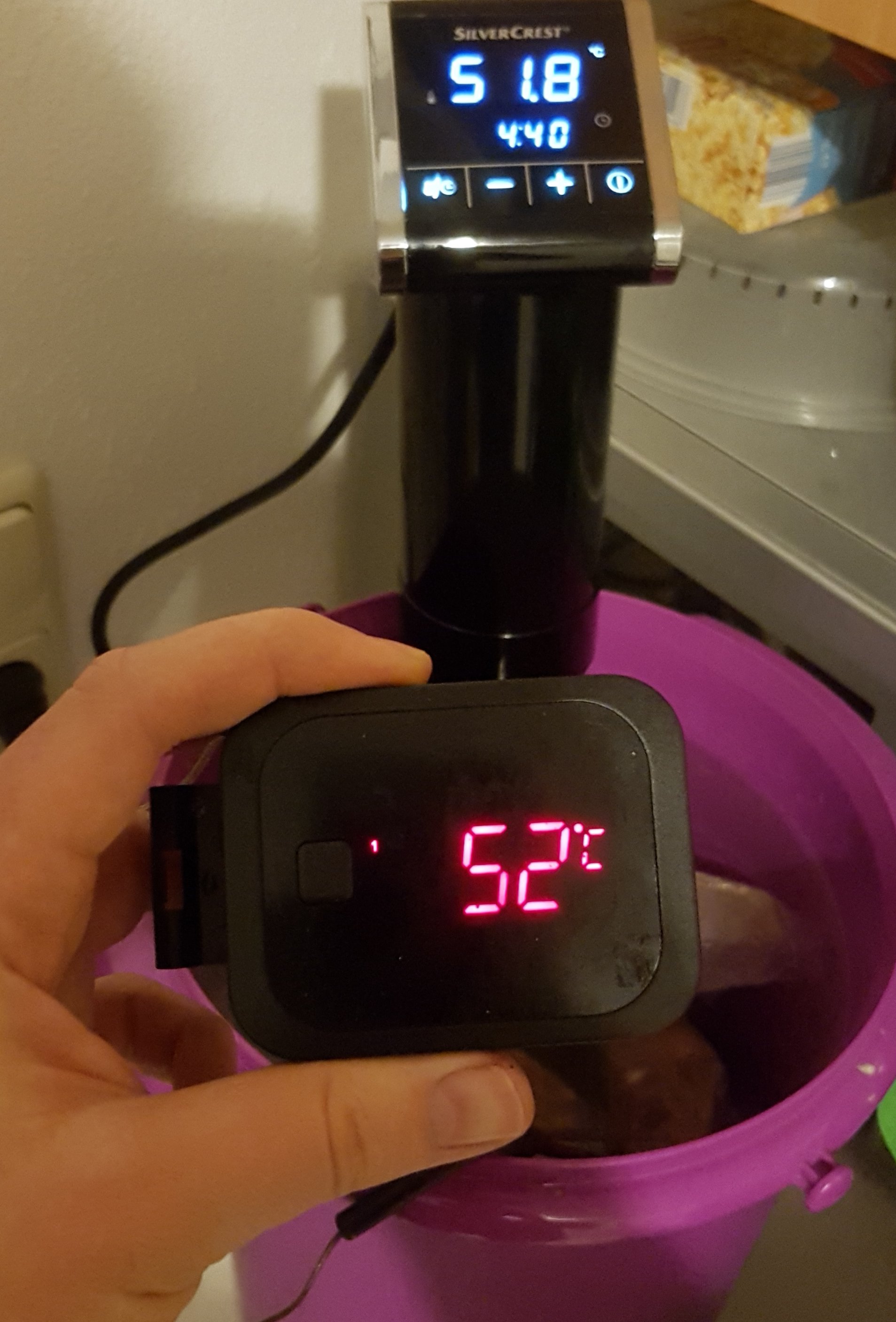 Die Woche hab ich mir mal einen Sous Vide Stick von nem Bekannten ausgeliehen (Silvercrest von Lidl).