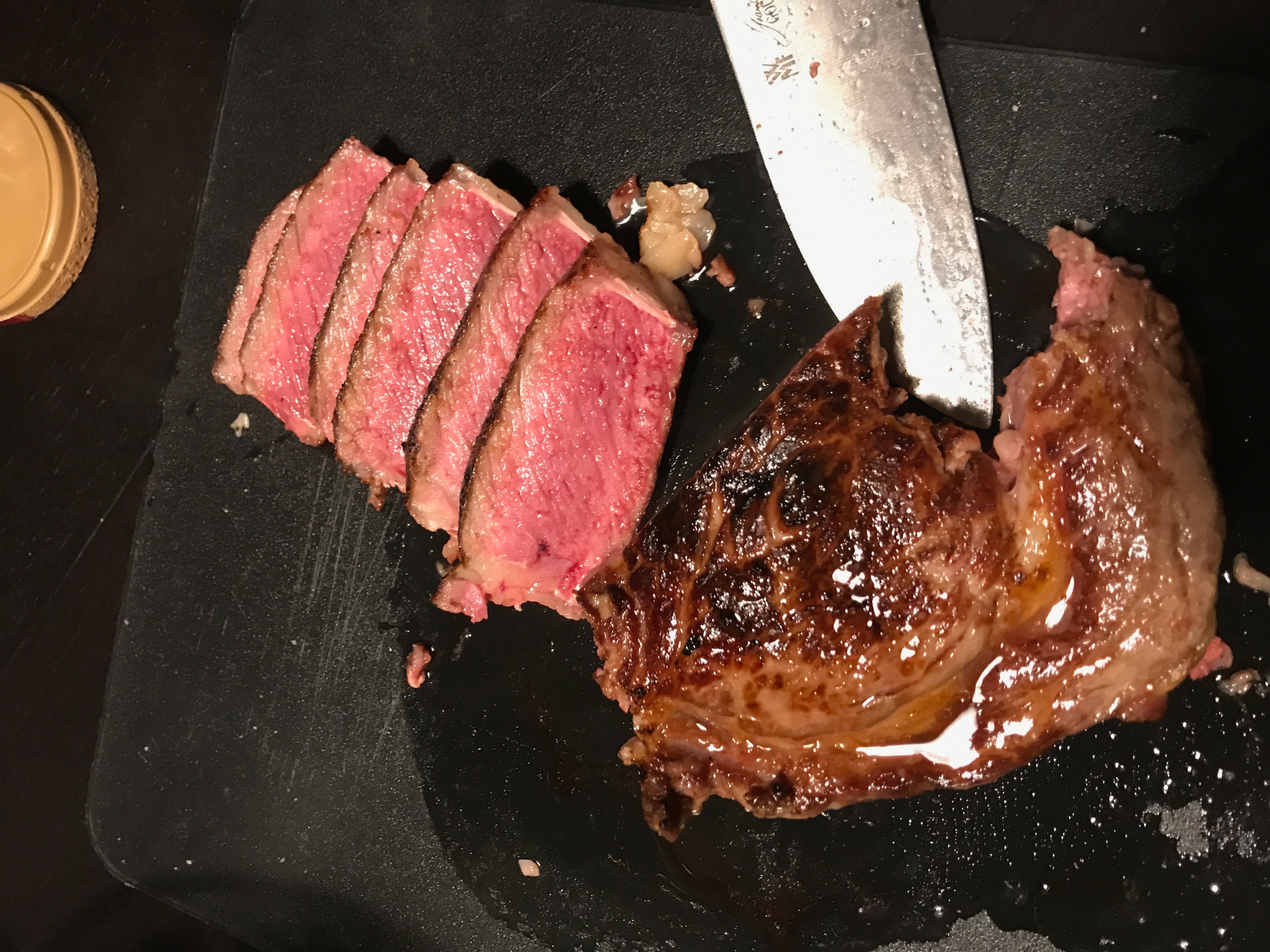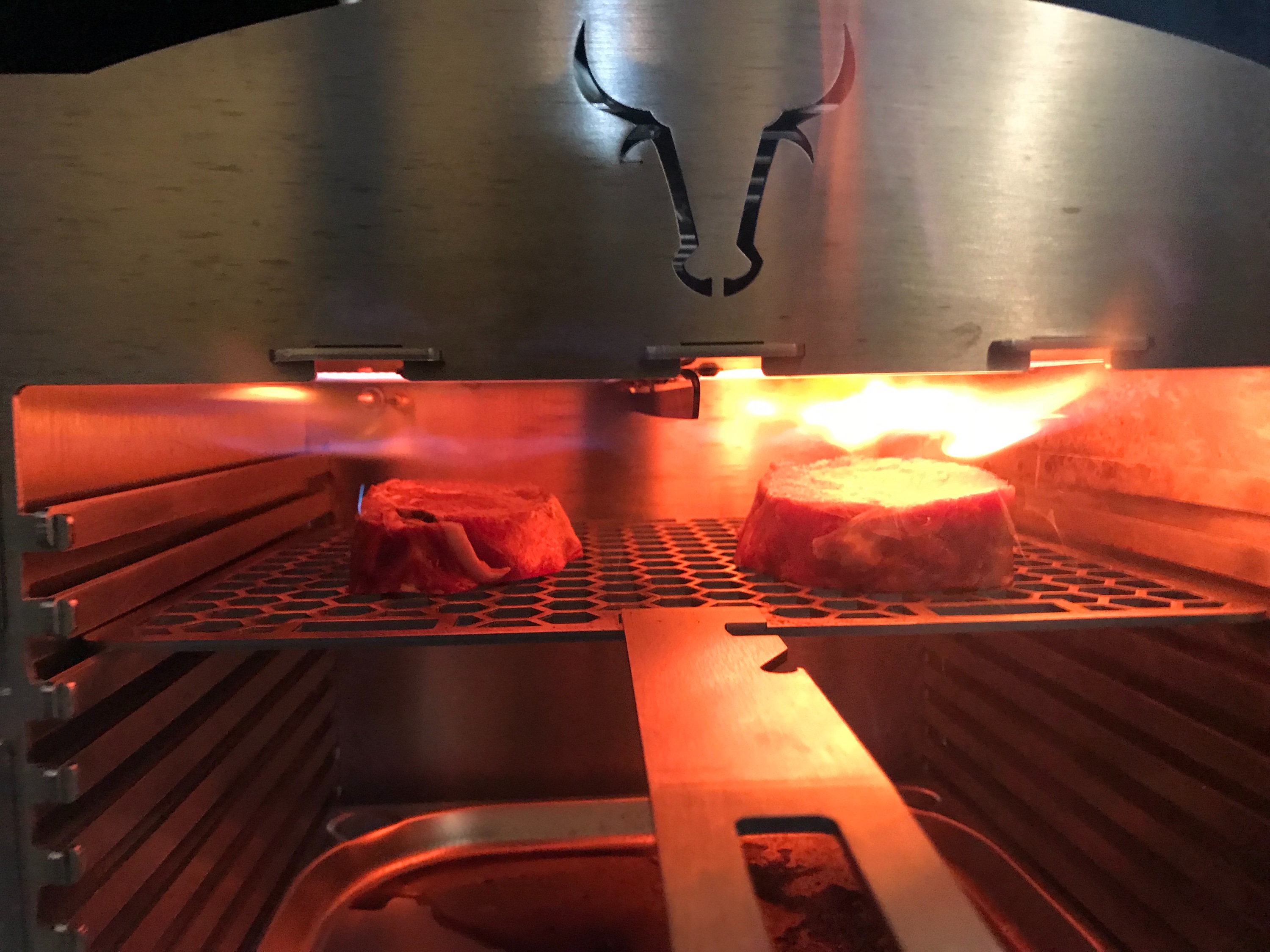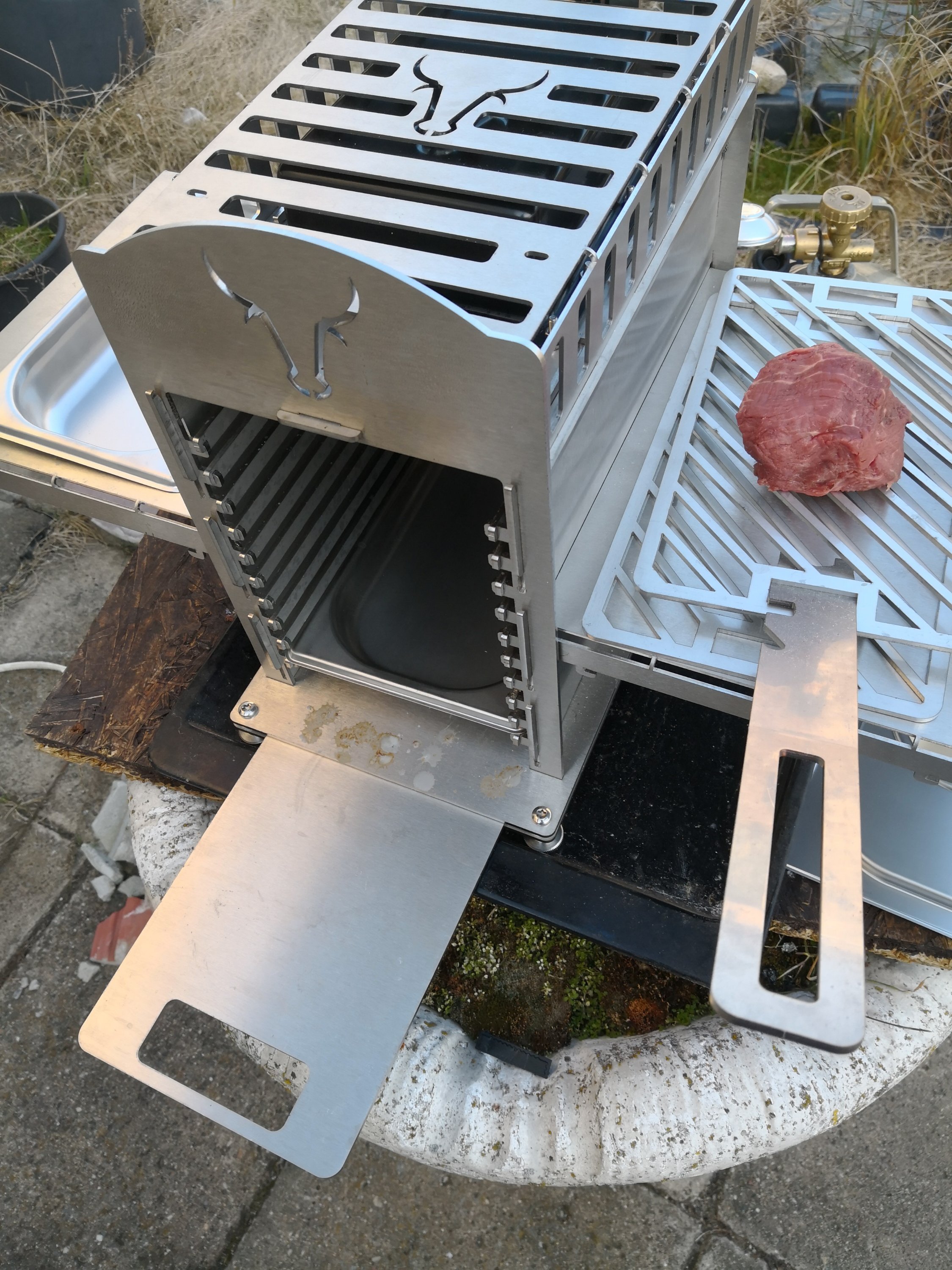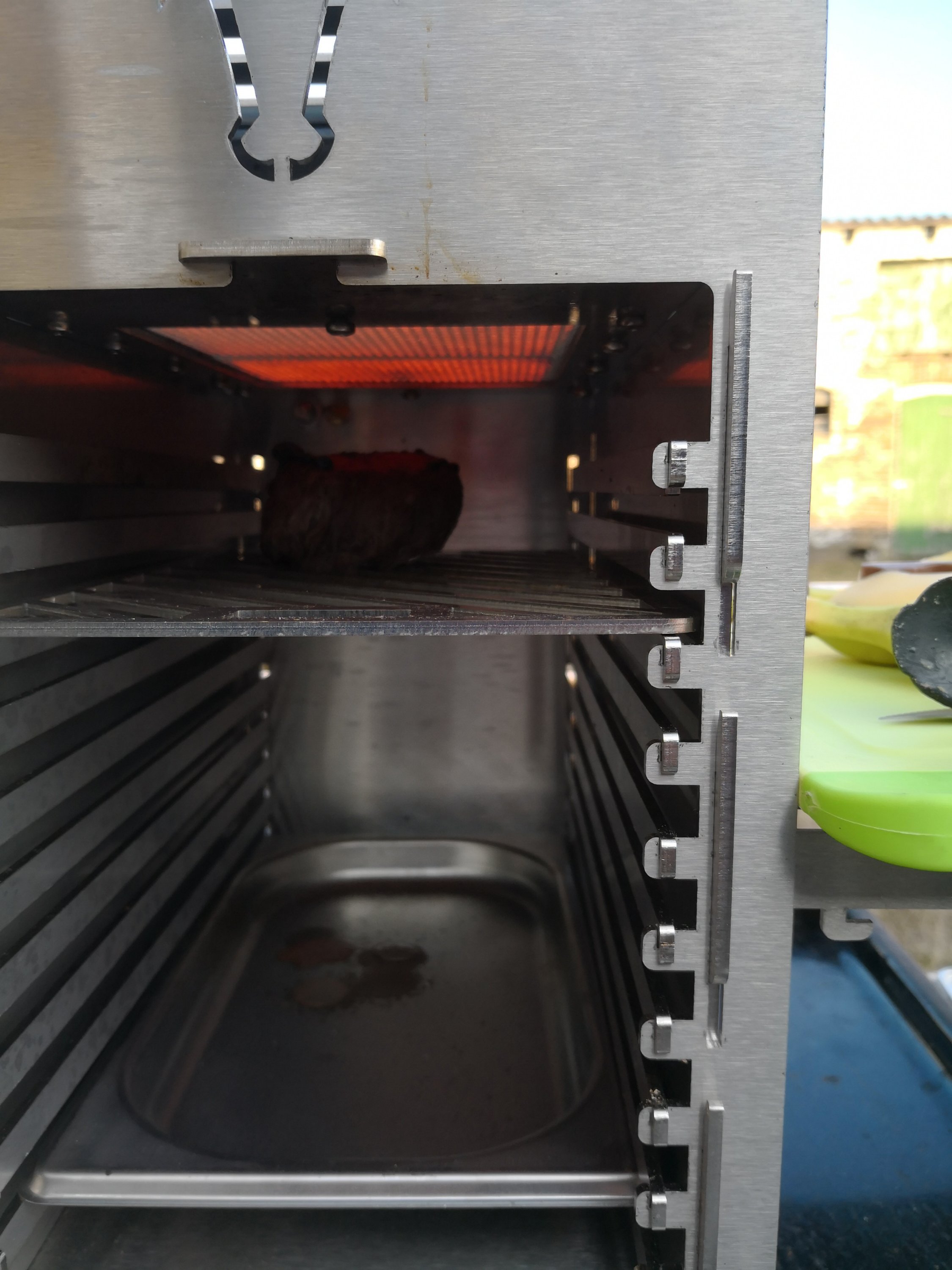 Mein erster Test des OHG. Ich habe mir was besonderes gegönnt und Dry Age Entrecote besorgt. Beide Seiten jeweils 1 Minute, danach nach ganz unten und 2 Minuten von beiden Seiten ziehen lassen. Dabei habe ich den Brenner dann auf minimale Leistung gestellt. Ich bin sehr zufrieden mit dem Ergebnis.