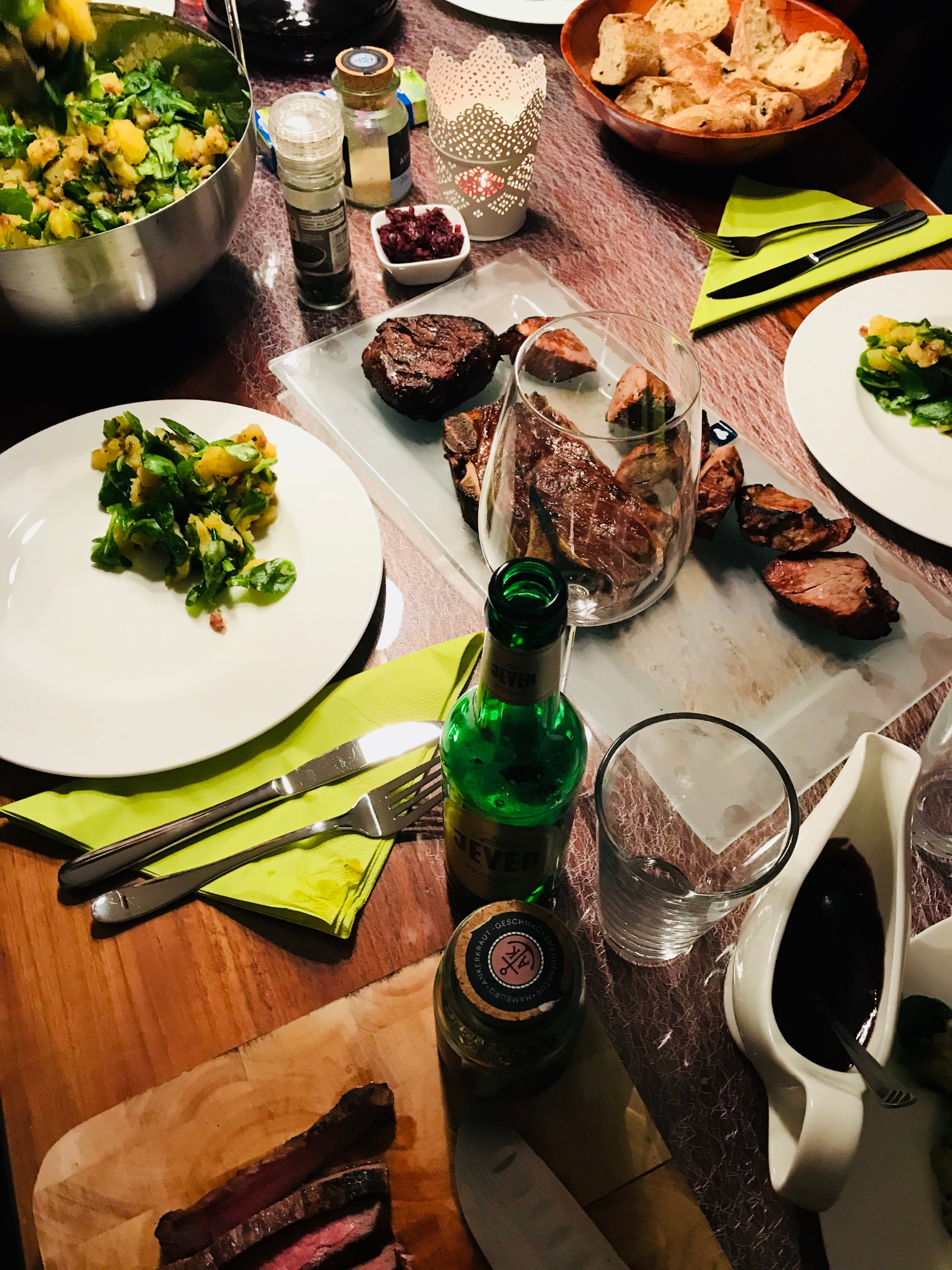 Gewürze von Ankerkraut, ein Cuvée und Bier haben alles abgerundet Teile vom Aufgeschnittenen Flank und Cote de Boeuf Dazu gab es Oliven Baguette und Kartoffel-Feldsalat mit Speckwürfeln Waren alle Mega begeistert und es hat allen super geschmeckt.