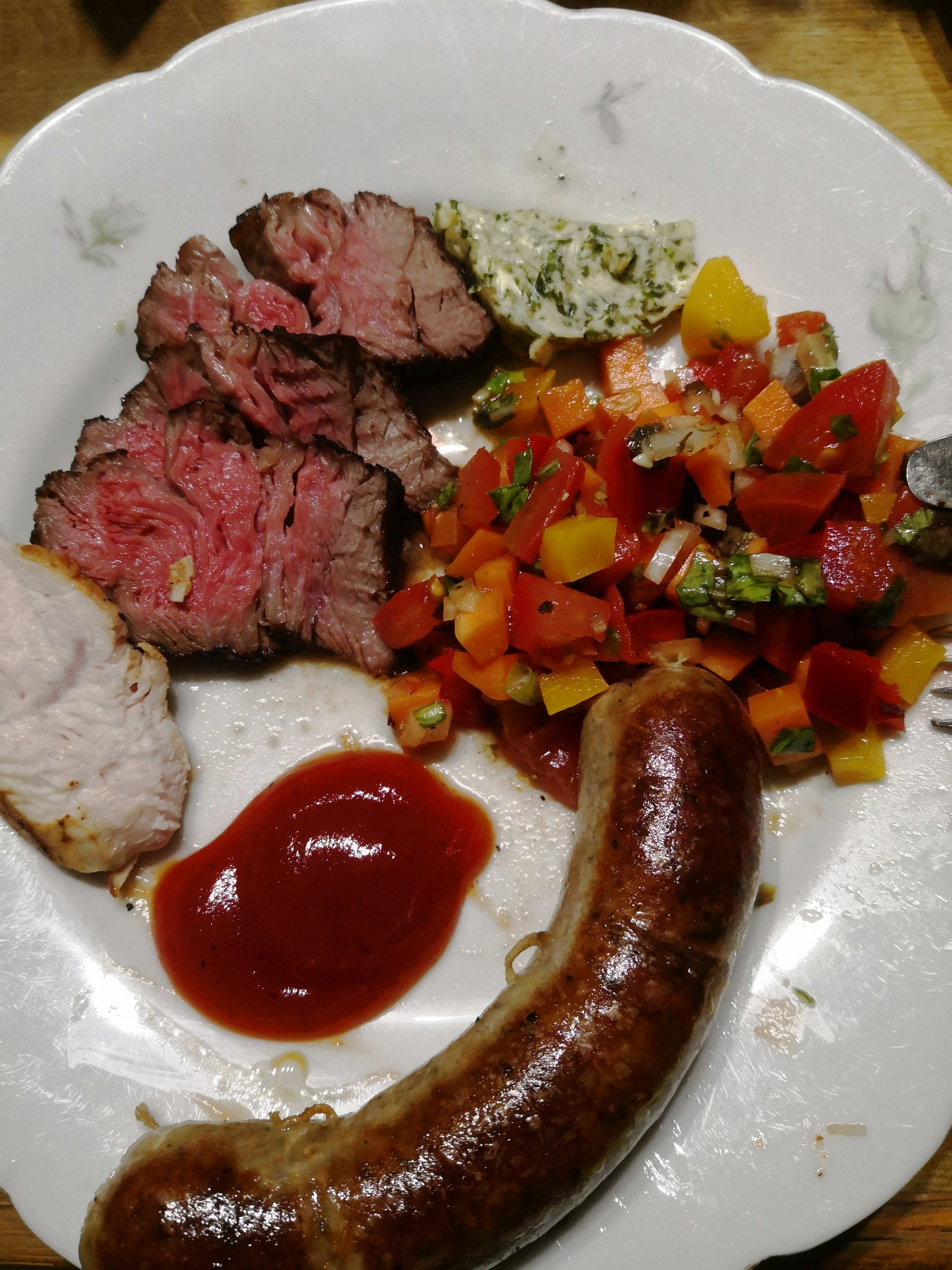 Hier noch ein Tellerbild. Selbst gemachte Kräuterbutter war natürlich auch dabei.