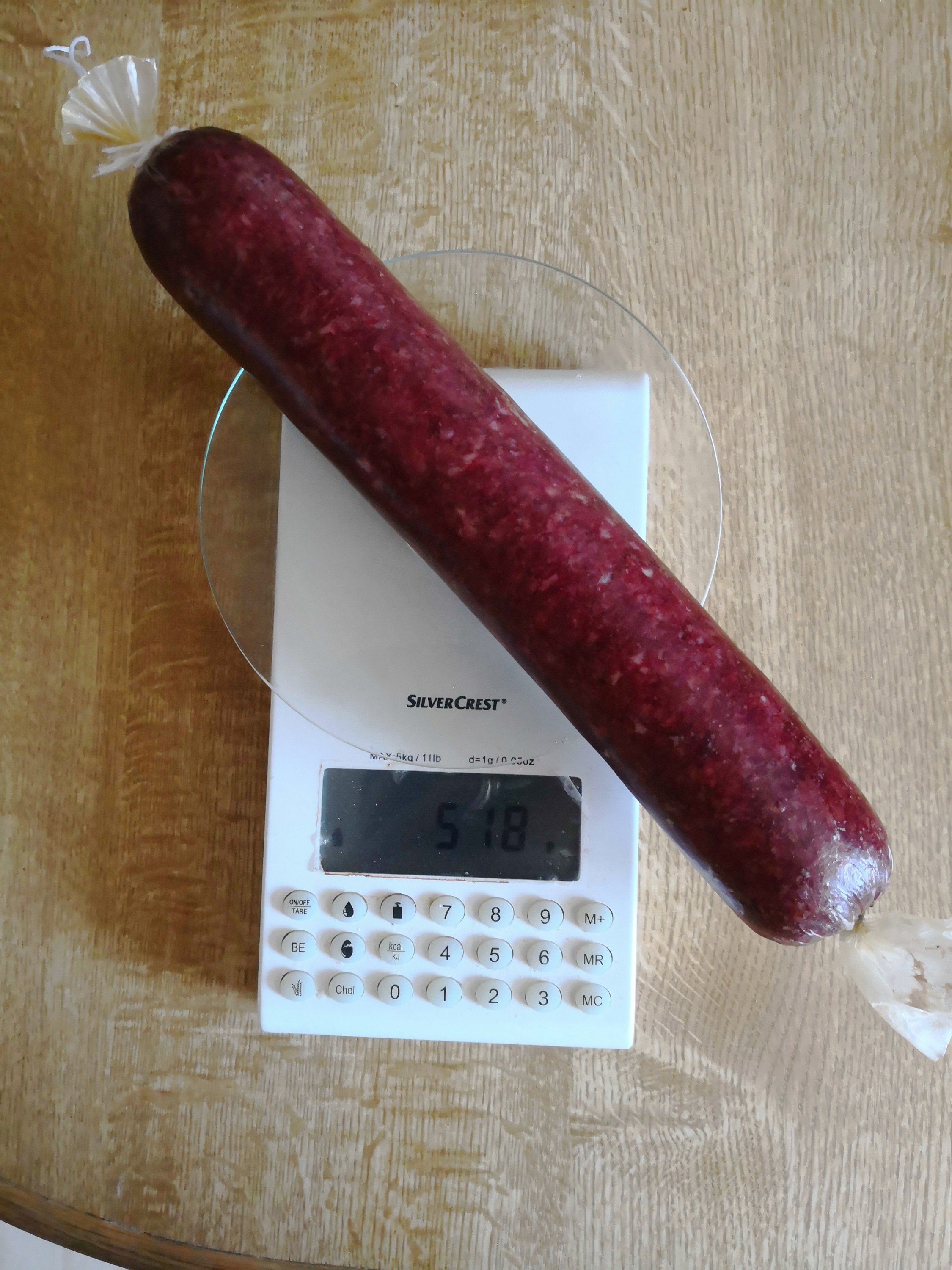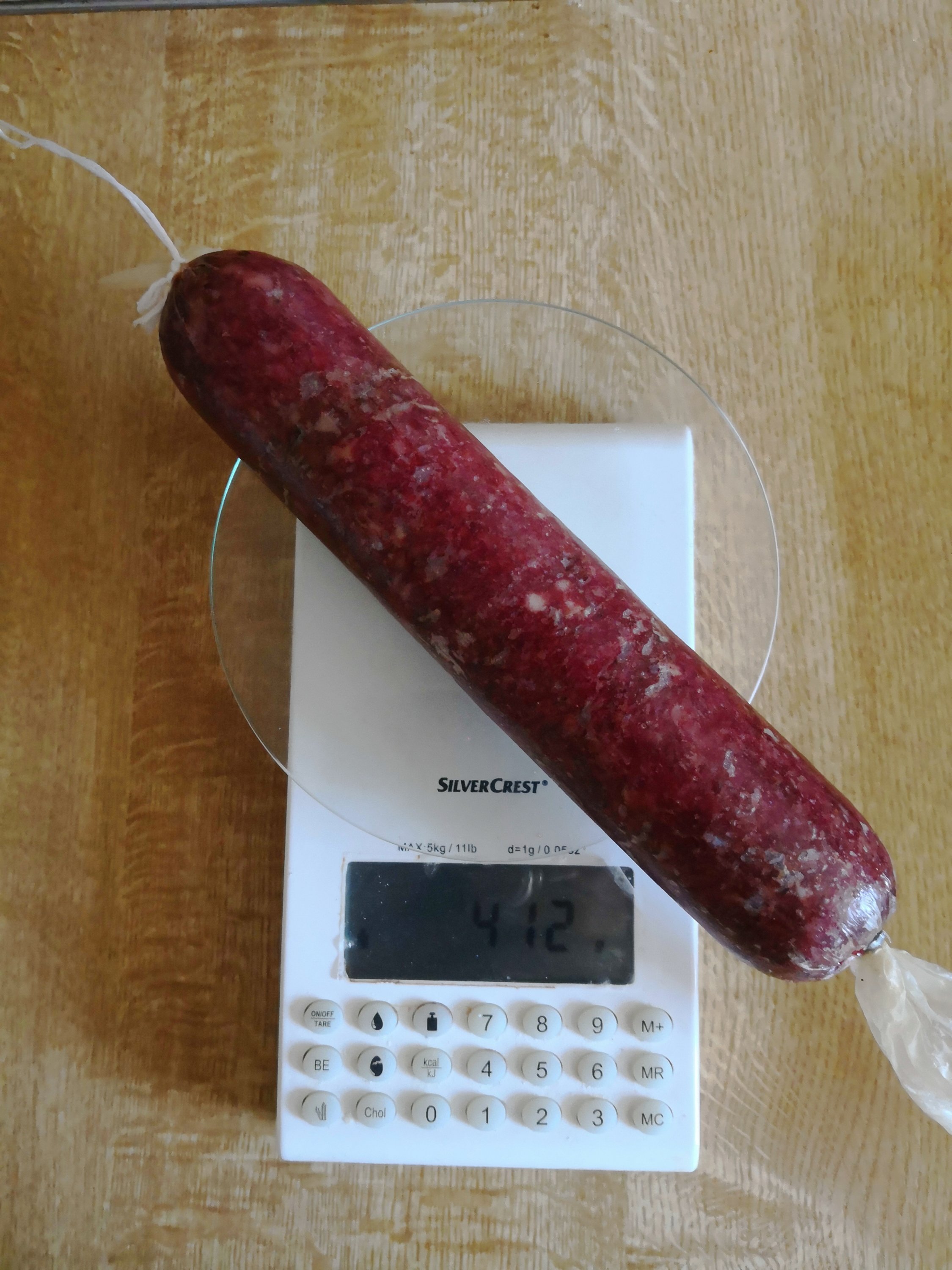 Die große Wurst hat bei ca. 400 g 30% an Gewicht verloren, die kleine sollte bei 320 g fertig sein.