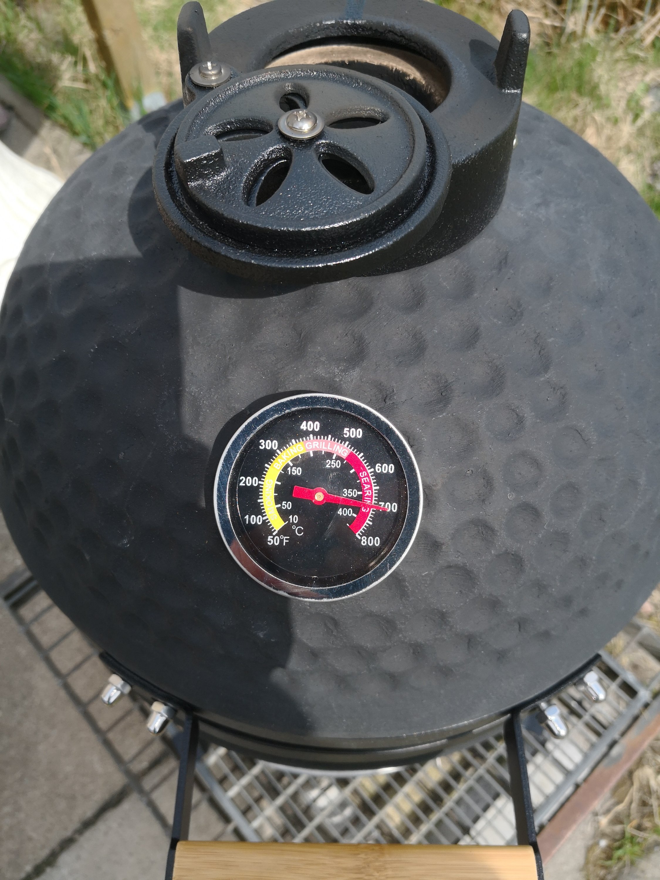 So, habe heute das Ei eingeweiht. Briketts soll ich nicht nehmen, die Grillkohle war alle, also habe ich Holz genommen.
