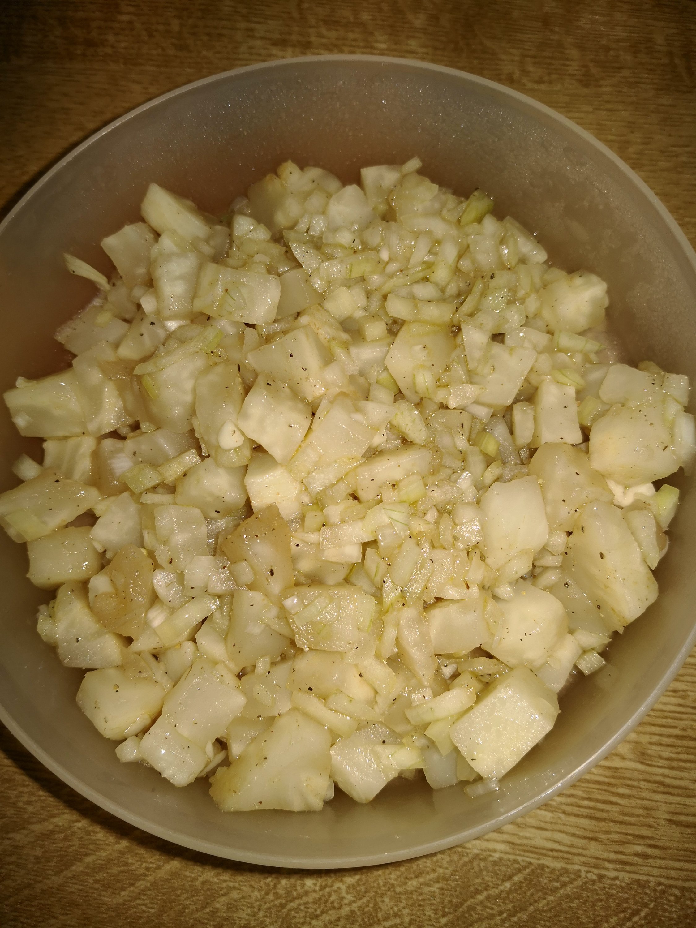 Den Selleriekopf schälen, in Würfel schneiden, im Topf kurz kochen, damit die Würfel nicht zu weich werden. Inzwischen die Zwiebel klein schneiden. Die gekochten Selleriewürfel gut abtropfen lassen. Die Würfel in den Topf mit den Zwiebeln geben, nach Geschmack mit Pfeffer und Salz, Essig und Öl würzen.