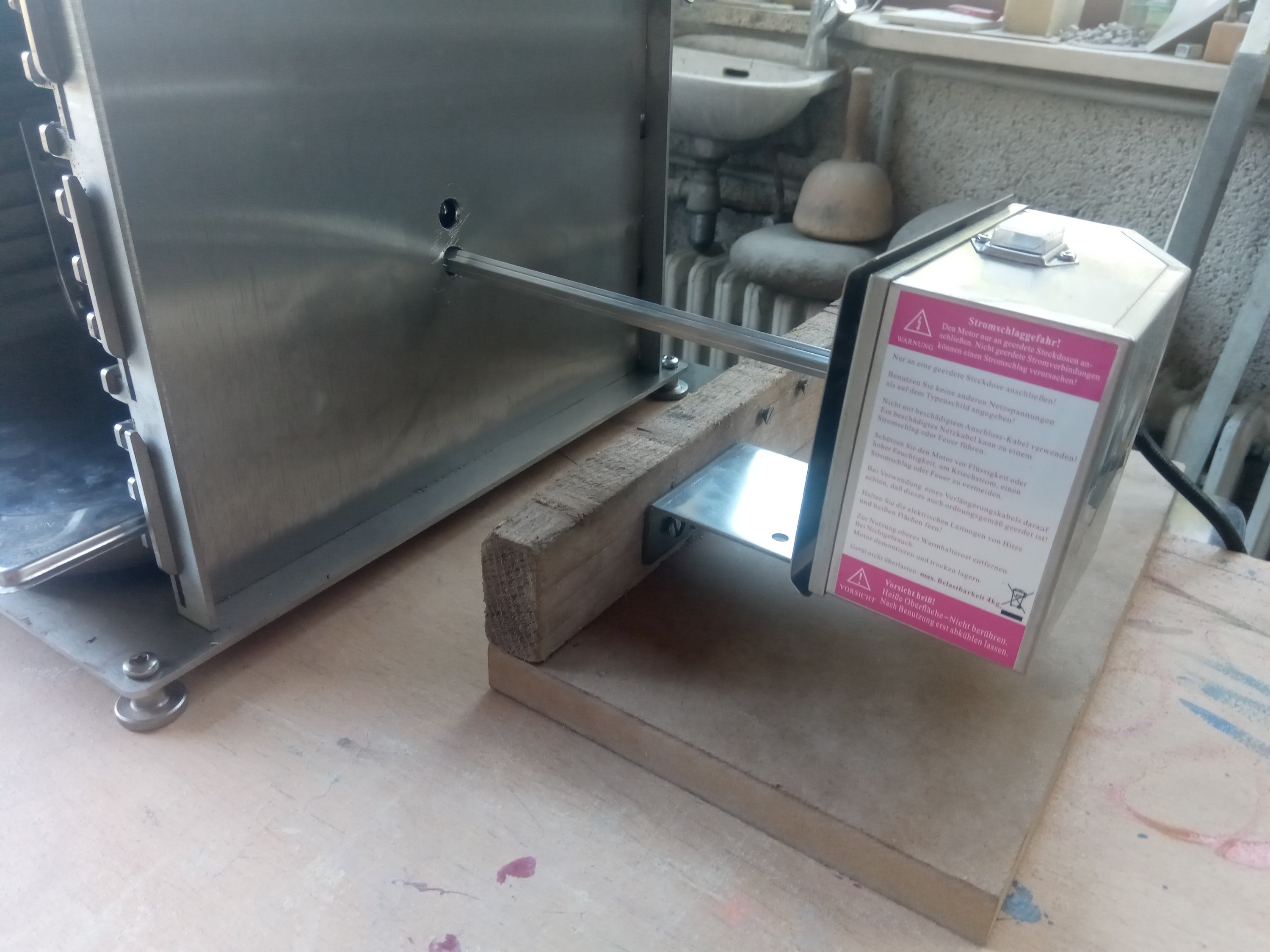 Der Motor wird mittels einem 8/8er Aluvierkant (Edelstahl war gerade nicht greifbar) verbunden, hier jetzt eine provisorische Holzaufnahme, da kommt dann später etwas passendes zum Grillbereich.