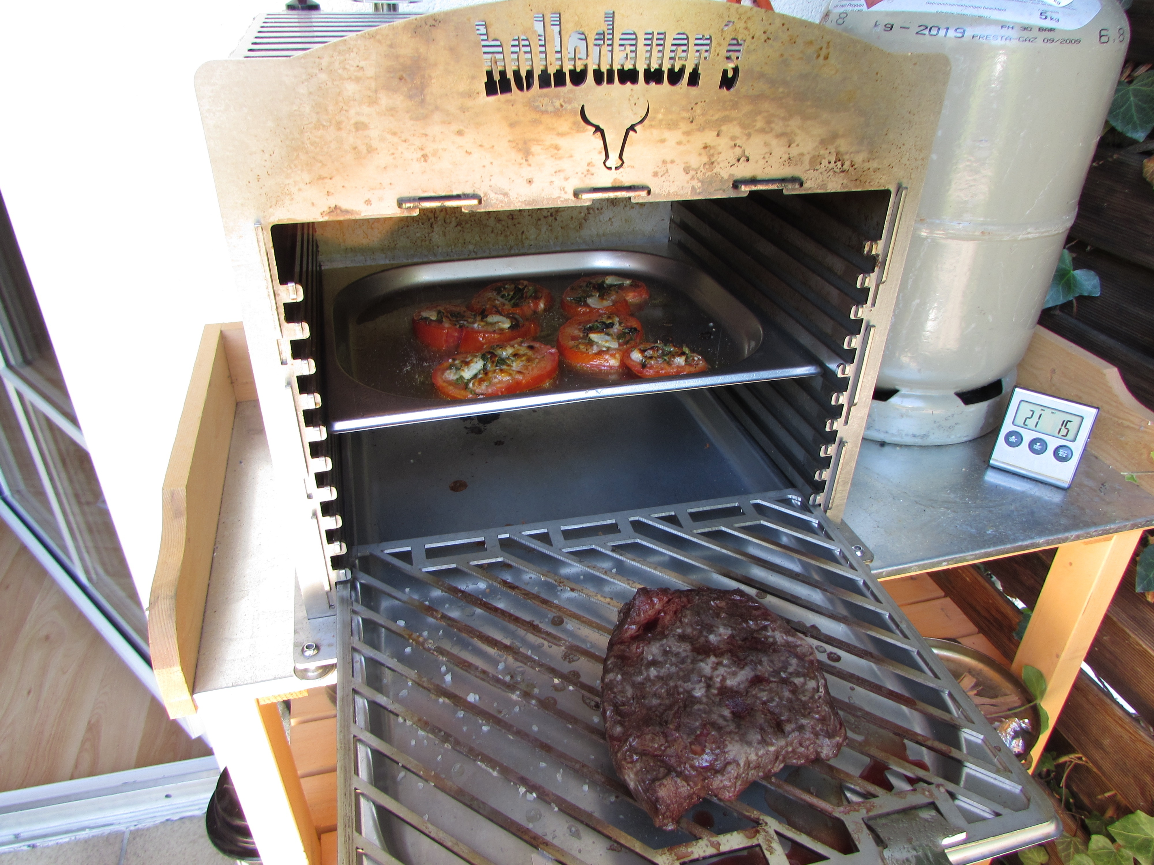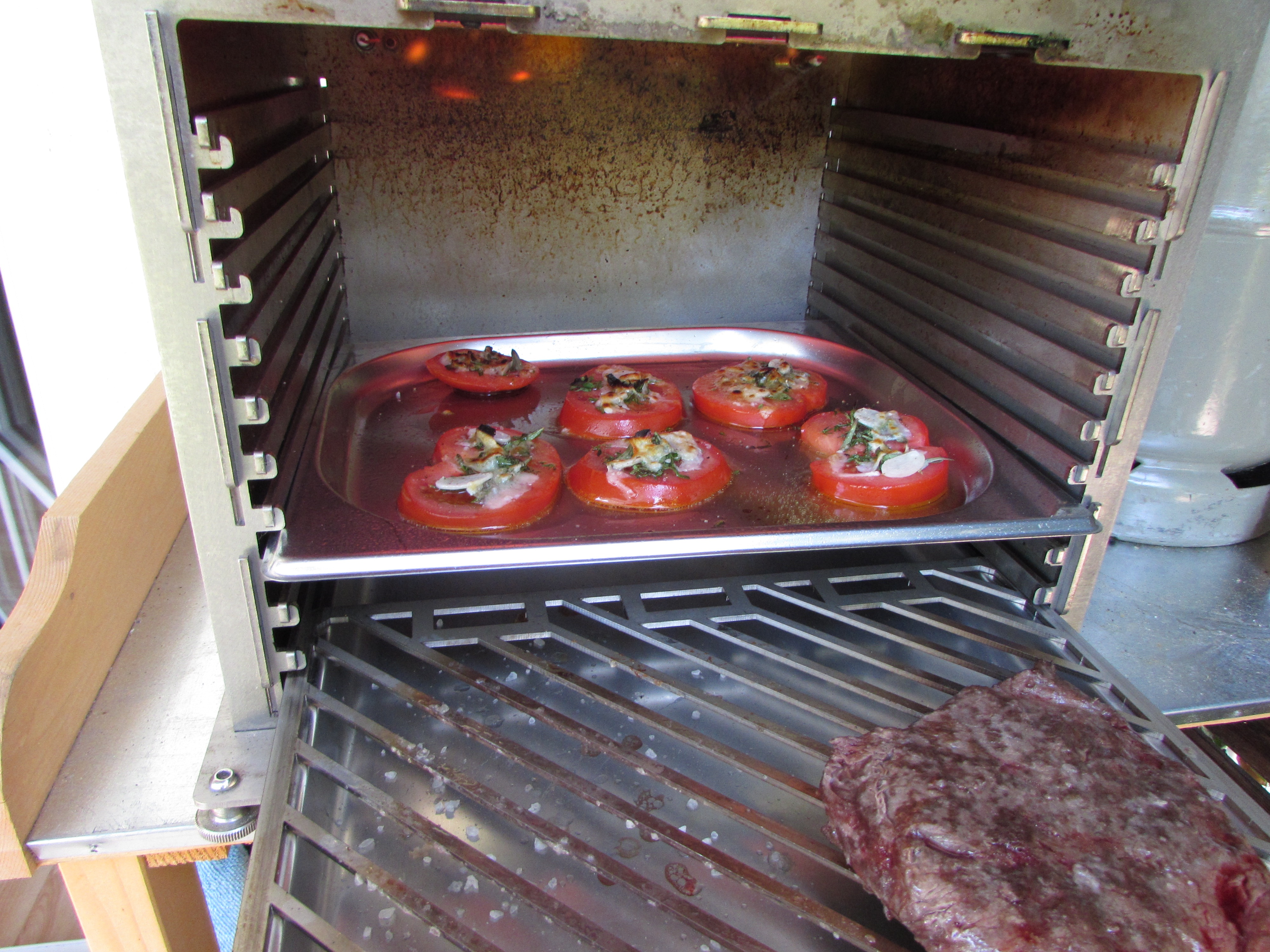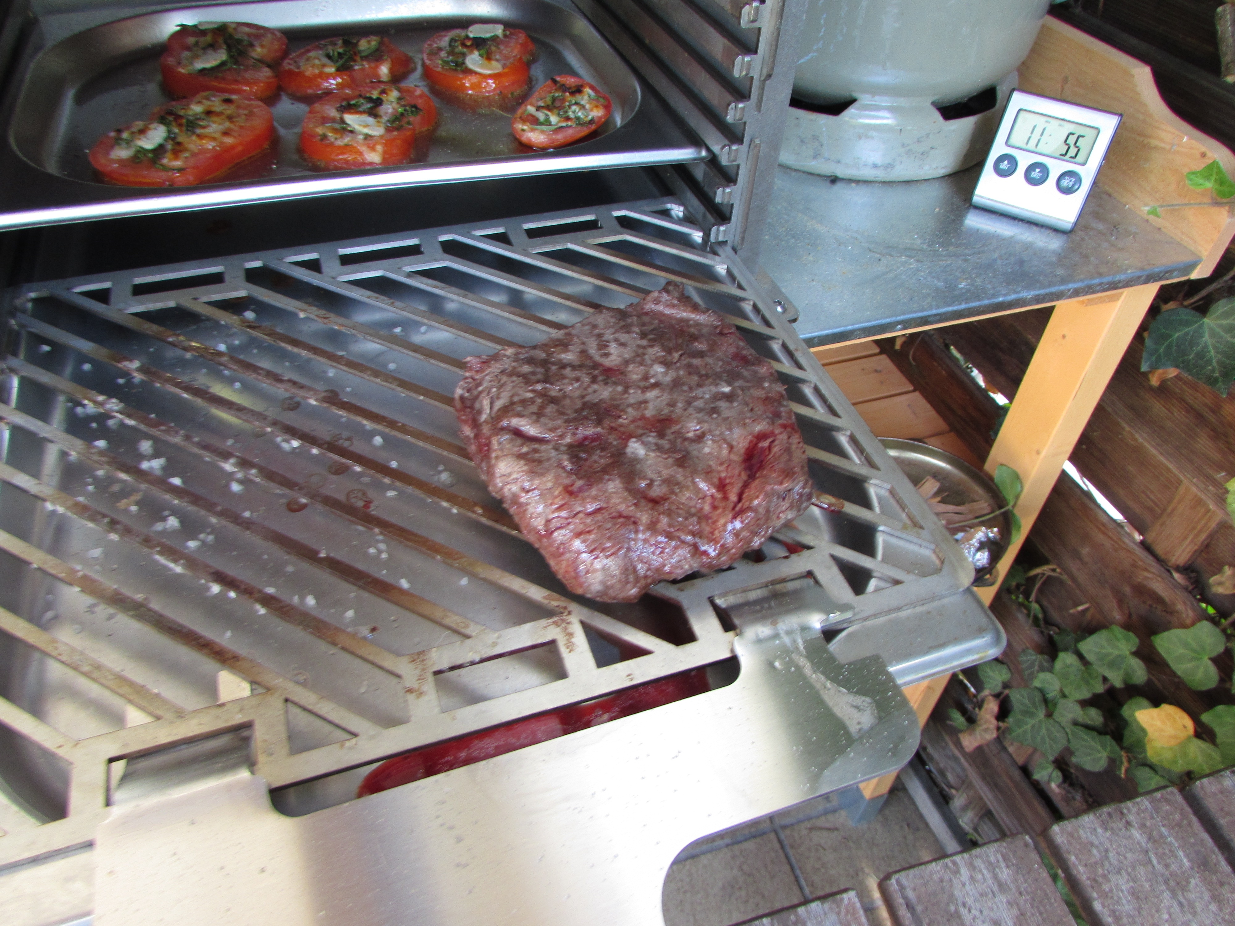 Das Flat Iron ( 4 - 6 Wochen gereift) wurde mit Erdnussöl bepinselt und mit groben Meersalz gewürzt. Die Tomatenscheiben hat mein Schatz verfeinert mit Meersalz, Rosmarin, Thymian, frischem Knoblauch, Olivenöl und Parmesan.