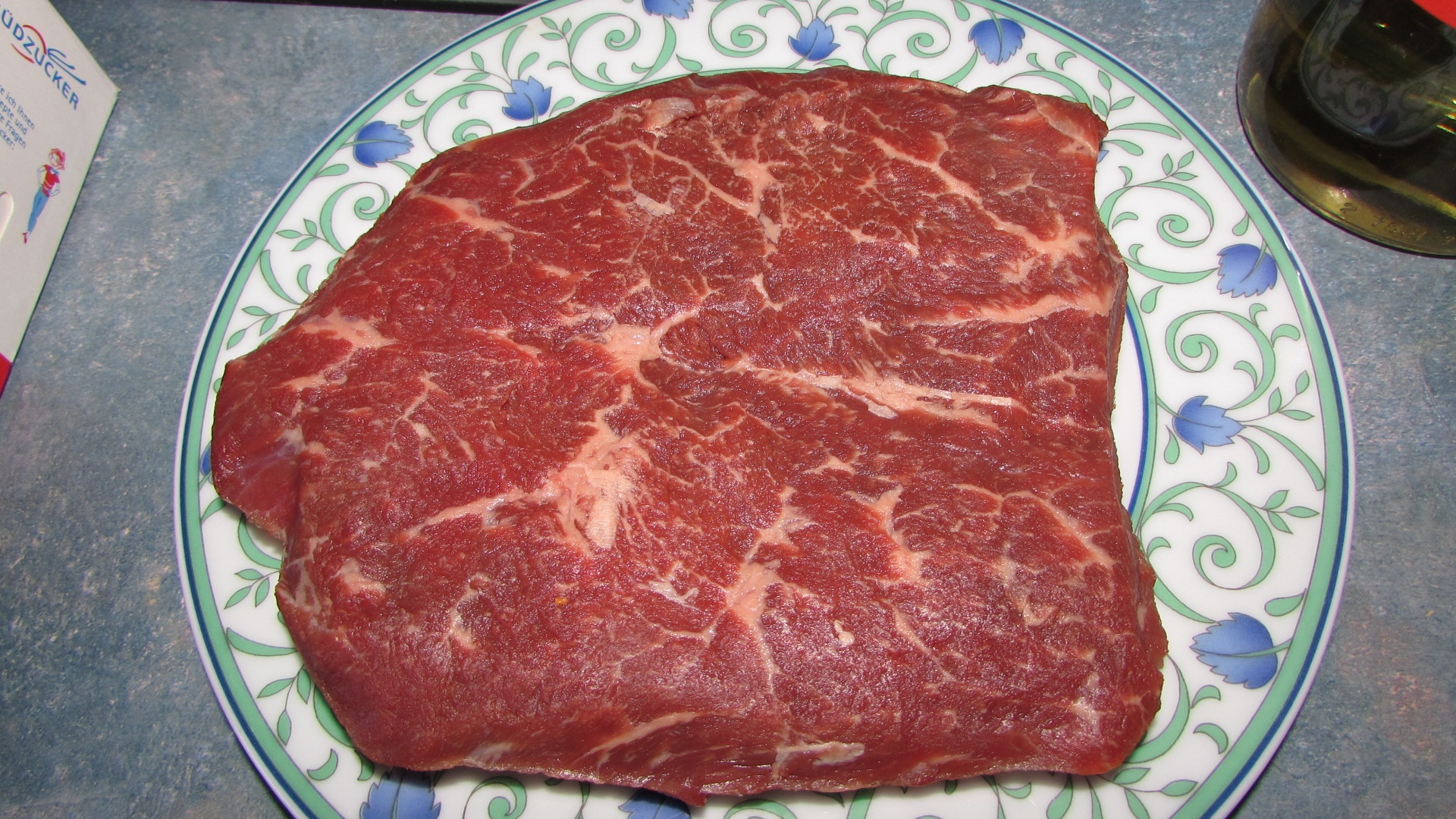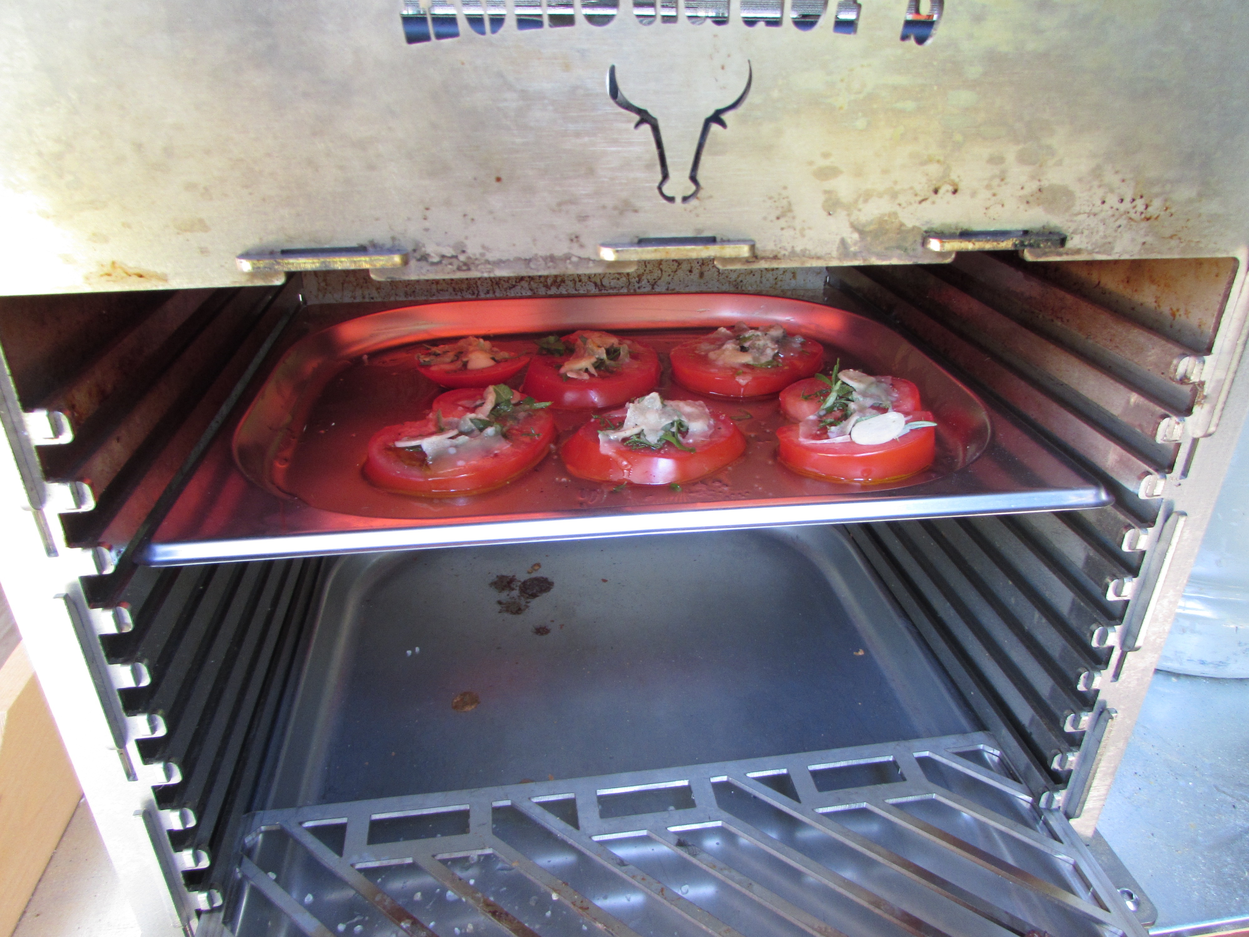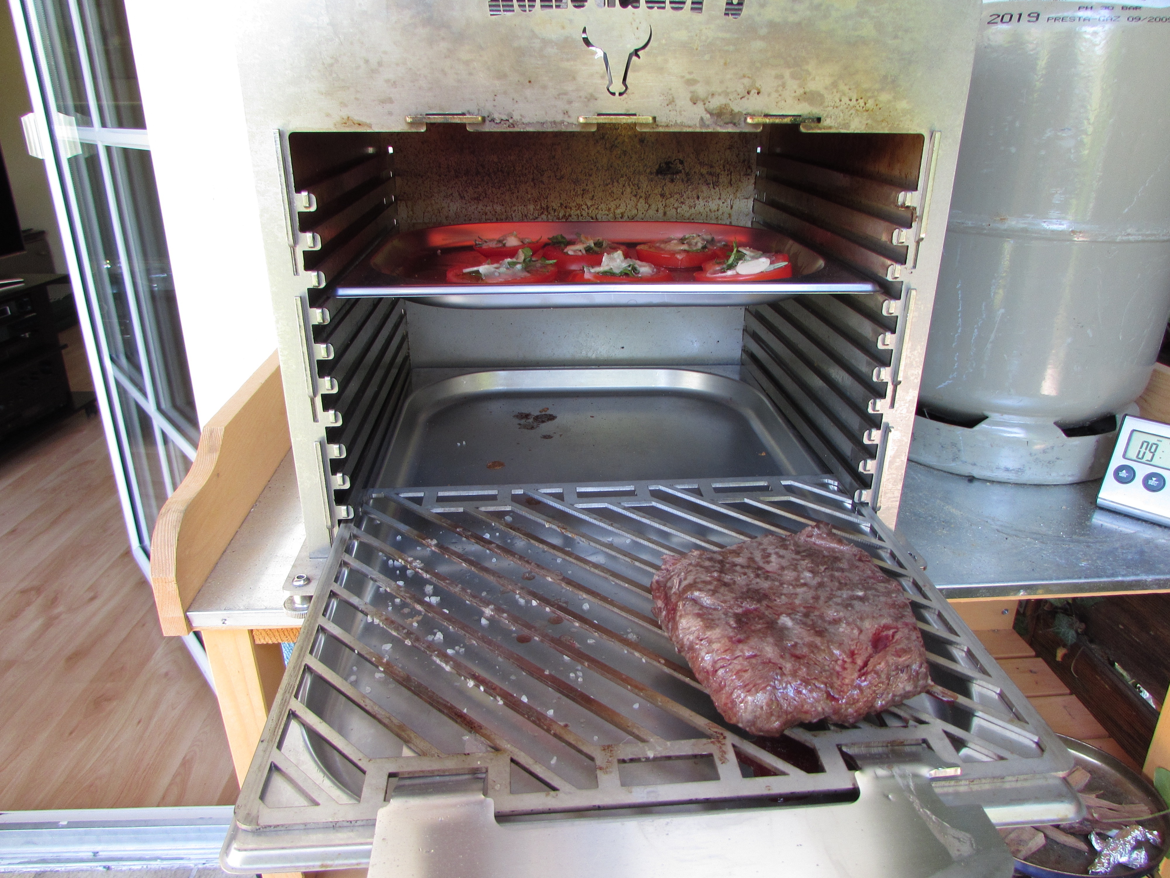 Das Flat Iron ( 4 - 6 Wochen gereift) wurde mit Erdnussöl bepinselt und mit groben Meersalz gewürzt. Die Tomatenscheiben hat mein Schatz verfeinert mit Meersalz, Rosmarin, Thymian, frischem Knoblauch, Olivenöl und Parmesan.