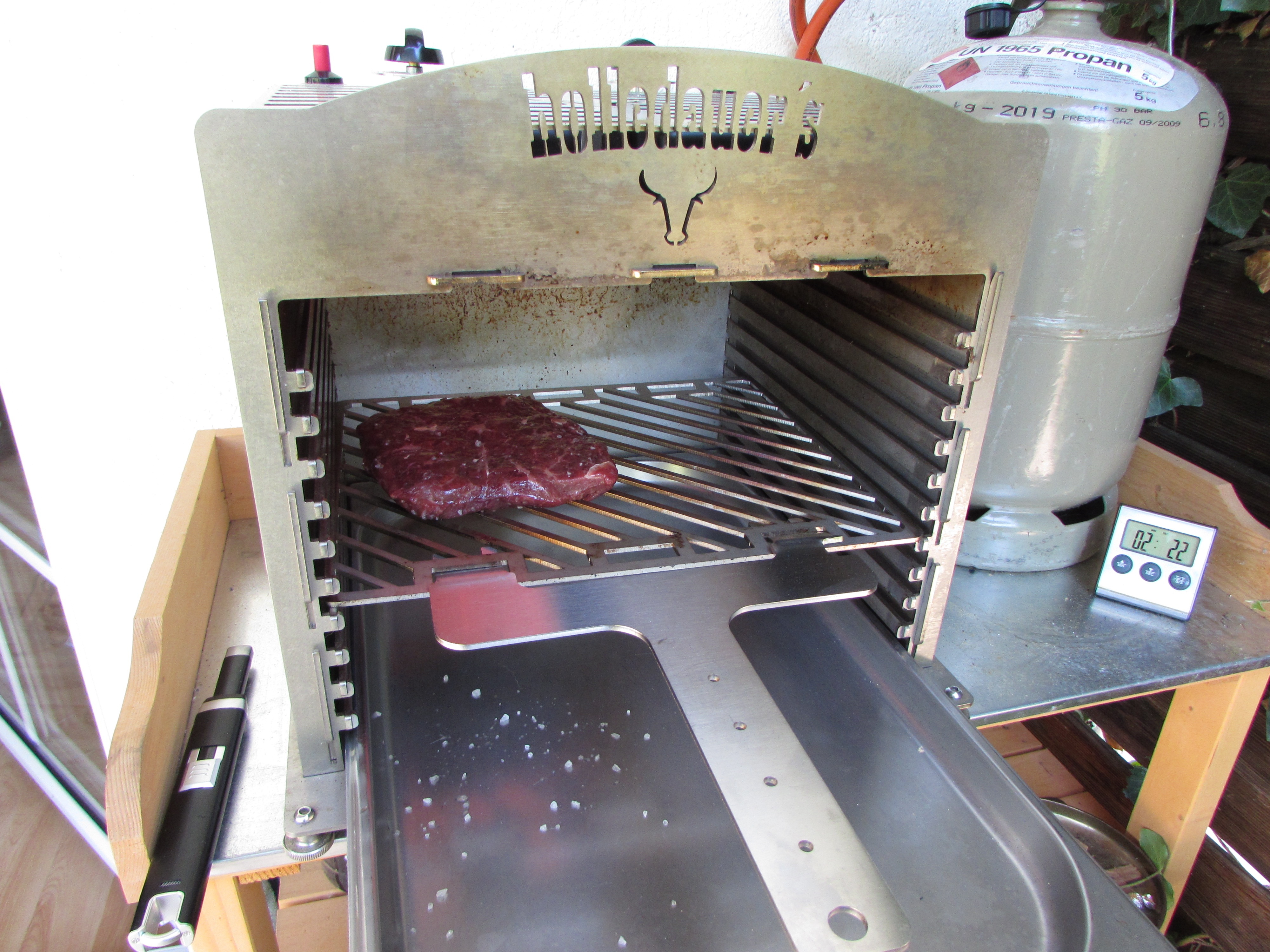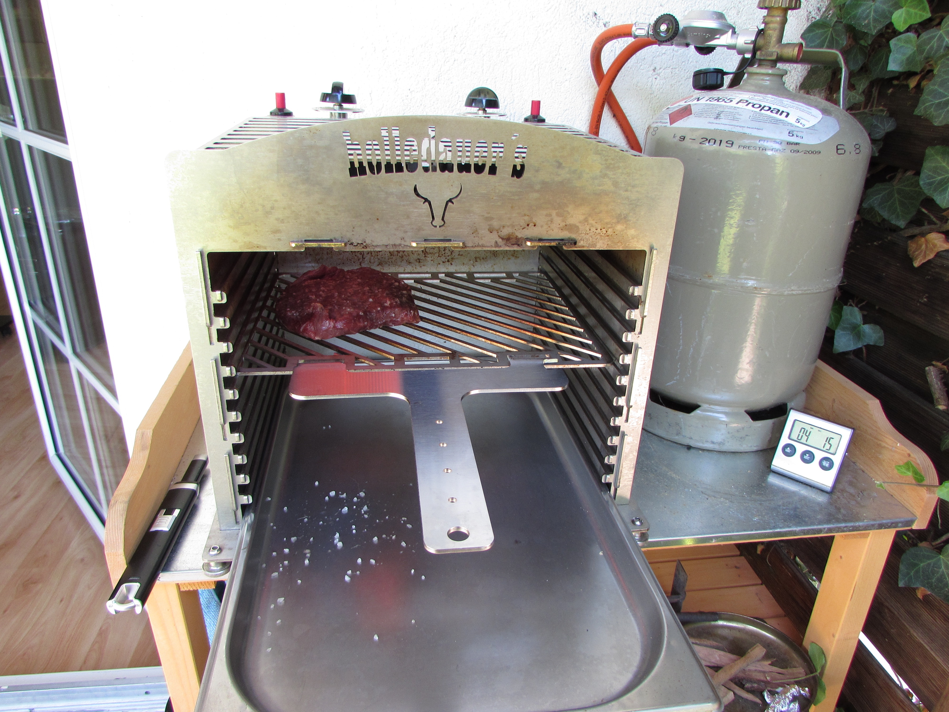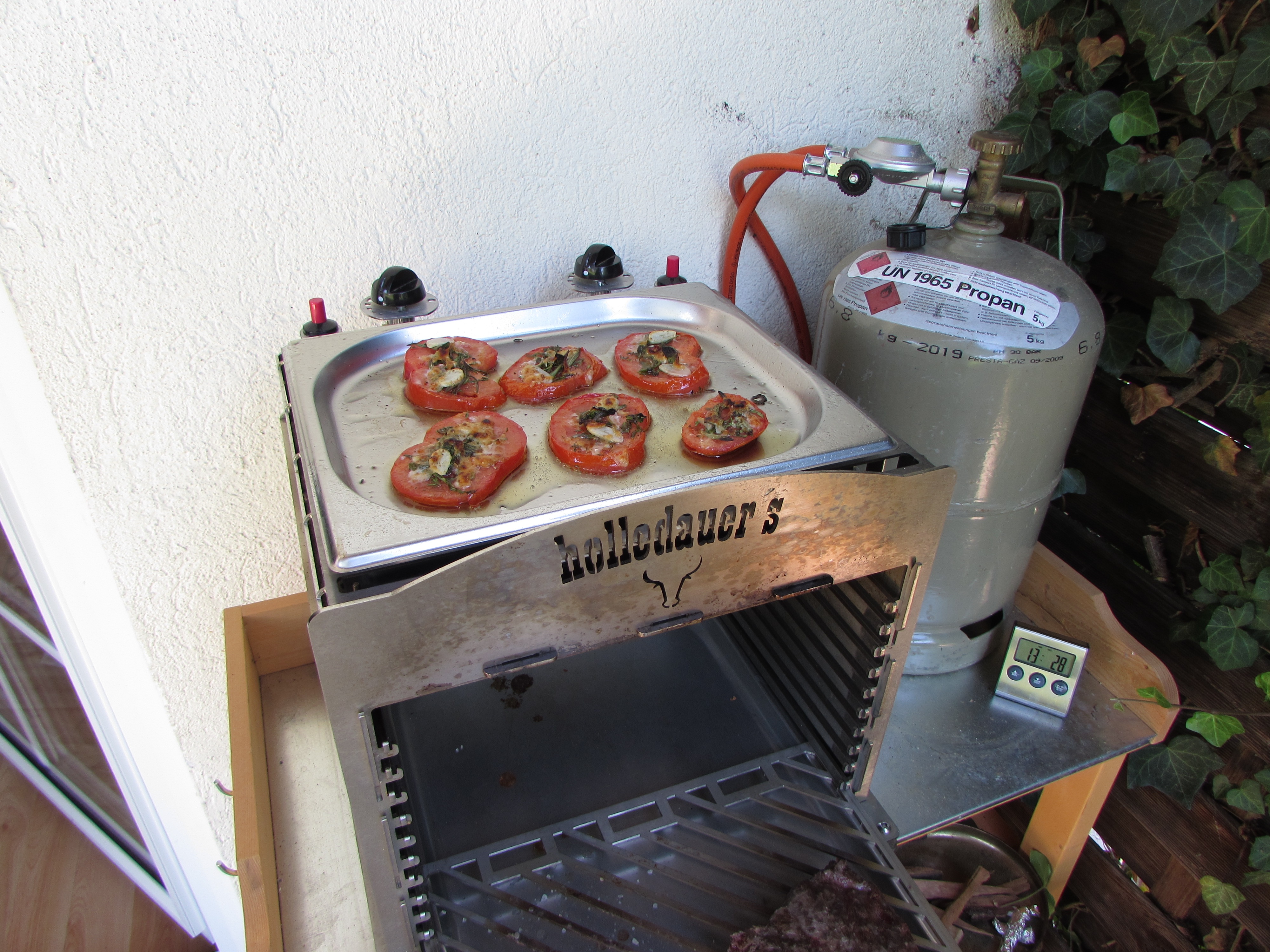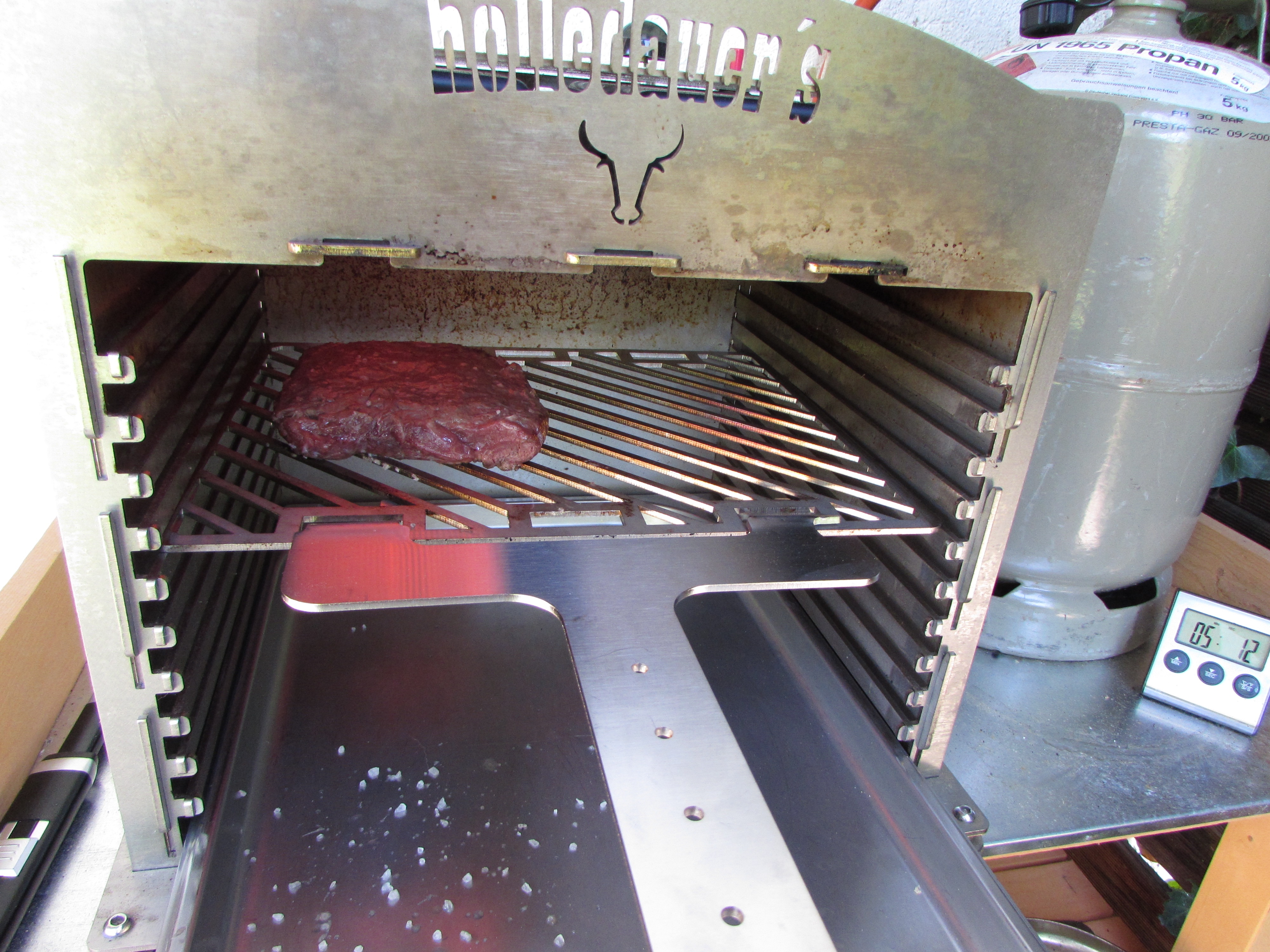 Nur der linke Brenner war aktiv und auf Vollgas Jetzt wurde der rechte Brenner auch aktiviert Beide Brenner auf kleinster Stufe Die Rösti aus der Pfanne Finale Farbgebung