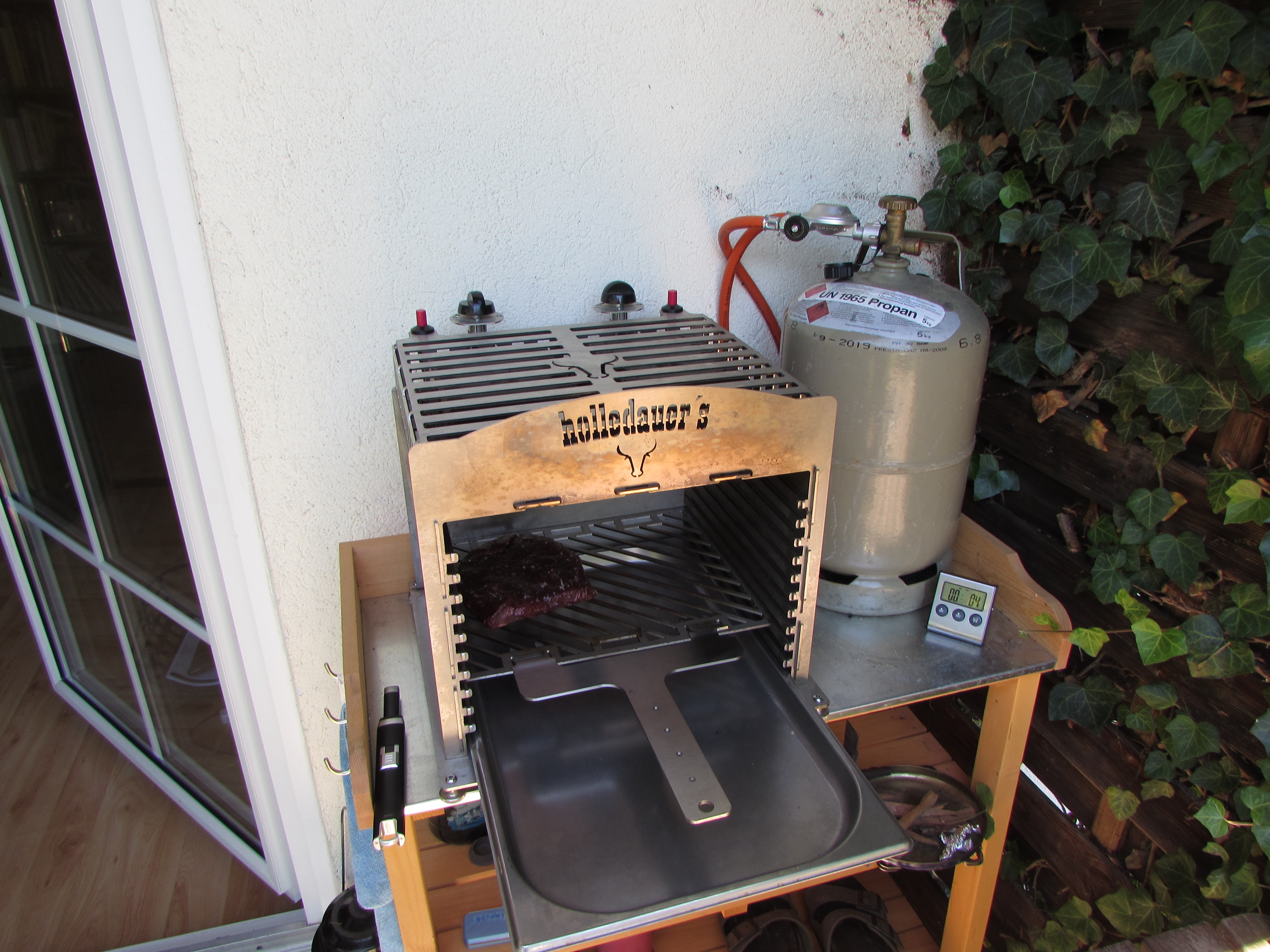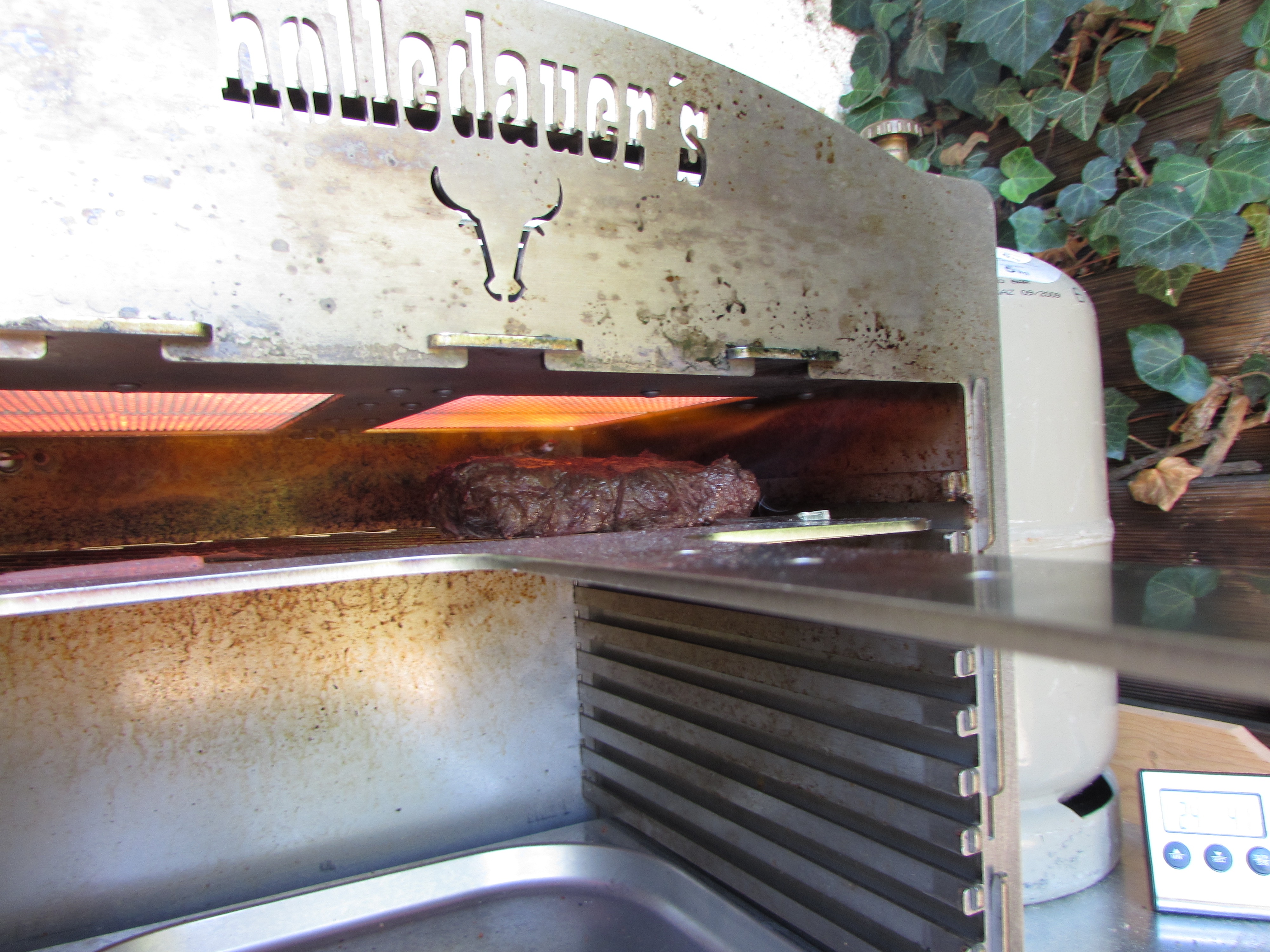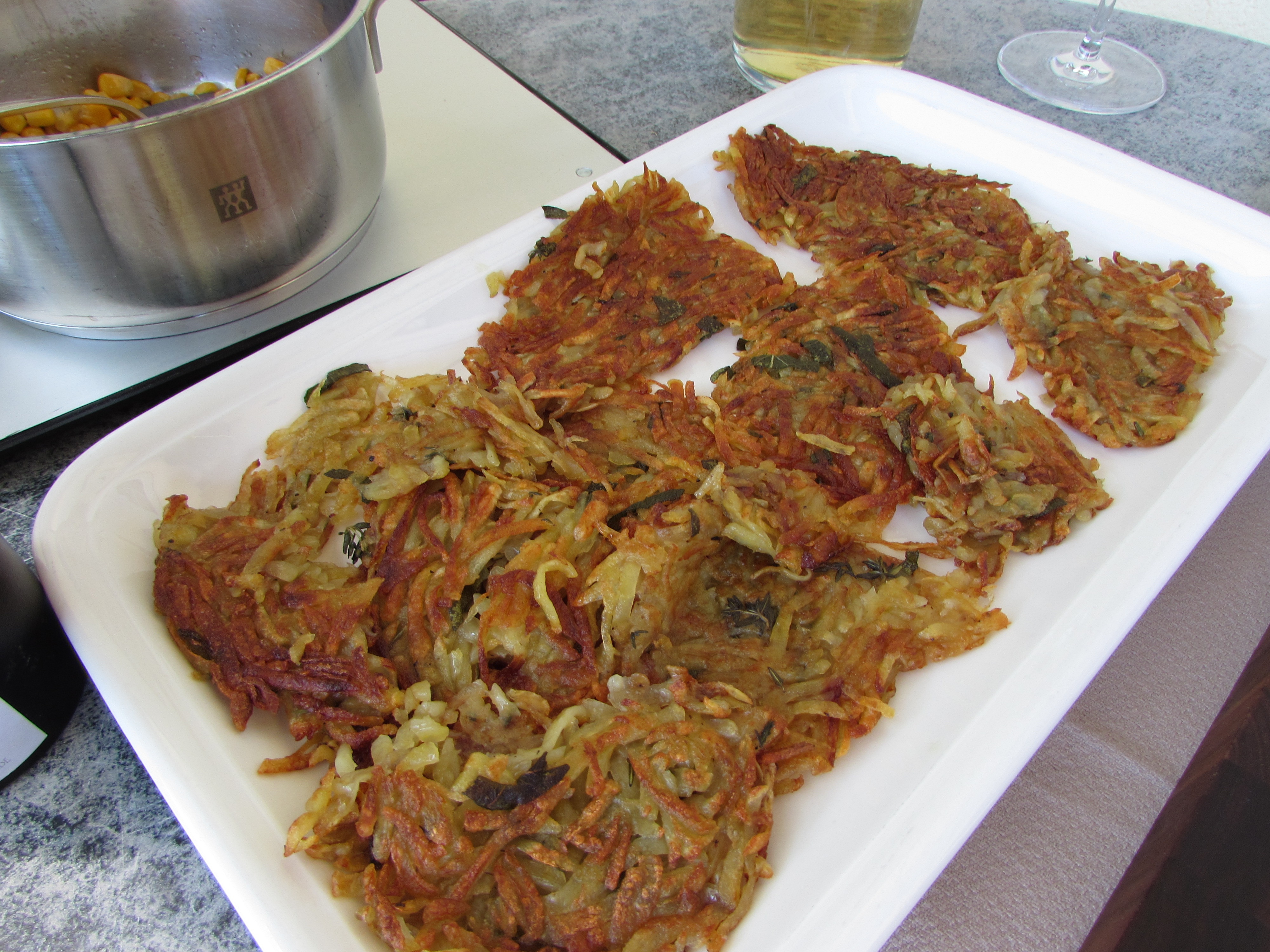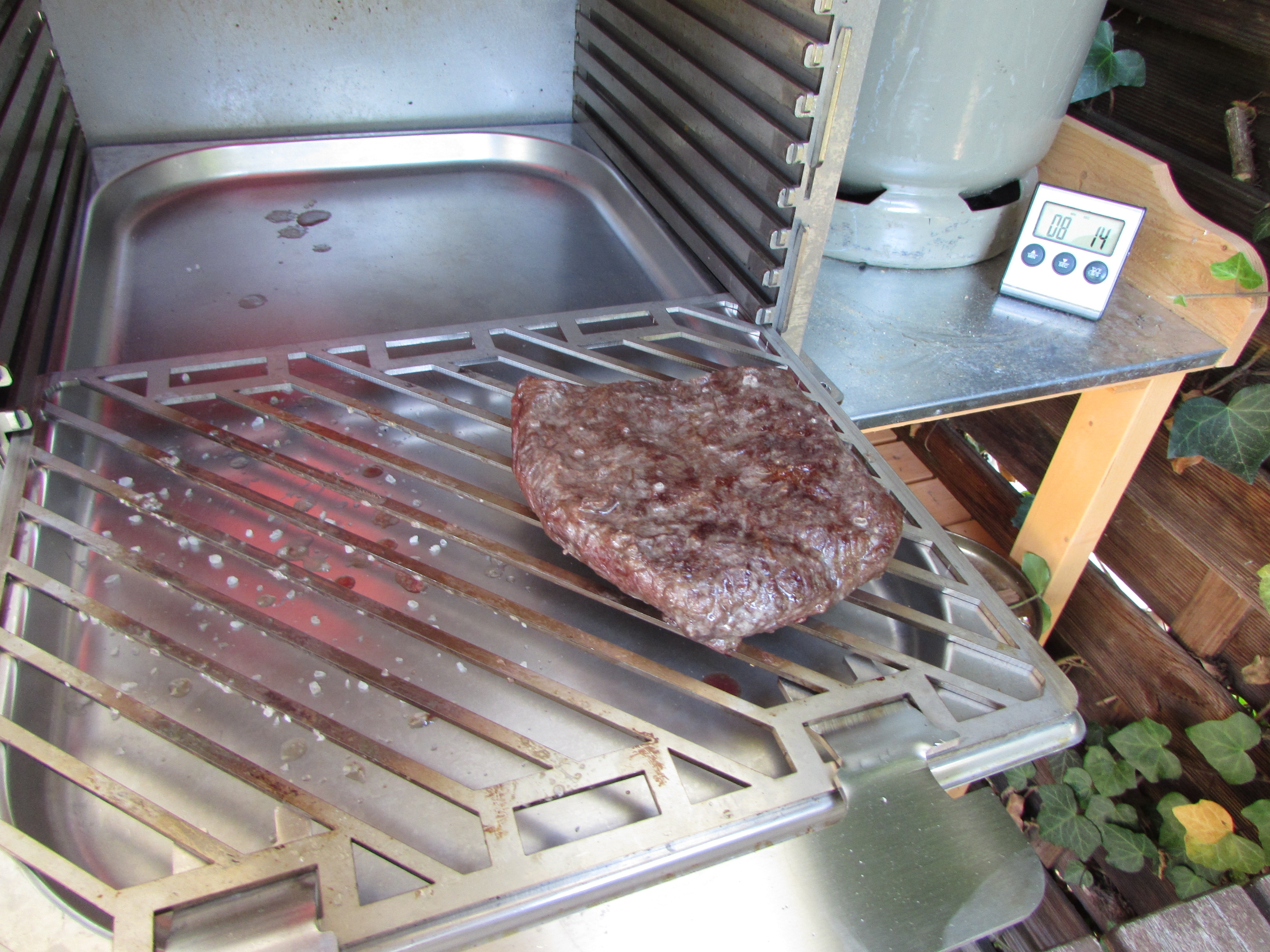 Nur der linke Brenner war aktiv und auf Vollgas Jetzt wurde der rechte Brenner auch aktiviert Beide Brenner auf kleinster Stufe Die Rösti aus der Pfanne Finale Farbgebung