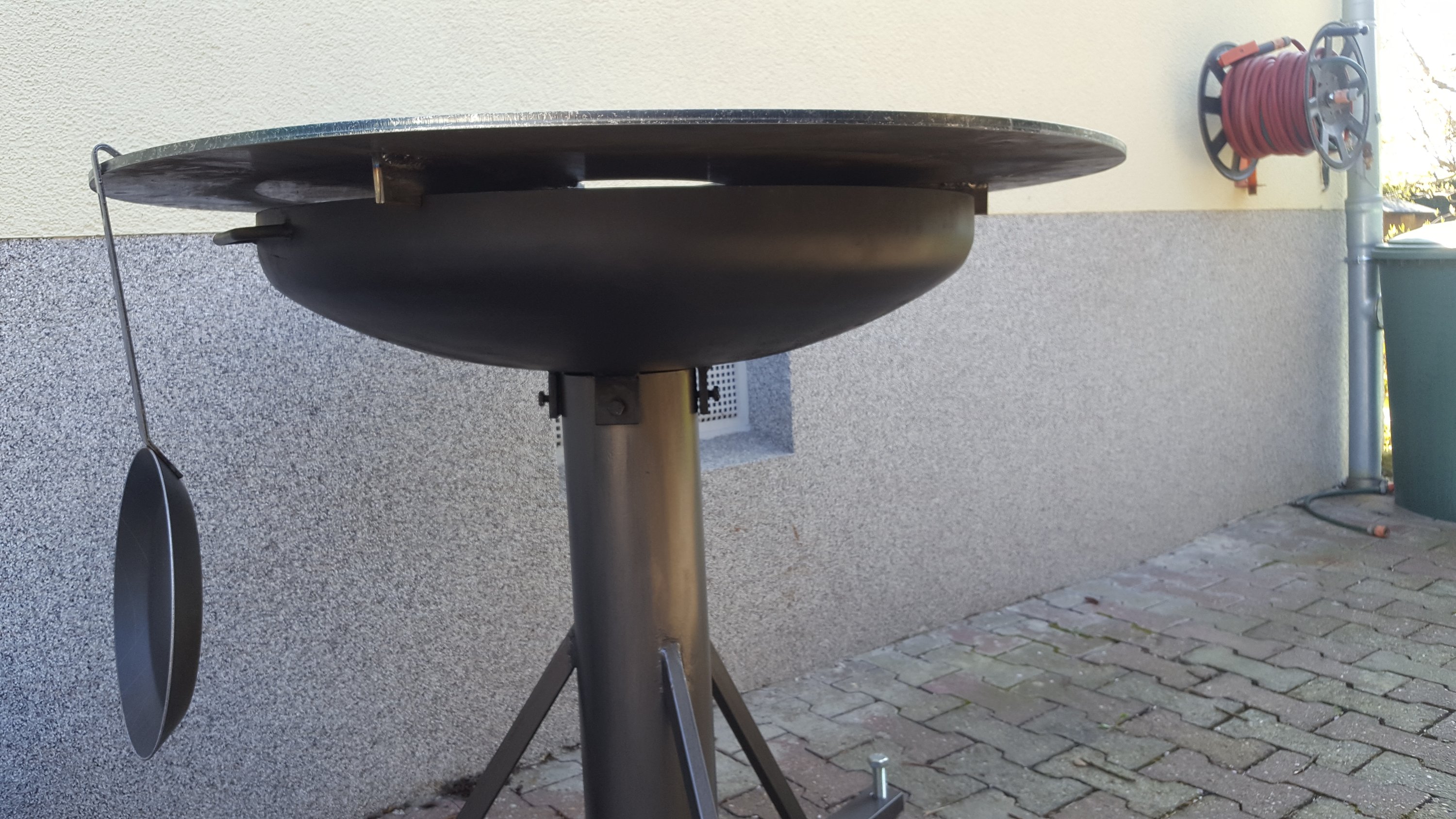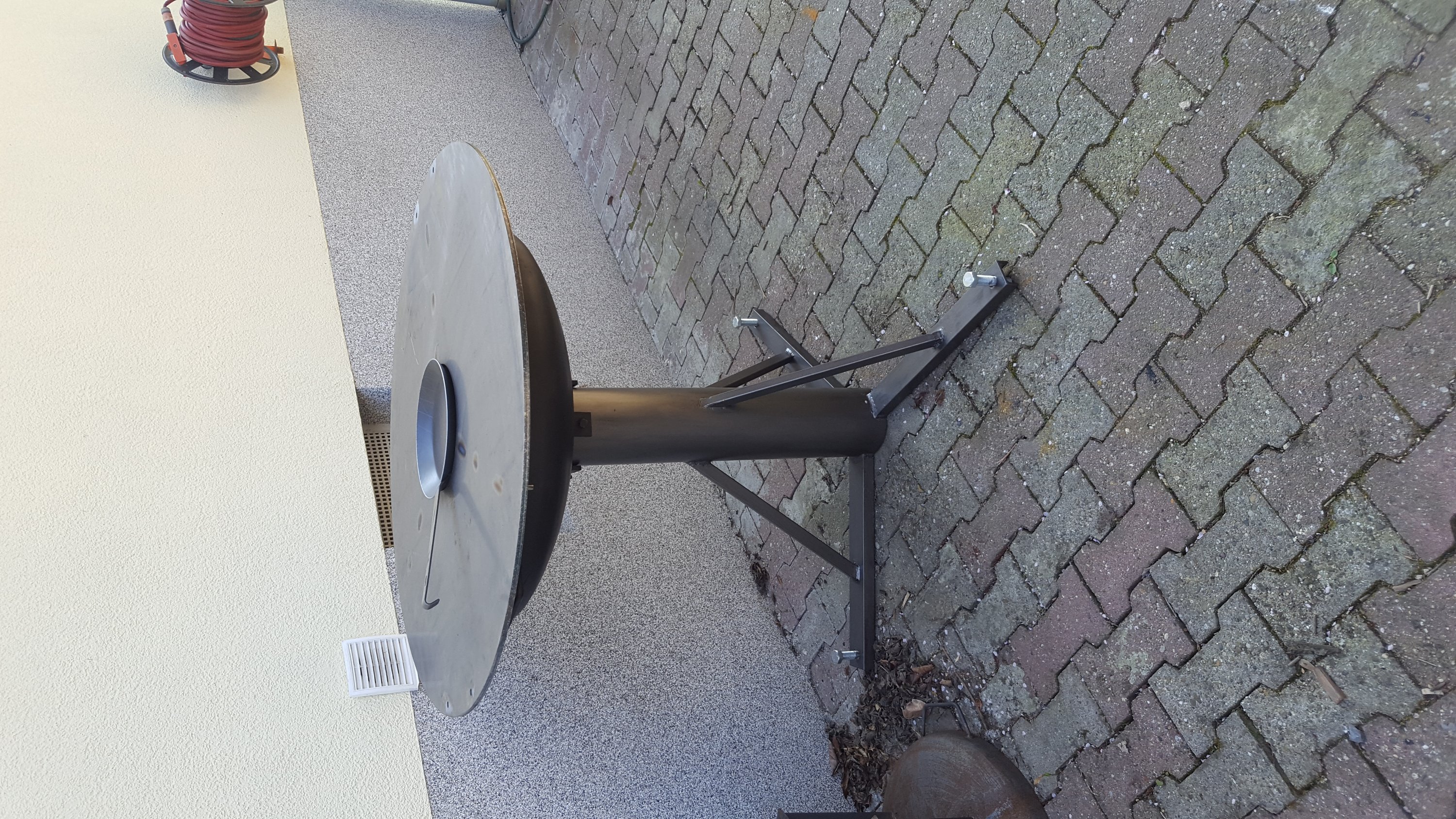 Ich habe einfach 3 Flacheisen 50x6 ( oder 8, müsste ich nachmessen ) hochkant unter die Platte geschweißt und eine kleine Nut zur Fixierung auf der Feuerschale eingeschliffen. Der Unterbau ist beim bauen entstanden, was man halt so noch im Keller an Material hat bzw. in der Firma aus der Schrottkiste mitnehmen kann. Funktioniert aber einwandfrei.