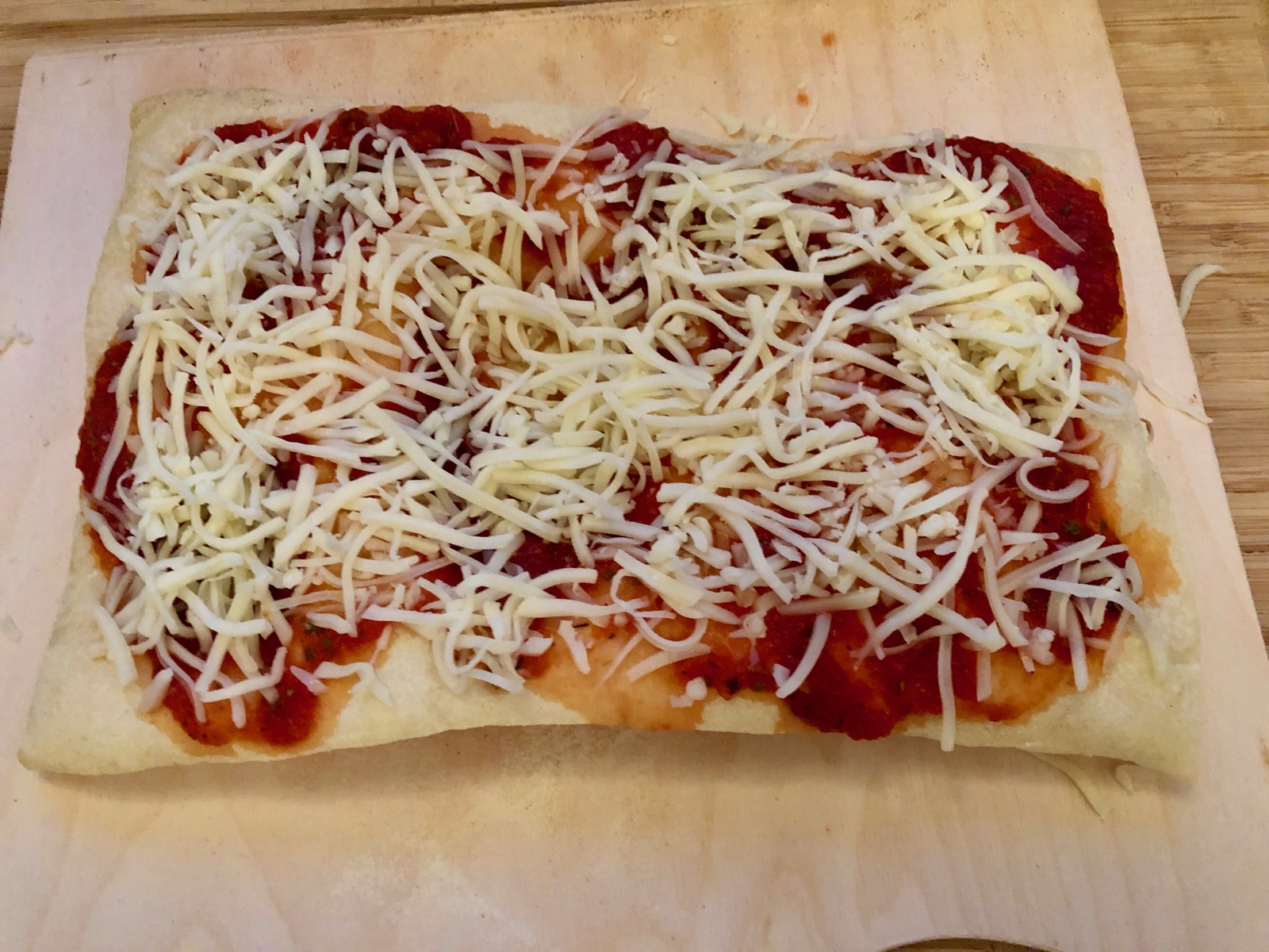 Dann den Teig gewendet und die Seite, welche vorher nach oben zeigte mit Pizzasauce bestrichen: