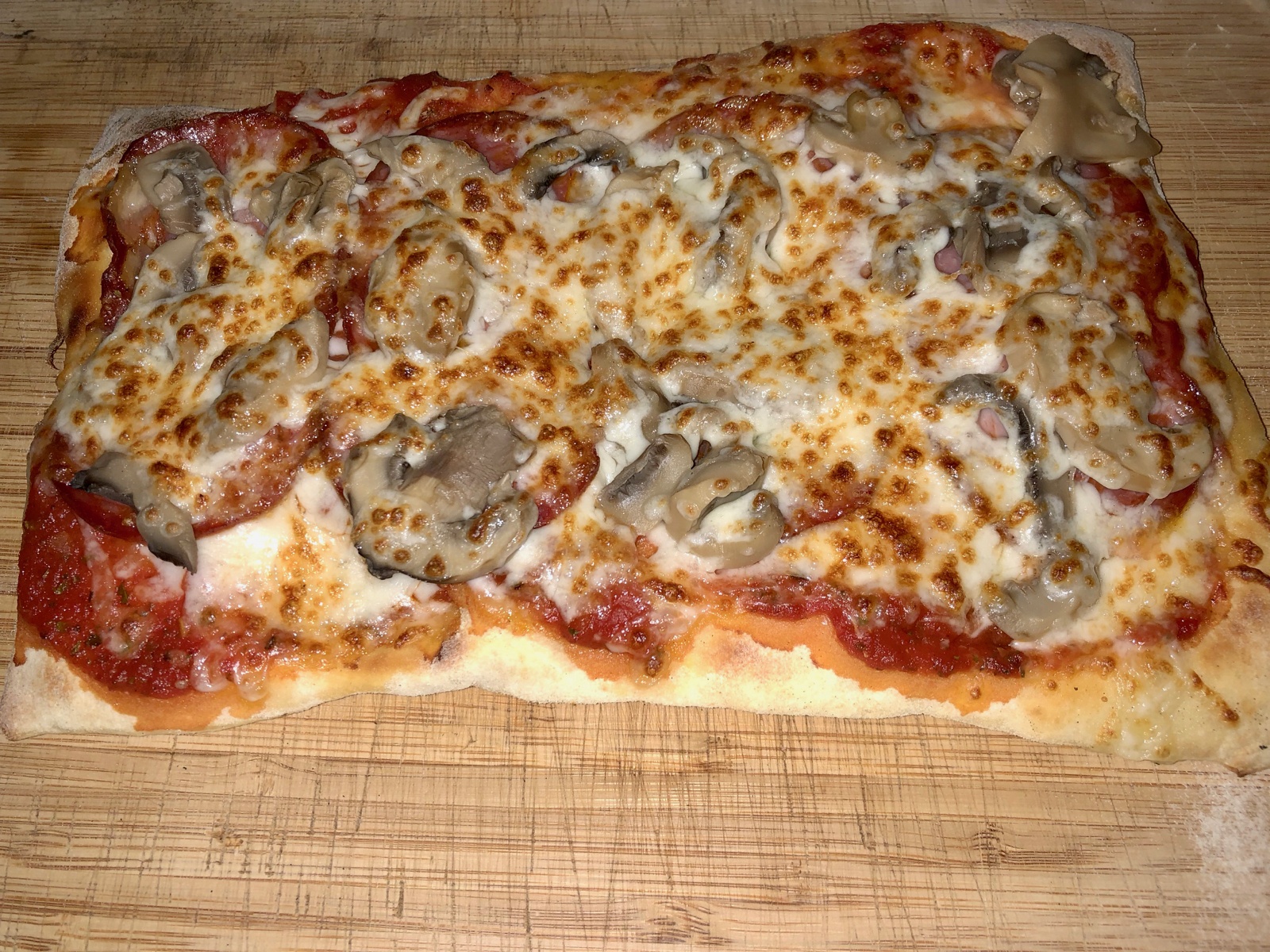 Scharfe kalabresische Salami, Champignons und nochmal geriebener Mozzarella: