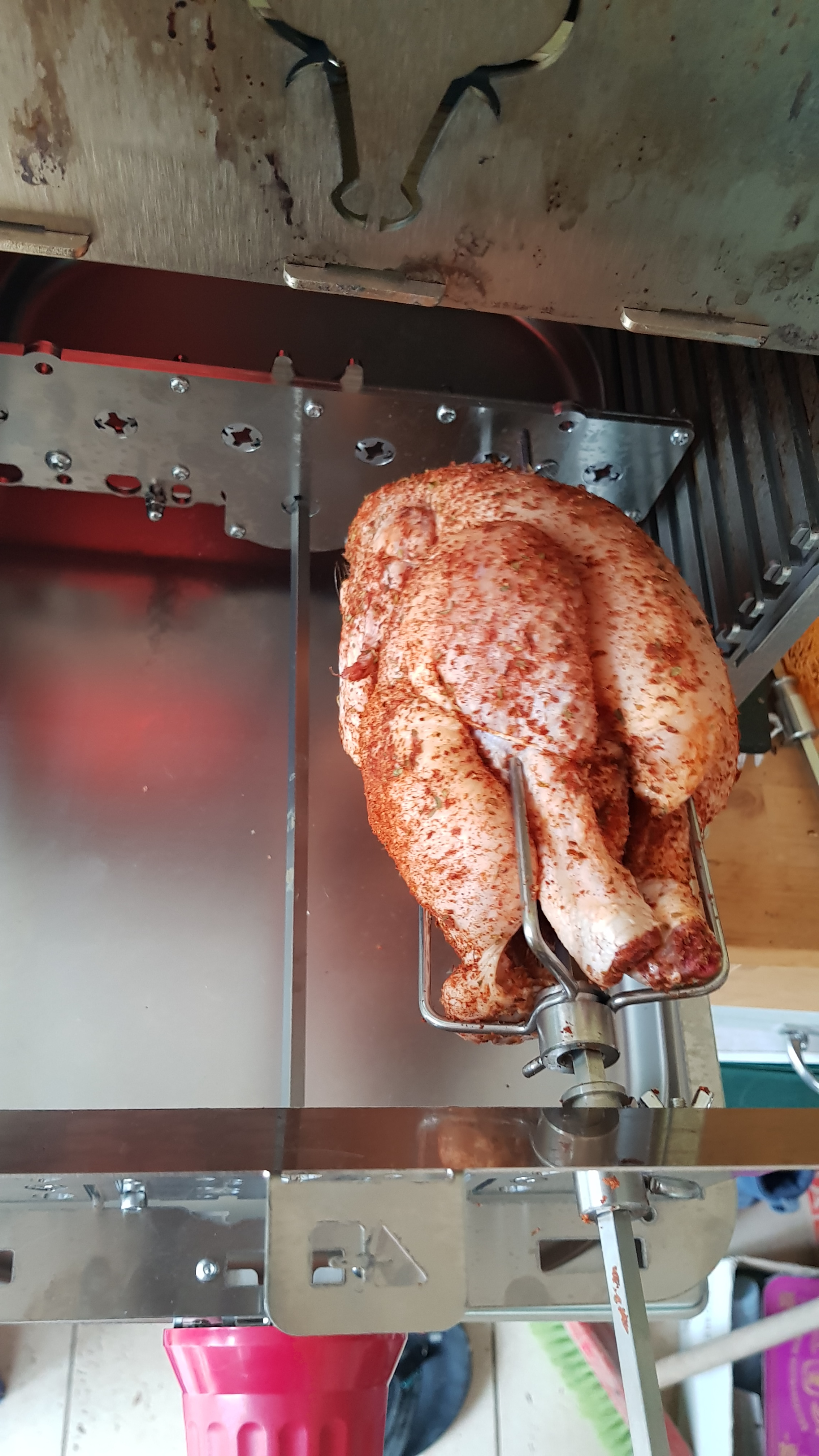 Das fängt mit etwas Eigenarbeit an, d.h. das Huhn einölen, Hähnchen-Rub drauf, zentrisch auf den kurzen Drehspieß hinten fixieren, die abstehende Extremitäten schnüren und in die vorbereitete neue Phönix-/Evo3 Kombi App (Prototyp) einlegen: