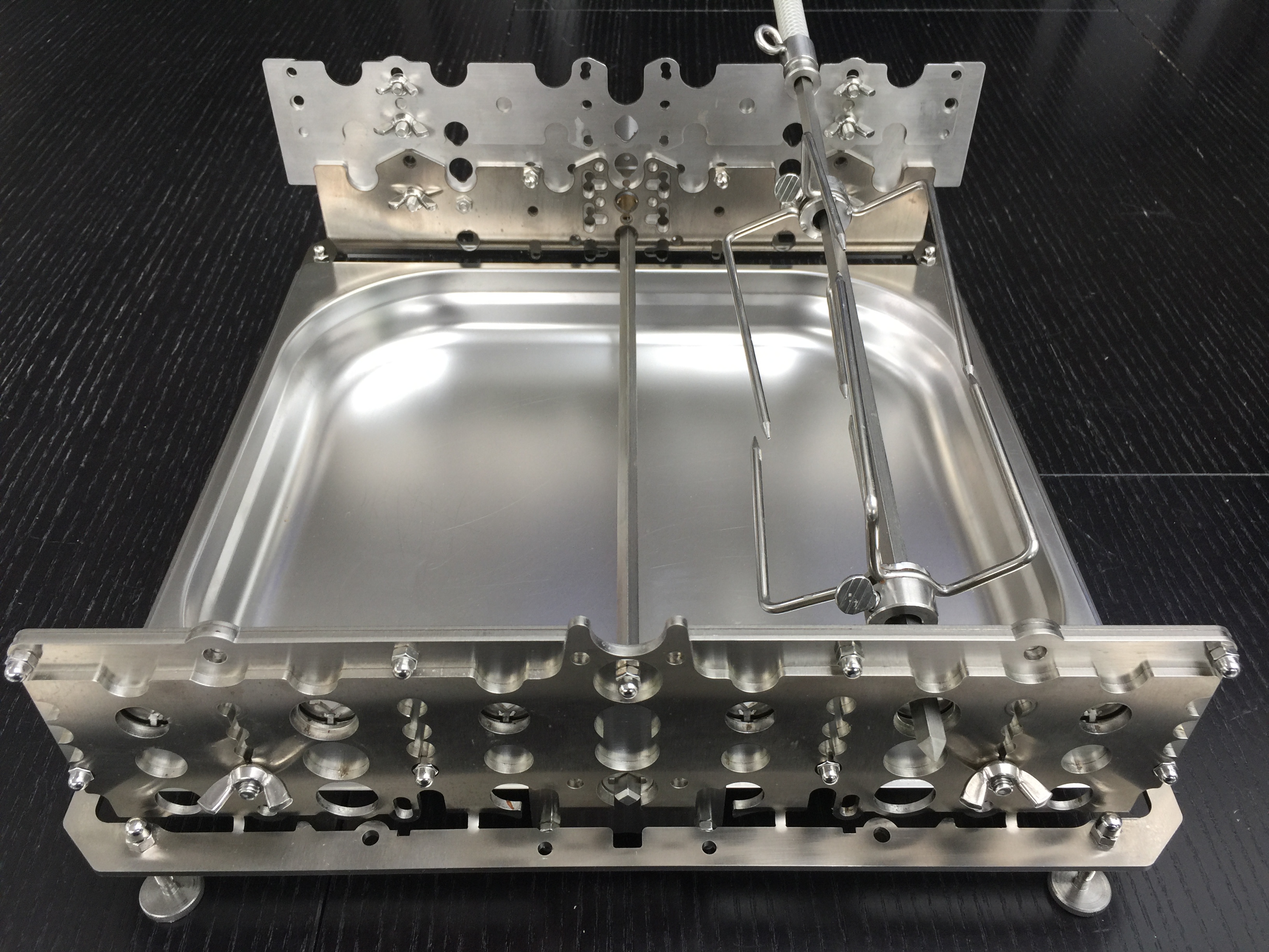 - du könntest mit den beiden auch noch erhältlichen "Tieferlegungssets" (Option K) der "Kombi App" hinten und vorne mit dem Grillgut jeweils weitere 20 mm von den heißen (Schwank-) Brennern wegkommen. Die Antriebswelle verläuft dann unter dem Einschubrahmen aber noch über einer niedrigeren seitlich eingeschobenen GN 2/3-20 mm Schale.