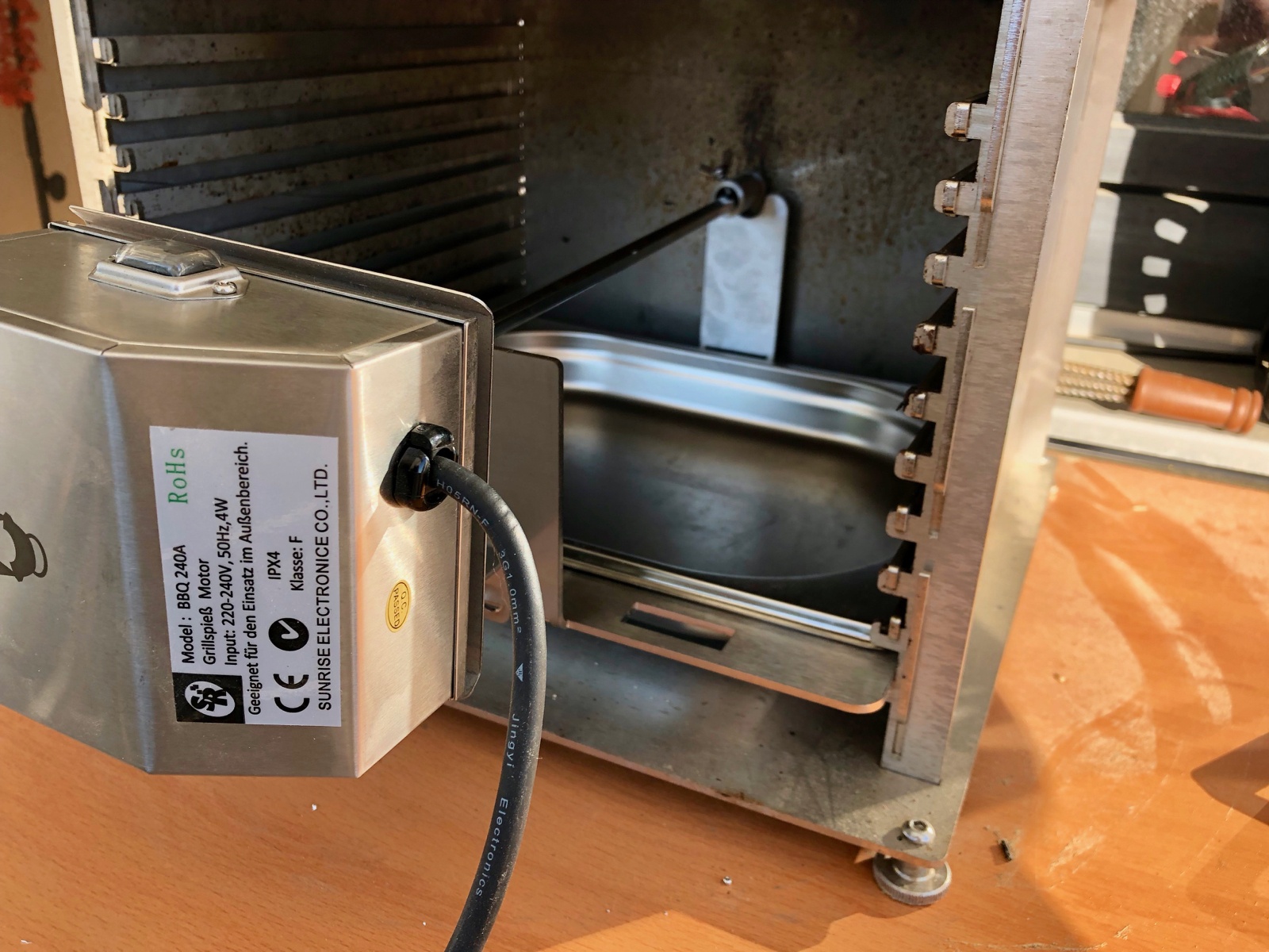 Ich habe erst die Schale mit Spieß in den Grill geschoben, dann von außen den Vierkant aufgesteckt und darauf dem Motor aufgeschoben, der in der passenden Höhe an meinem Holzklotz eingehangen war.