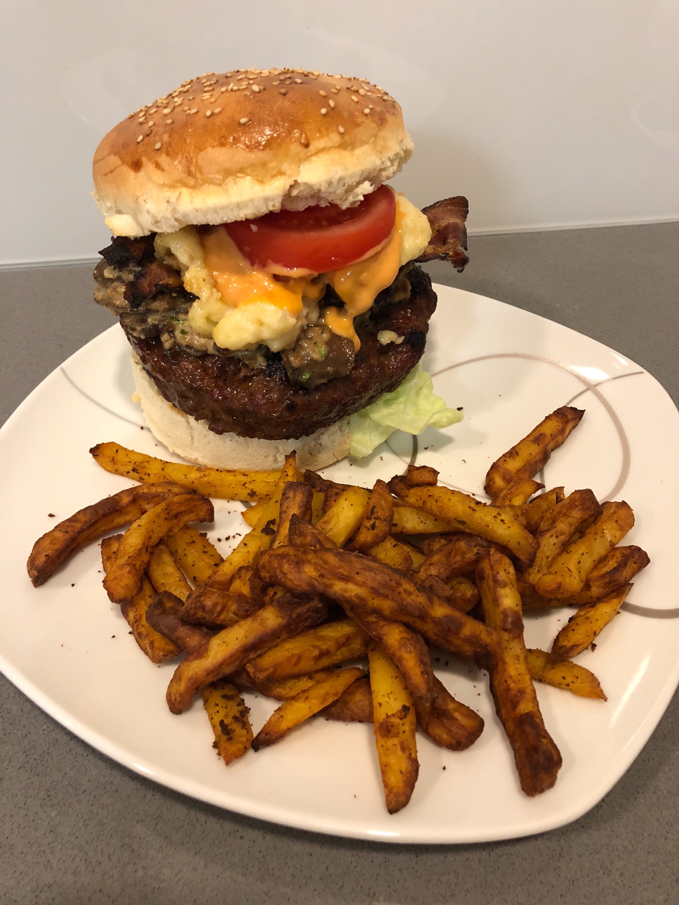 350g Patty und 13cm hoch. Dazu selbst gemachte Pommes! 8-)